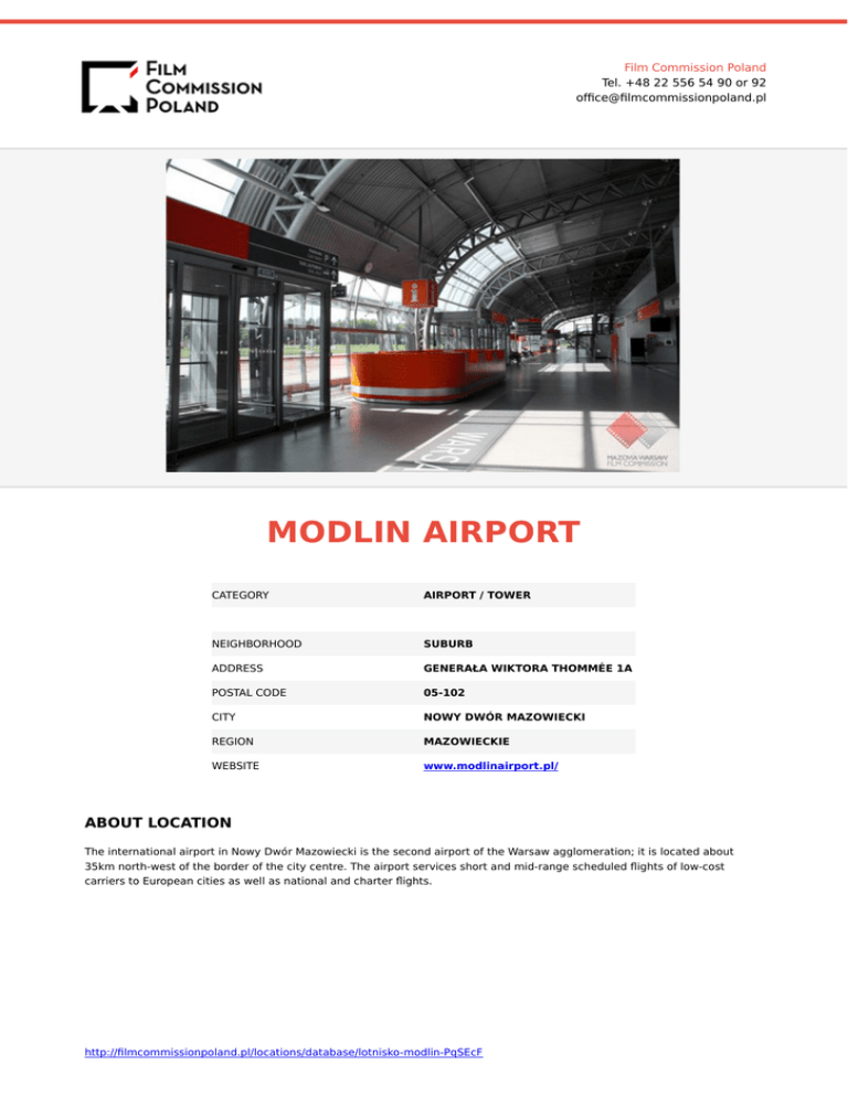 Film Commission Poland Tel. +48 22 556 54 90 or 92 office@filmcommissionpoland.pl MODLIN AIRPORT CATEGORY AIRPORT / TOWER NEIGHBORHOOD SUBURB ADDRESS GENERAŁA WIKTORA THOMMÉE 1A POSTAL CODE 05-102 CITY NOWY DWÓR MAZOWIECKI REGION MAZOWIECKIE WEBSITE www.modlinairport.pl/ ABOUT LOCATION The international airport in Nowy Dwór Mazowiecki is the second airport of the Warsaw agglomeration; it is located about 35km north-west of the border of the city centre. The airport services short and mid-range scheduled flights of low-cost carriers to European cities as well as national and charter flights. http://filmcommissionpoland.pl/locations/database/lotnisko-modlin-PqSEcF