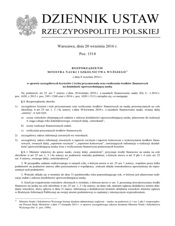 DZIENNIK USTAW RZECZYPOSPOLITEJ POLSKIEJ Warszawa, dnia 20 września 2016 r. Poz. 1514 RO ZPO RZĄDZENIE M INISTRA NAUK I I SZK O LNICTWA WYŻSZEGO 1) z dnia 8 września 2016 r. w sprawie szczegółowych kryteriów i trybu przyznawania oraz rozliczania środków finansowych na działalność upowszechniającą naukę Na podstawie art. 25 ust. 7 ustawy z dnia 30 kwietnia 2010 r. o zasadach finansowania nauki (Dz. U. z 2014 r. poz. 1620, z 2015 r. poz. 249 i 1268 oraz z 2016 r. poz. 1020 i 1311) zarządza się, co następuje: § 1. Rozporządzenie określa: 1) szczegółowe kryteria i tryb przyznawania oraz rozliczania środków finansowych na naukę przeznaczanych na cele określone w art. 25 ust. 1, 3 i 4a ustawy z dnia 30 kwietnia 2010 r. o zasadach finansowania nauki, zwanej dalej „ustawą”, w tym tryb: a) oceny wniosków obejmujących zadania z zakresu działalności upowszechniającej naukę, planowane do realizacji w ciągu całego roku kalendarzowego, zwanych dalej „wnioskami”, b) oceny realizacji finansowanych zadań, c) rozliczania przyznanych środków finansowych; 2) szczegółowy zakres informacji zawartych we wnioskach; 3) szczegółowy zakres informacji zawartych w raporcie rocznym i raporcie końcowym z wykorzystania środków finansowych, zwanych dalej „raportem rocznym” i „raportem końcowym”, zawierających informacje o realizacji działalności upowszechniającej naukę wraz z rozliczeniem finansowym poniesionych kosztów. § 2. 1. Minister właściwy do spraw nauki, zwany dalej „ministrem”, przyznaje środki finansowe na naukę na cele określone w art. 25 ust. 1, 3 i 4a ustawy na podstawie wniosku podmiotu, o którym mowa w art. 9 pkt 1–4 oraz art. 25 ust. 4 ustawy, zwanego dalej „wnioskodawcą”. 2. W przypadku zadania realizowanego w ramach celu, o którym mowa w art. 25 ust. 1 ustawy, wspólnie przez kilka podmiotów na podstawie umowy albo porozumienia o współpracy, wniosek składa wnioskodawca upoważniony do reprezentacji tych podmiotów. 3. Wnioski składa się w terminie do dnia 31 października roku poprzedzającego rok, w którym jest planowana realizacja zadań z zakresu działalności upowszechniającej naukę. 4. Jeżeli po rozpatrzeniu wniosków złożonych w terminie, o którym mowa w ust. 3, pozostaną niewykorzystane środki finansowe na naukę na cele określone w art. 25 ust. 1, 3 i 4a ustawy, na dany rok, minister ogłasza dodatkowy termin składania wniosków, który upływa w dniu 31 marca. Informację o dodatkowym terminie składania wniosków minister ogłasza w Biuletynie Informacji Publicznej na swojej stronie podmiotowej co najmniej z miesięcznym wyprzedzeniem. 1) Minister Nauki i Szkolnictwa Wyższego kieruje działem administracji rządowej – nauka, na podstawie § 1 ust. 2 pkt 1 rozporządzenia Prezesa Rady Ministrów z dnia 17 listopada 2015 r. w sprawie szczegółowego zakresu działania Ministra Nauki i Szkolnictwa Wyższego (Dz. U. poz. 1896). Dziennik Ustaw –2– Poz. 1514 5. Wniosek dotyczący zadania szczególnie ważnego dla realizacji polityki naukowej, naukowo-technicznej lub innowacyjnej państwa może zostać złożony w każdym czasie. 6. We wniosku, o którym mowa w ust. 5, wnioskodawca uzasadnia szczególną rangę zadania. 7. Wnioskodawca może złożyć nie więcej niż jeden wniosek w ramach każdego z celów określonych w art. 25 ust. 3 i 4a ustawy, a w przypadku celu określonego w art. 25 ust. 1 ustawy – nie więcej niż jeden wniosek na zadania realizowane samodzielnie i nie więcej niż jeden wniosek na zadania realizowane zgodnie z ust. 2, w każdym z terminów, o których mowa w ust. 3 i 4. We wniosku wnioskodawca może wystąpić o przyznanie środków finansowych na realizację nie więcej niż 5 zadań. 8. Szczegółowy zakres informacji zawartych we wniosku składanym w ramach celu określonego w art. 25: 1) ust. 1 ustawy stanowi załącznik nr 1 do rozporządzenia; 2) ust. 3 ustawy stanowi załącznik nr 2 do rozporządzenia; 3) ust. 4a ustawy stanowi załącznik nr 3 do rozporządzenia. § 3. 1. Wnioski składa się w systemie teleinformatycznym w rozumieniu art. 3 pkt 3 ustawy z dnia 17 lutego 2005 r. o informatyzacji działalności podmiotów realizujących zadania publiczne (Dz. U. z 2014 r. poz. 1114 oraz z 2016 r. poz. 352), wskazanym w Biuletynie Informacji Publicznej na stronie podmiotowej ministra, zwanym dalej „systemem”, z tym że informacje określone w części A wniosku składa się na elektroniczną skrzynkę podawczą ministra w formie dokumentu elektronicznego opatrzonego kwalifikowanym podpisem elektronicznym albo podpisem potwierdzonym profilem zaufanym ePUAP. 2. Do informacji określonych w części A wniosku dołącza się oświadczenia o: 1) zgodności ze stanem faktycznym i prawnym informacji zawartych we wniosku złożonym w systemie; 2) wyrażeniu zgody na przesyłanie korespondencji za pomocą środków komunikacji elektronicznej w rozumieniu art. 2 pkt 5 ustawy z dnia 18 lipca 2002 r. o świadczeniu usług drogą elektroniczną (Dz. U. z 2016 r. poz. 1030); 3) otrzymywaniu albo nieotrzymywaniu przez wnioskodawcę dotacji na działalność statutową; 4) wykonywaniu w sposób ciągły zadań z zakresu upowszechniania nauki oraz o prowadzeniu prac na rzecz promocji i popularyzacji wyników badań naukowych – w przypadku wniosku składanego w ramach celu określonego w art. 25 ust. 1 ustawy; 5) posiadaniu statusu wydawcy czasopism – w przypadku wniosku składanego w ramach celu określonego w art. 25 ust. 4a ustawy. § 4. Do rozpatrzenia są kierowane wyłącznie wnioski kompletne, spełniające wymagania formalne określone w rozporządzeniu. W przypadku złożenia wniosku niespełniającego wymagań formalnych wzywa się wnioskodawcę, za pośrednictwem systemu, do usunięcia braków w terminie 7 dni od dnia otrzymania wezwania, z pouczeniem, że ich nieusunięcie w tym terminie spowoduje pozostawienie wniosku bez rozpoznania. § 5. 1. Wnios