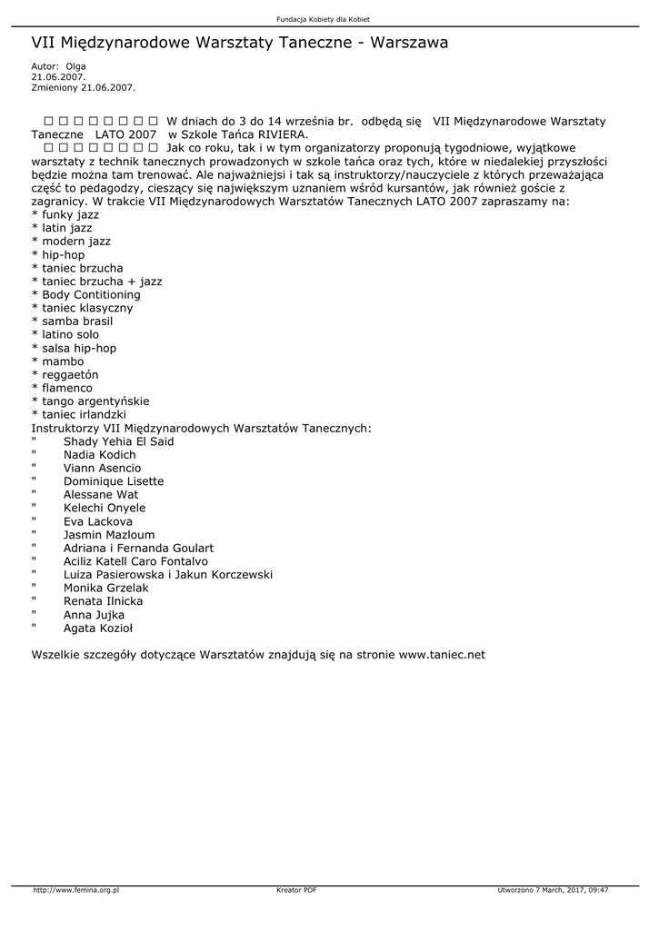 Fundacja Kobiety dla Kobiet VII Międzynarodowe Warsztaty Taneczne - Warszawa Autor: Olga 21.06.2007. Zmieniony 21.06.2007. W dniach do 3 do 14 września br. odbędą się VII Międzynarodowe Warsztaty Taneczne LATO 2007 w Szkole Tańca RIVIERA. Jak co roku, tak i w tym organizatorzy proponują tygodniowe, wyjątkowe warsztaty z technik tanecznych prowadzonych w szkole tańca oraz tych, które w niedalekiej przyszłości będzie można tam trenować. Ale najważniejsi i tak są instruktorzy/nauczyciele z których przeważająca część to pedagodzy, cieszący się największym uznaniem wśród kursantów, jak również goście z zagranicy. W trakcie VII Międzynarodowych Warsztatów Tanecznych LATO 2007 zapraszamy na: * funky jazz * latin jazz * modern jazz * hip-hop * taniec brzucha * taniec brzucha + jazz * Body Contitioning * taniec klasyczny * samba brasil * latino solo * salsa hip-hop * mambo * reggaetón * flamenco * tango argentyńskie * taniec irlandzki Instruktorzy VII Międzynarodowych Warsztatów Tanecznych: " Shady Yehia El Said " Nadia Kodich " Viann Asencio " Dominique Lisette " Alessane Wat " Kelechi Onyele " Eva Lackova " Jasmin Mazloum " Adriana i Fernanda Goulart " Aciliz Katell Caro Fontalvo " Luiza Pasierowska i Jakun Korczewski " Monika Grzelak " Renata Ilnicka " Anna Jujka " Agata Kozioł Wszelkie szczegóły dotyczące Warsztatów znajdują się na stronie www.taniec.net http://www.femina.org.pl Kreator PDF Utworzono 7 March, 2017, 09:47