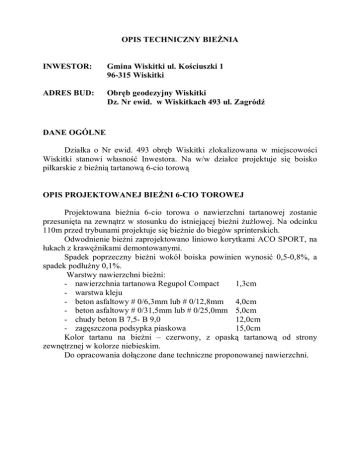 OPIS TECHNICZNY BIEŻNIA INWESTOR: Gmina Wiskitki ul. Kościuszki 1 96-315 Wiskitki ADRES BUD: Obręb geodezyjny Wiskitki Dz. Nr ewid. w Wiskitkach 493 ul. Zagródź DANE OGÓLNE Działka o Nr ewid. 493 obręb Wiskitki zlokalizowana w miejscowości Wiskitki stanowi własność Inwestora. Na w/w działce projektuje się boisko piłkarskie z bieżnią tartanową 6-cio torową OPIS PROJEKTOWANEJ BIEŻNI 6-CIO TOROWEJ Projektowana bieżnia 6-cio torowa o nawierzchni tartanowej zostanie przesunięta na zewnątrz w stosunku do istniejącej bieżni żużlowej. Na odcinku 110m przed trybunami projektuje się bieżnie do biegów sprinterskich. Odwodnienie bieżni zaprojektowano liniowo korytkami ACO SPORT, na łukach z krawężnikami demontowanymi. Spadek poprzeczny bieżni wokół boiska powinien wynosić 0,5-0,8%, a spadek podłużny 0,1%. Warstwy nawierzchni bieżni: - nawierzchnia tartanowa Regupol Compact 1,3cm - warstwa kleju - beton asfaltowy # 0/6,3mm lub # 0/12,8mm 4,0cm - beton asfaltowy # 0/31,5mm lub # 0/25,0mm 5,0cm - chudy beton B 7,5- B 9,0 12,0cm - zagęszczona podsypka piaskowa 15,0cm Kolor tartanu na bieżni – czerwony, z opaską tartanową od strony zewnętrznej w kolorze niebieskim. Do opracowania dołączone dane techniczne proponowanej nawierzchni.