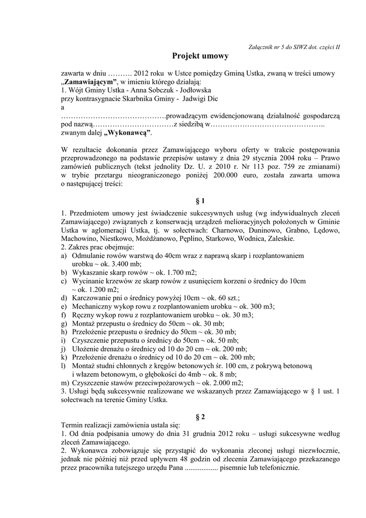 Załącznik nr 5 do SIWZ dot. części II Projekt umowy zawarta w dniu ………. 2012 roku w Ustce pomiędzy Gminą Ustka, zwaną w treści umowy „Zamawiającym”, w imieniu którego działają: 1. Wójt Gminy Ustka - Anna Sobczuk - Jodłowska przy kontrasygnacie Skarbnika Gminy - Jadwigi Dic a …………………………………….prowadzącym ewidencjonowaną działalność gospodarczą pod nazwą……………………………z siedzibą w……………………………………….. zwanym dalej „Wykonawcą”. W rezultacie dokonania przez Zamawiającego wyboru przeprowadzonego na podstawie przepisów ustawy z dnia zamówień publicznych (tekst jednolity Dz. U. z 2010 r. w trybie przetargu nieograniczonego poniŜej 200.000 o następującej treści: oferty w trakcie postępowania 29 stycznia 2004 roku – Prawo Nr 113 poz. 759 ze zmianami) euro, została zawarta umowa §1 1. Przedmiotem umowy jest świadczenie sukcesywnych usług (wg indywidualnych zleceń Zamawiającego) związanych z konserwacją urządzeń melioracyjnych połoŜonych w Gminie Ustka w aglomeracji Ustka, tj. w sołectwach: Charnowo, Duninowo, Grabno, Lędowo, Machowino, Niestkowo, MoŜdŜanowo, Pęplino, Starkowo, Wodnica, Zaleskie. 2. Zakres prac obejmuje: a) Odmulanie rowów warstwą do 40cm wraz z naprawą skarp i rozplantowaniem urobku ~ ok. 3.400 mb; b) Wykaszanie skarp rowów ~ ok. 1.700 m2; c) Wycinanie krzewów ze skarp rowów z usunięciem korzeni o średnicy do 10cm ~ ok. 1.200 m2; d) Karczowanie pni o średnicy powyŜej 10cm ~ ok. 60 szt.; e) Mechaniczny wykop rowu z rozplantowaniem urobku ~ ok. 300 m3; f) Ręczny wykop rowu z rozplantowaniem urobku ~ ok. 30 m3; g) MontaŜ przepustu o średnicy do 50cm ~ ok. 30 mb; h) PrzełoŜenie przepustu o średnicy do 50cm ~ ok. 30 mb; i) Czyszczenie przepustu o średnicy do 50cm ~ ok. 50 mb; j) UłoŜenie drenaŜu o średnicy od 10 do 20 cm ~ ok. 200 mb; k) PrzełoŜenie drenaŜu o średnicy od 10 do 20 cm ~ ok. 200 mb; l) MontaŜ studni chłonnych z kręgów betonowych śr. 100 cm, z pokrywą betonową i włazem betonowym, o głębokości do 4mb ~ ok. 8 mb; m) Czyszczenie stawów przeciwpoŜarowych ~ ok. 2.000 m2; 3. Usługi będą sukcesywnie realizowane we wskazanych przez Zamawiającego w § 1 ust. 1 sołectwach na terenie Gminy Ustka. §2 Termin realizacji zamówienia ustala się: 1. Od dnia podpisania umowy do dnia 31 grudnia 2012 roku – usługi sukcesywne według zleceń Zamawiającego. 2. Wykonawca zobowiązuje się przystąpić do wykonania zleconej usługi niezwłocznie, jednak nie później niŜ przed upływem 48 godzin od zlecenia Zamawiającego przekazanego przez pracownika tutejszego urzędu Pana .................. pisemnie lub telefonicznie. 3. Termin zakończenia danego zlecenia (danej usługi) Zamawiający określi kaŜdorazowo w zleceniu, o którym mowa w ustępie 2 niniejszego paragrafu. 4. Rozliczenie z wykonanych prac wymienionych w § 1 ust. 2 musi być kaŜdorazowo poświadczone przez pracownika urzędu Pana ............................................ 5. Rozliczenie z wykonanych prac wymienionych w § 1 ust. 2 lit. a, b, c, d, e, f, i, m musi być dodatkowo potwierdzone przez sołtysa danego sołectwa. §3 Wykonawca oświadcza, Ŝe zapoznał się z warunkami realizacji przedmiotu umowy zawartymi w Specyfikacji Istotnych Warunków Zamówienia i przyjmuje zamówienie do realizacji bez zastrzeŜeń. §4 1. Strony ustalają, Ŝe obowiązującą formą wynagrodzenia będzie wynagrodzenie za kaŜdą usługę obliczone wg wybranej w wyniku przetargu oferty w wysokości: 1) Odmulanie rowów warstwą do 40cm wraz z naprawą skarp i rozplantowaniem urobku a) Wartość brutto:……………............. zł / mb słownie:……………………………. / mb b) kwota netto (bez podatku VAT):……………............ zł / mb c) podatek VAT (23%): ........................... 2) Wykaszanie skarp rowów a) Wartość brutto:……………............. zł / m2 słownie:……………………………. / m2 b) kwota netto (bez podatku VAT):……………............ zł / m2 c) podatek VAT (23%): ........................... 3) Wycinanie krzewów ze skarp rowów z usunięciem korzeni o śr. do 10cm a) Wartość brutto:……………............. zł / m2 słownie:……………………………. / m2 b) kwota netto (bez podatku VAT):……………............ zł / m2 c) podatek VAT (23%): ........................... 4) Karczowanie pni o śr. powyŜej 10cm a) Wartość brutto:……………............. zł / szt. słownie:……………………………. / szt. b) kwota netto (bez podatku VAT):……………............ zł / szt. c) podatek VAT (23%): ........................... 5) Mechaniczny wykop rowu z rozplantowaniem urobku a) Wartość brutto:……………............. zł / m3 słownie:……………………………. / m3 b) kwota netto (bez podatku VAT):……………............ zł / m3 c) podatek VAT (23%): ........................... 6) Ręczny wykop rowu z rozplantowaniem urobku a) Wartość brutto:……………............. zł / m3 słownie:……………………………. / m3 b) kwota netto (bez podatku VAT):……………............ zł / m3 c) podatek VAT (23%): ........................... 7) MontaŜ przepustu o średnicy do 50cm a) Wartość brutto:……………............. zł / mb słownie:……………………………. / mb b) kwota netto (bez podatku VAT):……………............ zł / mb c) podatek VAT (23%): ........................... 8) PrzełoŜenie przepustu o średnicy do 50cm a) Wartość brutto:……………............. zł / mb słownie:……………………………. / mb b) kwota netto (bez podatku VAT):……………............ zł / mb c) podatek VAT (23%): ........................... 9) Czyszczenie przepustu o średnicy do 50cm a) Wartość brutto:……………............. zł / mb słownie:……………………………. / mb b) kwota netto (bez poda