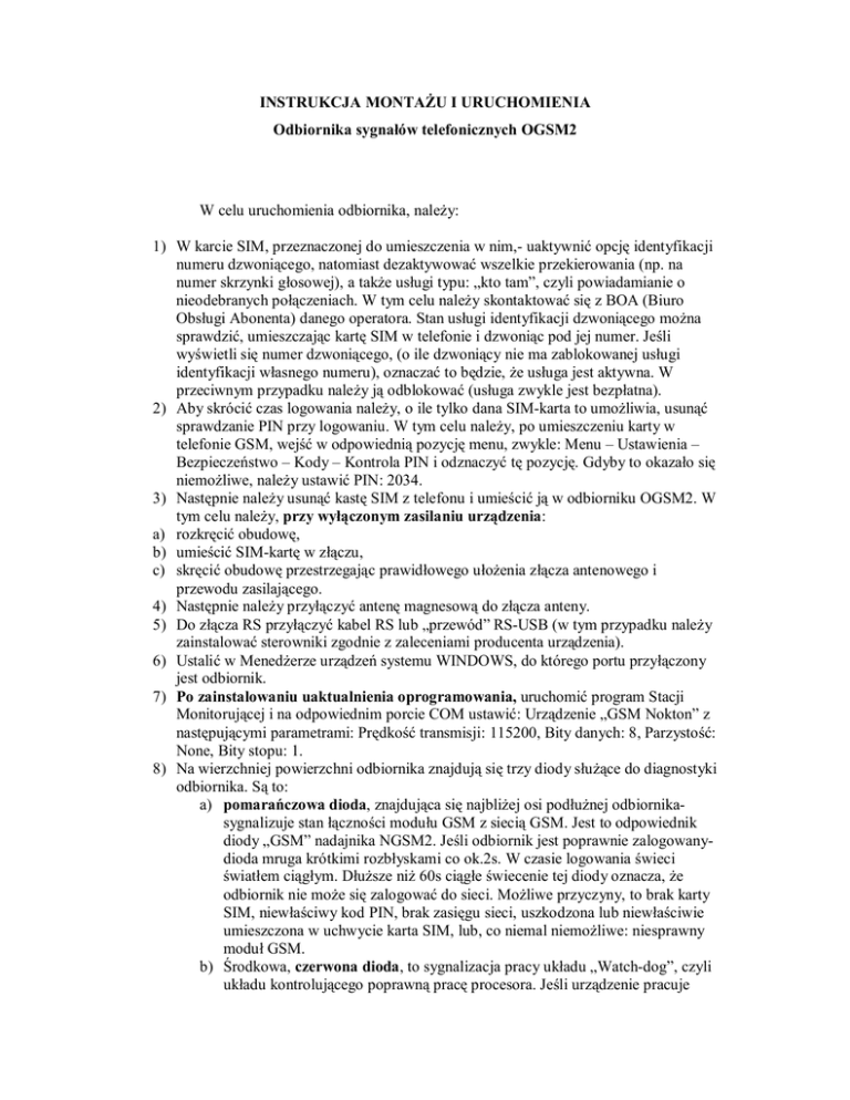 INSTRUKCJA MONTAŻU I URUCHOMIENIA Odbiornika sygnałów telefonicznych OGSM2 W celu uruchomienia odbiornika, należy: 1) W karcie SIM, przeznaczonej do umieszczenia w nim,- uaktywnić opcję identyfikacji numeru dzwoniącego, natomiast dezaktywować wszelkie przekierowania (np. na numer skrzynki głosowej), a także usługi typu: „kto tam”, czyli powiadamianie o nieodebranych połączeniach. W tym celu należy skontaktować się z BOA (Biuro Obsługi Abonenta) danego operatora. Stan usługi identyfikacji dzwoniącego można sprawdzić, umieszczając kartę SIM w telefonie i dzwoniąc pod jej numer. Jeśli wyświetli się numer dzwoniącego, (o ile dzwoniący nie ma zablokowanej usługi identyfikacji własnego numeru), oznaczać to będzie, że usługa jest aktywna. W przeciwnym przypadku należy ją odblokować (usługa zwykle jest bezpłatna). 2) Aby skrócić czas logowania należy, o ile tylko dana SIM-karta to umożliwia, usunąć sprawdzanie PIN przy logowaniu. W tym celu należy, po umieszczeniu karty w telefonie GSM, wejść w odpowiednią pozycję menu, zwykle: Menu – Ustawienia – Bezpieczeństwo – Kody – Kontrola PIN i odznaczyć tę pozycję. Gdyby to okazało się niemożliwe, należy ustawić PIN: 2034. 3) Następnie należy usunąć kastę SIM z telefonu i umieścić ją w odbiorniku OGSM2. W tym celu należy, przy wyłączonym zasilaniu urządzenia: a) rozkręcić obudowę, b) umieścić SIM-kartę w złączu, c) skręcić obudowę przestrzegając prawidłowego ułożenia złącza antenowego i przewodu zasilającego. 4) Następnie należy przyłączyć antenę magnesową do złącza anteny. 5) Do złącza RS przyłączyć kabel RS lub „przewód” RS-USB (w tym przypadku należy zainstalować sterowniki zgodnie z zaleceniami producenta urządzenia). 6) Ustalić w Menedżerze urządzeń systemu WINDOWS, do którego portu przyłączony jest odbiornik. 7) Po zainstalowaniu uaktualnienia oprogramowania, uruchomić program Stacji Monitorującej i na odpowiednim porcie COM ustawić: Urządzenie „GSM Nokton” z następującymi parametrami: Prędkość transmisji: 115200, Bity danych: 8, Parzystość: None, Bity stopu: 1. 8) Na wierzchniej powierzchni odbiornika znajdują się trzy diody służące do diagnostyki odbiornika. Są to: a) pomarańczowa dioda, znajdująca się najbliżej osi podłużnej odbiornikasygnalizuje stan łączności modułu GSM z siecią GSM. Jest to odpowiednik diody „GSM” nadajnika NGSM2. Jeśli odbiornik jest poprawnie zalogowanydioda mruga krótkimi rozbłyskami co ok.2s. W czasie logowania świeci światłem ciągłym. Dłuższe niż 60s ciągłe świecenie tej diody oznacza, że odbiornik nie może się zalogować do sieci. Możliwe przyczyny, to brak karty SIM, niewłaściwy kod PIN, brak zasięgu sieci, uszkodzona lub niewłaściwie umieszczona w uchwycie karta SIM, lub, co niemal niemożliwe: niesprawny moduł GSM. b) Środkowa, czerwona dioda, to sygnalizacja pracy układu „Watch-dog”, czyli układu kontrolującego poprawną pracę procesora. Jeśli urządzenie pracuje poprawnie-dioda mruga miarowo dwa razy na sekundę. Jeśli jest inaczej- układ nie pracuje poprawnie. Przykładowo: dłuższe przerywane świecenie oznacza, że procesor jest repetowany. c) Zielona dioda służy do diagnozowania łączności urządzenia z portem RS komputera. W czasie poprawnej pracy rozbłyskuje co klika sekund, gdy urządzenia kontaktują się ze sobą (komputer z procesorem). 9) Przystosowanie programu stacji monitorującej do obsługi odbiornika OGSM-2 jest opisane w materiałach dostarczonych wraz ze zmodyfikowanym oprogramowaniem. Życzymy zadowolenia z zakupionego urządzenia i jego bezawaryjnej pracy. Dołożyliśmy wszelkich starań, aby tak się stało. Tym niemniej w przypadku pytań i wątpliwości, bądź awarii prosimy o kontakt: W sprawie sprzętu: NOKTON, tel: 42/250 62 51, w godz.: 8-16, pn-pt. W sprawie oprogramowania: ZL, tel.: 42/677 92 92.
