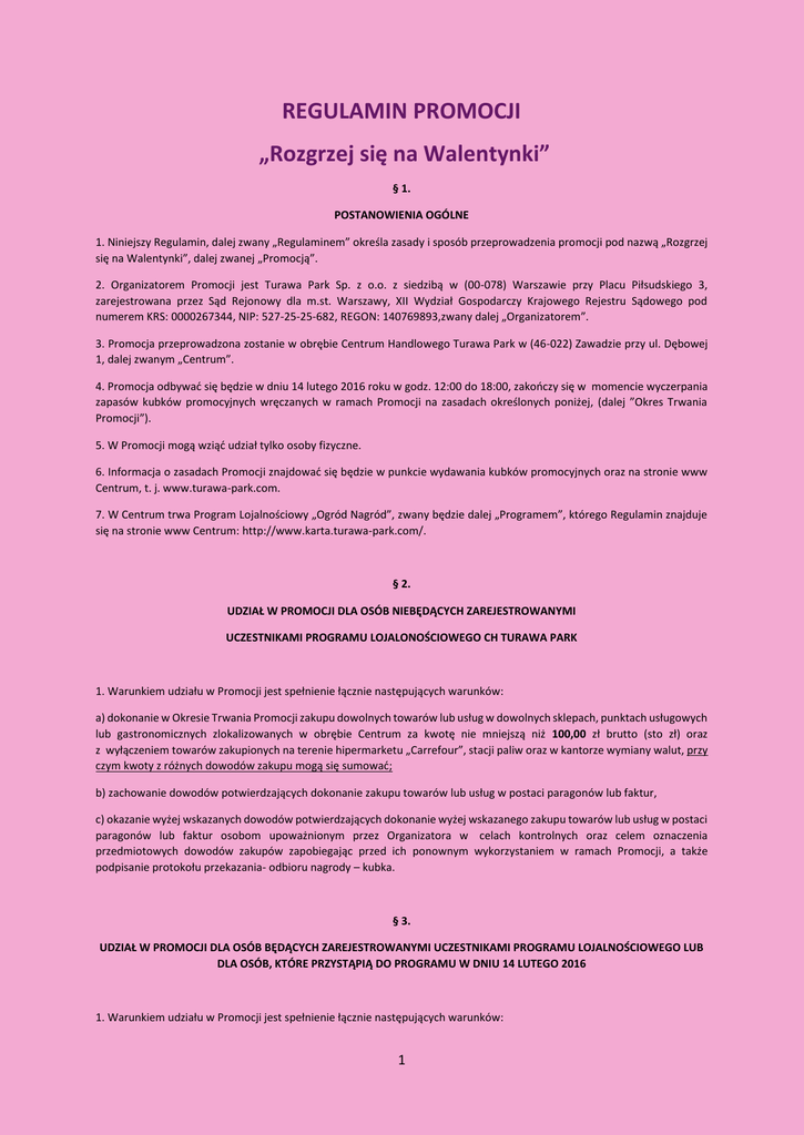 REGULAMIN PROMOCJI „Rozgrzej się na Walentynki” § 1. POSTANOWIENIA OGÓLNE 1. Niniejszy Regulamin, dalej zwany „Regulaminem” określa zasady i sposób przeprowadzenia promocji pod nazwą „Rozgrzej się na Walentynki”, dalej zwanej „Promocją”. 2. Organizatorem Promocji jest Turawa Park Sp. z o.o. z siedzibą w (00-078) Warszawie przy Placu Piłsudskiego 3, zarejestrowana przez Sąd Rejonowy dla m.st. Warszawy, XII Wydział Gospodarczy Krajowego Rejestru Sądowego pod numerem KRS: 0000267344, NIP: 527-25-25-682, REGON: 140769893,zwany dalej „Organizatorem”. 3. Promocja przeprowadzona zostanie w obrębie Centrum Handlowego Turawa Park w (46-022) Zawadzie przy ul. Dębowej 1, dalej zwanym „Centrum”. 4. Promocja odbywać się będzie w dniu 14 lutego 2016 roku w godz. 12:00 do 18:00, zakończy się w momencie wyczerpania zapasów kubków promocyjnych wręczanych w ramach Promocji na zasadach określonych poniżej, (dalej ”Okres Trwania Promocji”). 5. W Promocji mogą wziąć udział tylko osoby fizyczne. 6. Informacja o zasadach Promocji znajdować się będzie w punkcie wydawania kubków promocyjnych oraz na stronie www Centrum, t. j. www.turawa-park.com. 7. W Centrum trwa Program Lojalnościowy „Ogród Nagród”, zwany będzie dalej „Programem”, którego Regulamin znajduje się na stronie www Centrum: http://www.karta.turawa-park.com/. § 2. UDZIAŁ W PROMOCJI DLA OSÓB NIEBĘDĄCYCH ZAREJESTROWANYMI UCZESTNIKAMI PROGRAMU LOJALONOŚCIOWEGO CH TURAWA PARK 1. Warunkiem udziału w Promocji jest spełnienie łącznie następujących warunków: a) dokonanie w Okresie Trwania Promocji zakupu dowolnych towarów lub usług w dowolnych sklepach, punktach usługowych lub gastronomicznych zlokalizowanych w obrębie Centrum za kwotę nie mniejszą niż 100,00 zł brutto (sto zł) oraz z wyłączeniem towarów zakupionych na terenie hipermarketu „Carrefour”, stacji paliw oraz w kantorze wymiany walut, przy czym kwoty z różnych dowodów zakupu mogą się sumować; b) zachowanie dowodów potwierdzających dokonanie zakupu towarów lub usług w postaci paragonów lub faktur, c) okazanie wyżej wskazanych dowodów potwierdzających dokonanie wyżej wskazanego zakupu towarów lub usług w postaci paragonów lub faktur osobom upoważnionym przez Organizatora w celach kontrolnych oraz celem oznaczenia przedmiotowych dowodów zakupów zapobiegając przed ich ponownym wykorzystaniem w ramach Promocji, a także podpisanie protokołu przekazania- odbioru nagrody – kubka. § 3. UDZIAŁ W PROMOCJI DLA OSÓB BĘDĄCYCH ZAREJESTROWANYMI UCZESTNIKAMI PROGRAMU LOJALNOŚCIOWEGO LUB DLA OSÓB, KTÓRE PRZYSTĄPIĄ DO PROGRAMU W DNIU 14 LUTEGO 2016 1. Warunkiem udziału w Promocji jest spełnienie łącznie następujących warunków: 1 a) bycie członkiem Programu lub przystąpienie do niego w czasie trwania Promocji; b) dokonanie w Okresie Trwania Promocji zakupu dowolnych towarów lub usług w dowolnych sklepach, punktach usługowych lub gastronomicznych zlokalizowanych w obrębie Centrum za kwotę nie mniejszą niż 30,00 zł brutto (trzydzieści zł) oraz z wyłączeniem towarów zakupionych na terenie hipermarketu „Carrefour”, stacji paliw oraz w kantorze wymiany walut, przy czym kwoty z różnych dowodów zakupu mogą się sumować; c) okazanie wyżej wskazanych dowodów potwierdzających dokonanie wyżej wskazanego zakupu towarów lub usług w postaci paragonów lub faktur osobom upoważnionym przez Organizatora w celach kontrolnych oraz celem oznaczenia przedmiotowych dowodów zakupów zapobiegając przed ich ponownym wykorzystaniem w ramach Promocji; d) zgłoszenie się osobiście i okazanie karty uczestnika Programu osobom upoważnionym przez Organizatora w celach kontrolnych w ramach Promocji, a także podpisanie protokołu przekazania- odbioru nagrody – kubka. § 4. WERYFIKACJA DOWODÓW ZAKUPU I WYDANIE ZESTAWÓW 1. Po spełnieniu warunków określonych w § 2 lub § 3 Regulaminu oraz pozytywnej weryfikacji dokumentów opisanych w odpowiednio § 2 lub § 3 uczestnik otrzyma obandowany logo CH Turawa Park kubek izotermiczny Fresvik o pojemności 390 ml z napisem „Rozgrzej się Po prostu.” Kubek będzie wykonany ze stali nierdzewnej, na zewnątrz pokryty lakierem. 2. Dowody zakupów towarów i usług, o których mowa § 2 oraz § 3 Regulaminu dają prawo do otrzymania tylko jednego (1) kubka, nawet jeśli suma kwot z nich wynikających przekracza podane w § 2 oraz § 3 Regulaminu progi kwotowe warunkujące otrzymanie kubka. 3. Podczas trwania Promocji rozdanych zostanie łącznie 200 (dwieście) kubków. 4. Kubki wydawane będą w Okresie Trwania Promocji na terenie pasażu CH Turawa Park w specjalnie oznaczonym punkcie wydawania, naprzeciwko linii kas sklepu Carrefour. § 5. ZASADY POSTĘPOWANIA REKLAMACYJNEGO 1. Reklamacje mogą być zgłaszane do Biura Dyrekcji Centrum CH Turawa Park do 7 (siedmiu) dni po zakończeniu Promocji, a złożone po tym terminie nie będą rozpatrywane. 2. Reklamacje rozpatruje Dyrekcja Centrum. Rozpatrzeniu podlegają wyłącznie reklamacje złożone w formie pisemnej. § 6. POSTANOWIENIA KOŃCOWE 1. Wzięcie udziału w Promocji oznacza zgodę uczestnika na warunki Promocji określone niniejszym Regulaminem. 2