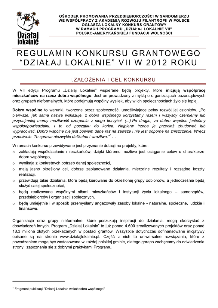 OŚRODEK PROMOWANIA PRZEDSIĘBIORCZOŚCI W SANDOMIERZU WE WSPÓŁPRACY Z AKADEMIĄ ROZWOJU FILANTROPII W POLSCE OGŁASZA LOKALNY 1. KONKURS GRANTOWY W RAMACH PROGRAMU „DZIAŁAJ LOKALNIE VII” POLSKO-AMERYKAŃSKIEJ FUNDACJI WOLNOŚCI REGULAMIN KONKURSU GRANTOWEGO “DZIAŁAJ LOKALNIE” VII W 2012 ROKU I.ZAŁOŻENIA I CEL KONK URSU W VII edycji Programu „Działaj Lokalnie” wspierane będą projekty, które inicjują współpracę mieszkańców na rzecz dobra wspólnego. Jest on prowadzony z myślą o organizacjach pozarządowych oraz grupach nieformalnych, które podejmują wspólny wysiłek, aby w ich społecznościach żyło się lepiej. Dobro wspólne to warunki, tworzone przez społeczność, umożliwiające pełny rozwój jej członków. „Po pierwsze, jak sama nazwa wskazuje, z dobra wspólnego korzystamy razem i wszyscy czerpiemy lub przynajmniej mamy możliwość czerpania z niego korzyści. (...) Po drugie, za dobro wspólne jesteśmy współodpowiedzialni. I to od początku do końca. Najpierw trzeba je przecież zbudować lub wypracować. Dobro wspólne nie jest bowiem dane raz na zawsze i nie jest odporne na zniszczenie. Wręcz przeciwnie. To sprawa niezwykle delikatna i wrażliwa.”1 … W ramach konkursu przewidywane jest przyznanie dotacji na projekty, które: o o o zakładają współdziałanie mieszkańców, dzięki któremu możliwe jest osiąganie celów o charakterze dobra wspólnego, wynikają z konkretnych potrzeb danej społeczności, mają jasno określony cel, dobrze zaplanowane działania, mierzalne rezultaty i rozsądne koszty realizacji, o przewidują takie działania, które będą kierowane do określonej grupy odbiorców, a jednocześnie będą służyć całej społeczności, o będą realizowane wspólnymi siłami mieszkańców i instytucji życia lokalnego – samorządów, przedsiębiorców i organizacji społecznych, o będą umiejętnie i w sposób przemyślany angażowały zasoby lokalne - naturalne, społeczne, ludzkie i finansowe. Organizacje oraz grupy nieformalne, które poszukują inspiracji do działania, mogą skorzystać z doświadczeń innych. Program „Działaj Lokalnie” to już ponad 4.600 zrealizowanych projektów oraz ponad 18,3 miliona złotych przekazanych w postaci grantów. Wszystkie dotychczas dofinansowane inicjatywy opisane są na stronie www.dzialajlokalnie.pl. Część z nich to uniwersalne rozwiązania, które z powodzeniem mogą być zastosowane w każdej polskiej gminie, dlatego gorąco zachęcamy do odwiedzenia strony i zapoznania się z dobrymi praktykami Programu. 1 Fragment publikacji "Działaj Lokalnie wokół dobra wspólnego" II. KTO MOŻE UBIEGAĆ SIĘ O DOTACJE? Program adresowany jest do: o organizacji pozarządowych posiadających osobowość prawną (tj. fundacji, stowarzyszeń, oddziałów Caritas zarejestrowanych w KRS lub klubów sportowych zarejestrowanych w ewidencji Starosty Powiatowego), z wyłączeniem fundacji skarbu państwa i ich oddziałów, spółdzielni socjalnych i mieszkaniowych, stowarzyszeń samorządów lokalnych, Lokalnych Grup Działania i Lokalnych Grup Rybackich, Lokalnych Organizacji Turystycznych (działających na podstawie Ustawy z dnia 25 czerwca 1999 r. o Polskiej Organizacji Turystycznej i w oparciu o ustawę prawo o stowarzyszeniach, zgodnie z Art. 4. ustawy o POT) oraz związków stowarzyszeń. o grup nieformalnych (w tym także oddziałów terenowych organizacji nieposiadających osobowości prawnej), w których imieniu wniosek złoży organizacja pozarządowa (jak wyżej) lub jedna z następujących instytucji publicznych: przedszkole publiczne, szkoła publiczna, instytucja kultury, biblioteka publiczna, ośrodek pomocy społecznej, Lokalne Grupy Działania, Lokalne Grupy Rybackie i Lokalne Organizacje Turystyczne. Instytucje te muszą posiadać osobowość prawną lub dysponować stosownym pełnomocnictwem od organu, któremu podlegają, do reprezentowania go w zakresie umożliwiającym przeprowadzenie planowanych działań, podpisanie umowy oraz rozliczenie projektu. o grup nieformalnych, występujących z wnioskiem samodzielnie, jako tzw. Inicjatywa DL (definicja w części VII) Do konkursu można składać nieograniczoną liczbę wniosków (zarówno przez wnioskodawców2, jak i realizatorów3), jednak jeden realizator będzie mógł dostać dofinansowanie na realizację najwyżej jednego projektu. W konkursie mogą wziąć udział te organizacje i instytucje oraz grupy, które: o mają siedzibę w powiatach: sandomierskim, opatowskim, staszowskim (woj. świętokrzyskie) o planują prowadzić działania na terenie jednej z gmin wymienionych powiatów III. SPOSÓB WYŁANIANIA GRANTOBIORCÓW Ośrodek „Działaj Lokalnie” dokona oceny formalnej w oparciu o następujące kryteria: 1. projekt został złożony w terminie, tj. do 15 kwietnia 2012. 2. projekt jest napisany według formularza wniosku Programu „Działaj Lokalnie VII” 2012, jest czytelny i kompletny. 3. projekt jest złożony przez organizację, instytucję lub grupę uprawnioną do udziału w konkursie, zgodnie z wytycznymi przedstawionymi w części II Regulaminu. 4. organizacja/instytucja ubiegająca się o dotację załączyła do wniosku dokument potwierdzający posiadanie osobowości prawnej lub stosowne pełnomocnictwo od organu, któremu podlega, do samodzielnego zaciągania zobowiązań oraz prowadzenia działań zaplanowanych w ramach projektu4. 2 3 organizacja lub instytucja posiadająca osobowość prawną, aplikująca w imieniu grupy nieformalnej, lub w imieniu własnym grupa nieformalna, która będzie realizować projekt regulamin lokalnego konkursu grantowego w 2012 r., strona 2 z 11 5. projekt jest adresowany do społeczności do około 20.000 mieszkańców (lub większej, objętej konkursem miejscowości5), która mieści się w zasięgu działania ODL, a siedziba wnioskodawcy (organizacji, oddziału) znajduje się na obszarze objętym konkursem przez ODL. 6. projekt dotyczy aktywizow