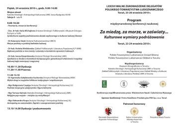 Piątek, 24 września 2010 r., godz. 9.00-14.00 Miejsce obrad: Katedra Etnologii i Antropologii Kulturowej UMK, Szosa Bydgoska 44/48 Sekcja II - sala III 9.00-10.50 • Powitanie, otwarcie konferencji • Doc. dr hab. Katia Michajłowa (Instytut Etnologii i Folklorystyki z Muzeum Etnograficznym w Sofii) Symboliczne aspekty podróżowania dziada wędrownego w kulturze ludowej Słowian • Dr Katarzyna Smyk (Instytut Kulturoznawstwa UMCS) Motyw podróży w polskiej balladzie ludowej • Dr hab. Violetta Wróblewska (Zakład Folklorystyki i Literatury Popularnej ILP UMK) Bajkowe podróże w inne światy i zaświaty w kontekście opowieści ludowych • Dr hab. Iwona Rzepnikowska (Instytut Filologii Słowiańskiej UMK) Spotkania w drodze w kontekście kompozycyjno-gatunkowych właściwości rosyjskiej ludowej bajki zwierzęcej i magicznej 10.50-11.20 Dyskusja 11.20-11.50 Przerwa 11.50-13.10 LXXXVI WALNE ZGROMADZENIE DELEGATÓW POLSKIEGO TOWARZYSTWA LUDOZNAWCZEGO Toruń, 23-26 września 2010 r. Program międzynarodowej konferencji naukowej Za miedzę, za morze, w zaświaty... Kulturowe wymiary podróżowania Toruń, 23-24 września 2010 r. Organizatorzy Polskie Towarzystwo Ludoznawcze Zarząd Główny Polskie Towarzystwo Ludoznawcze Oddział w Toruniu Współorganizatorzy Muzeum Etnograficzne w Toruniu Katedra Etnologii i Antropologii Kulturowej UMK w Toruniu Zakład Folklorystyki i Literatury Popularnej oraz Zakład Wiedzy o Kulturze Instytutu Literatury Polskiej UMK w Toruniu • Dr Agnieszka Gołębiowska-Suchorska (Instytut Filologii Słowiańskiej UKW) Wybór drogi w rosyjskim folklorze tradycyjnym i współczesnym • Mgr Małgorzata Czapiga (Instytut Etnologii i Antropologii Kulturowej UJ) Podróże inicjacyjne: pielgrzymka i figura labiryntu • Mgr Tomasz Kalniuk (Katedra Etnologii i Antropologii Kulturowej UMK) Religijne pop-wojaże – mistyka czy mistyfikacja? Konferencja współfinansowana przez Ministerstwo Nauki i Szkolnictwa Wyższego Sponsor konferencji Firma Handlowo-Produkcyjna PAK Sp. z o.o. Toruń • Mgr Aleksandra Krupa (Instytut Etnologii i Antropologii Kulturowej UŁ) Antropolog na autostradzie. Zapiski z czasoprzestrzeni podróży Patronat honorowy 13.10-14.00 Dyskusja i podsumowanie Marszałek Województwa Kujawsko-Pomorskiego Rektor Uniwersytetu Mikołaja Kopernika w Toruniu Prezydent Miasta Torunia Czwartek, 23 września 2010 r., godz. 14.30-19.15 Piątek, 24 września 2010 r., godz. 9.00-14.00 Miejsce obrad: Muzeum Etnograficzne, ul. Wały gen. Sikorskiego 19, sala widowiskowa Miejsce obrad: Katedra Etnologii i Antropologii Kulturowej UMK, Szosa Bydgoska 44/48 Sekcja I - sala I 14.30-16.35 • Powitanie gości, otwarcie konferencji i WZD PTL 9.00-10.50 • Prof. dr hab. Piotr Kowalski (Instytut Dziennikarstwa i Komunikacji Społecznej UWr) Podróże i potwory. O staropolskim doświadczaniu obcości • Dr hab. Jan Perszon (Wydział Teologiczny UMK) Antropologiczny i religijny wymiar pielgrzymowania • Dr Marcin Stabrowski (Instytut Kulturoznawstwa UWr) Ibn Battuta. Osobliwości miast i dziwy podróży • Mgr Igor Zmeták (Slovenská národná knižnica v Martine) Svet za morom podľa 16. stornia (Świat za morzem według 16. stulecia) • Dr Krzysztof Woźniak (Instytut Historii UŁ) O pewnych skutkach „efektu demonstracji”. Zachodnioeuropejskie podróże polskich pionierów uprzemysłowienia w latach 1769-1830 16.35-17.00 Dyskusja 17.00-17.30 Przerwa 17.30-18.50 • Dr hab. Maria Jakitowicz (Zakład Folklorystyki i Literatury Popularnej ILP UMK) Czy zesłaniec podróżuje? Wokół dziennika podróży Jakuba Salingera z 1863 roku • Prof. dr hab. Jolanta Ługowska (Instytut Filologii Polskiej UWr) ‘Baedecker’ i ‘życie’ w strukturze powieści o tematyce podróżniczej. Na przykładzie opowieści o podróżach Kati Astrid Lindgren • Prof. dr hab. Swietłana M. Czerwonnaja (Katedra Etnologii i Antropologii Kulturowej UMK) Grozny – Warszawa – dalej wszędzie? (Droga czeczeńskiego uchodźcy: model po 2000 roku • Prof. dr hab. Aleksander Posern-Zieliński (Instytut Etnologii i Antropologii Kulturowej UAM) Tubylcy w podróży, czyli globalizacyjne wyzwania i glokalizacyjne przemiany. Przypadek południowo-amerykański 18.50-19.15 Dyskusja • Powitanie, otwarcie konferencji • Dr Oleksandra Matyukhina (Państwowy Uniwersytet Lotniczy, Kijów) Od pielgrzymek komunistycznych do wyjazdów na zakupy (shopping-turnusów) [Osobliwości turystyki w ZSSR] • Dr hab. Janina Hajduk-Nijakowska, prof. UO (Katedra Kulturoznawstwa UO) Turystyka katastroficzna • Dr Ewa Klekot (Instytut Etnologii i Antropologii Kulturowej UW) Podróż w czasie: zwiedzanie historycznych budowli i kompleksów urbanistycznych 10.50-11.20 Dyskusja 11.20-11.50 Przerwa 11.50-13.10 • Dr Magdalena Ziółkowska-Kuflińska (Instytut Socjologii UAM) Adrenalina w pakiecie, czyli kogo i dlaczego pociąga safari, corrida i encierros? • Dr Natalia Bloch (Instytut Etnologii i Antropologii Kulturowej UAM) Obóz uchodźców jako atrakcja turystyczna. Kto i po co od(z)wiedza diasporę tybetańską • Dr Anna Nadolska-Styczyńska (Katedra Etnologii i Antropologii Kulturowej UMK) „Przecież ja dojeżdżam”, czyli antropolog w podróży do pracy • Dr Damian Kasprzyk (Instytut Etnologii i Antropologii Kulturowej UŁ) Czas zdublowany i miejsce wędrujące – szkic o biesiadzie w pociągu 13.10-14.00 Dyskusja i podsumowanie