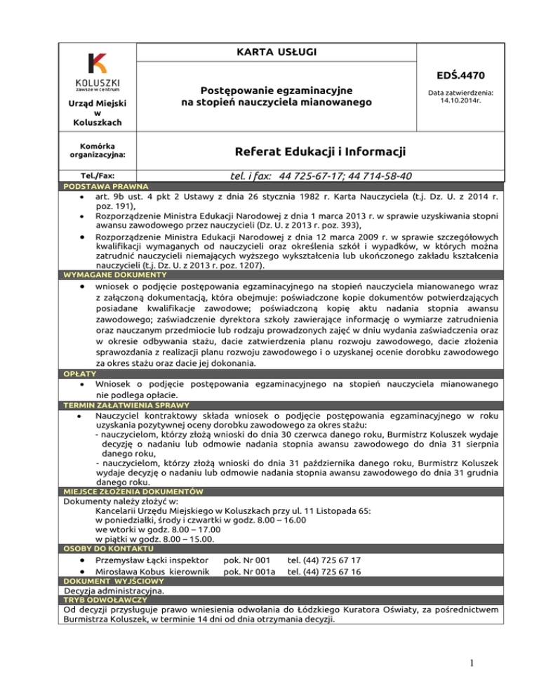 KARTA USŁUGI EDŚ.4470 Urząd Miejski w Koluszkach Postępowanie egzaminacyjne na stopień nauczyciela mianowanego Komórka organizacyjna: Tel./Fax: PODSTAWA PRAWNA Data zatwierdzenia: 14.10.2014r. Referat Edukacji i Informacji tel. i fax: 44 725-67-17; 44 714-58-40 art. 9b ust. 4 pkt 2 Ustawy z dnia 26 stycznia 1982 r. Karta Nauczyciela (t.j. Dz. U. z 2014 r. poz. 191), Rozporządzenie Ministra Edukacji Narodowej z dnia 1 marca 2013 r. w sprawie uzyskiwania stopni awansu zawodowego przez nauczycieli (Dz. U. z 2013 r. poz. 393), Rozporządzenie Ministra Edukacji Narodowej z dnia 12 marca 2009 r. w sprawie szczegółowych kwalifikacji wymaganych od nauczycieli oraz określenia szkół i wypadków, w których można zatrudnić nauczycieli niemających wyższego wykształcenia lub ukończonego zakładu kształcenia nauczycieli (t.j. Dz. U. z 2013 r. poz. 1207). WYMAGANE DOKUMENTY wniosek o podjęcie postępowania egzaminacyjnego na stopień nauczyciela mianowanego wraz z załączoną dokumentacją, która obejmuje: poświadczone kopie dokumentów potwierdzających posiadane kwalifikacje zawodowe; poświadczoną kopię aktu nadania stopnia awansu zawodowego; zaświadczenie dyrektora szkoły zawierające informację o wymiarze zatrudnienia oraz nauczanym przedmiocie lub rodzaju prowadzonych zajęć w dniu wydania zaświadczenia oraz w okresie odbywania stażu, dacie zatwierdzenia planu rozwoju zawodowego, dacie złożenia sprawozdania z realizacji planu rozwoju zawodowego i o uzyskanej ocenie dorobku zawodowego za okres stażu oraz dacie jej dokonania. OPŁATY Wniosek o podjęcie postępowania egzaminacyjnego na stopień nauczyciela mianowanego nie podlega opłacie. TERMIN ZAŁATWIENIA SPRAWY Nauczyciel kontraktowy składa wniosek o podjęcie postępowania egzaminacyjnego w roku uzyskania pozytywnej oceny dorobku zawodowego za okres stażu: - nauczycielom, którzy złożą wnioski do dnia 30 czerwca danego roku, Burmistrz Koluszek wydaje decyzję o nadaniu lub odmowie nadania stopnia awansu zawodowego do dnia 31 sierpnia danego roku, - nauczycielom, którzy złożą wnioski do dnia 31 października danego roku, Burmistrz Koluszek wydaje decyzję o nadaniu lub odmowie nadania stopnia awansu zawodowego do dnia 31 grudnia danego roku. MIEJSCE ZŁOŻENIA DOKUMENTÓW Dokumenty należy złożyć w: Kancelarii Urzędu Miejskiego w Koluszkach przy ul. 11 Listopada 65: w poniedziałki, środy i czwartki w godz. 8.00 – 16.00 we wtorki w godz. 8.00 – 17.00 w piątki w godz. 8.00 – 15.00. OSOBY DO KONTAKTU Przemysław Łącki inspektor Mirosława Kobus kierownik pok. Nr 001 pok. Nr 001a tel. (44) 725 67 17 tel. (44) 725 67 16 DOKUMENT WYJŚCIOWY Decyzja administracyjna. TRYB ODWOŁAWCZY Od decyzji przysługuje prawo wniesienia odwołania do Łódzkiego Kuratora Oświaty, za pośrednictwem Burmistrza Koluszek, w terminie 14 dni od dnia otrzymania decyzji. 1 ............................................................................ miejscowość, data Burmistrz Koluszek WNIOSEK O PODJĘCIE POSTĘPOWANIA EGZAMINACYJNEGO NA STOPIEŃ NAUCZYCIELA MIANOWANEGO ............................................................................................................................................................................................................................................................ 1. imię /imiona/ i nazwisko .......................................................................................................................................................................................………………….................................... 2. data i miejsce urodzenia PESEL ............................................................................................................................................................................ ........................................... 3. adres zamieszkania 4. telefon ...................................................................................................................................................................................................................................................... 5. miejsce pracy .................................................................................................................................................................................. 6. stanowisko – przedmiot lub rodzaj prowadzonych zajęć ................................................................................................................................................... 8. data rozpoczęcia stażu na stopień nauczyciela kontraktowego ..................................................................................................................................................... 10. data rozpoczęcia stażu na stopień nauczyciela mianowanego .......................................................... 7. staż pracy pedagogicznej ........................................................... 9. data zakończenia stażu .......................................................... 11. data zakończenia stażu Na podstawie art. 9d ust. 7 ustawy z dnia 26 stycznia 1982 r. – Karta Nauczyciela (t.j. Dz. U. z 2014 r. poz. 191), w związku z otrzymaną w dniu ........................................................................ pozytywną oceną dorobku zawodowego za okres stażu, proszę o podjęcie postępowania egzaminacyjnego o nadanie stopnia nauczyciela mianowanego. Do wniosku załączam następującą dokumentację: 1. Poświadczone kopie dokumentów potwierdzających posiadane kwalifikacje zawodowe, 2. Poświadczona kopia Aktu nadania stopnia awansu zawodowego nauczyciela kontraktowego, 3. Zaświadczenie dyrektora szkoły zawierające informacje o: a) wymiarze zatrudnienia oraz nauczanym przedmiocie lub rodzaju prowadzonych zajęć w dniu wydania zaświadczenia oraz w okresie odbywania stażu, b) dacie zatwierdzenia planu rozwoju zawodowego, c) dacie złożenia sprawozdania z reali