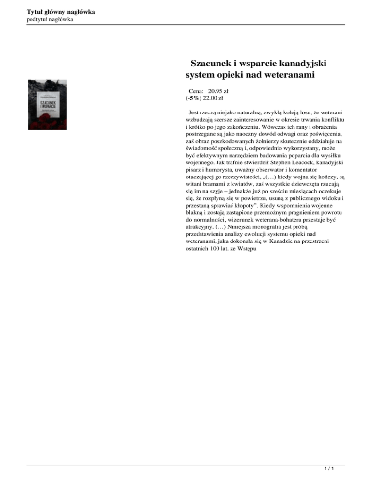 Tytuł główny nagłówka podtytuł nagłówka Szacunek i wsparcie kanadyjski system opieki nad weteranami Cena: 20.95 zł (-5%) 22.00 zł Jest rzeczą niejako naturalną, zwykłą koleją losu, że weterani wzbudzają szersze zainteresowanie w okresie trwania konfliktu i krótko po jego zakończeniu. Wówczas ich rany i obrażenia postrzegane są jako naoczny dowód odwagi oraz poświęcenia, zaś obraz poszkodowanych żołnierzy skutecznie oddziałuje na świadomość społeczną i, odpowiednio wykorzystany, może być efektywnym narzędziem budowania poparcia dla wysiłku wojennego. Jak trafnie stwierdził Stephen Leacock, kanadyjski pisarz i humorysta, uważny obserwator i komentator otaczającej go rzeczywistości, „(…) kiedy wojna się kończy, są witani bramami z kwiatów, zaś wszystkie dziewczęta rzucają się im na szyje – jednakże już po sześciu miesiącach oczekuje się, że rozpłyną się w powietrzu, usuną z publicznego widoku i przestaną sprawiać kłopoty”. Kiedy wspomnienia wojenne blakną i zostają zastąpione przemożnym pragnieniem powrotu do normalności, wizerunek weterana-bohatera przestaje być atrakcyjny. (…) Niniejsza monografia jest próbą przedstawienia analizy ewolucji systemu opieki nad weteranami, jaka dokonała się w Kanadzie na przestrzeni ostatnich 100 lat. ze Wstępu 1/1 Powered by TCPDF (www.tcpdf.org)