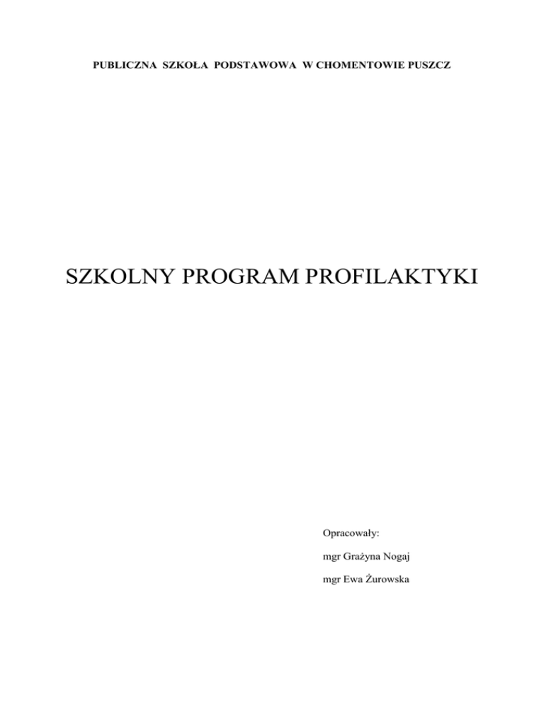PUBLICZNA SZKOŁA PODSTAWOWA W CHOMENTOWIE PUSZCZ SZKOLNY PROGRAM PROFILAKTYKI Opracowały: mgr Grażyna Nogaj mgr Ewa Żurowska Zadania profilaktyki : 1. Dbanie o integralny rozwój osoby, dziecka we wszystkich jego wymiarach : w wymiarze fizycznym, duchowym, intelektualnym, emocjonalnym, moralnym, społecznym. 2. Wzmacnianie czynników chroniących dzieci i młodzież 3. Wzrost współpracy rodziny, szkoły środowiska lokalnego wokół spójnej wizji profilaktyki dzieci i młodzieży. 4. Pomoc rodzinie w prawidłowym pełnieniu funkcji wychowawczej. Program ma być realizowany w cyklu systematycznego oddziaływania na uczniów i w miarę potrzeb modyfikowany. Podstawa prawna Ustawa o Systemie Oświaty. Konwencja o Prawach Dziecka uchwalona przez Zgromadzenie Ogólne Narodów Zjednoczonych 20 listopada 1989r., ratyfikowana przez Polskę 30 września 1991r. Program Polityki Prorodzinnej Państwa przyjęty w dniu 17 listopada 1998r. przez Komitet Społeczny Rady Ministrów. Ustawa z dnia 26 października i przeciwdziałaniu alkoholizmowi. 1982r. o wychowaniu w trzeźwości Ustawa o ochronie zdrowia psychicznego dnia 19 sierpnia 1994r. Ustawa z dnia 9 listopada 1995r. o ochronie zdrowia przed następstwami używania tytoniu i wyrobów tytoniowych. Ustawa z dnia 24 kwietnia 1997r. o przeciwdziałaniu narkomanii. Rozporządzenie MENiS z dnia 23 grudnia 2008r. zmieniające rozporządzenie w sprawie ramowych statutów publicznego przedszkola oraz publicznych szkół. Rozporządzenie MENiS z dnia 12 sierpnia 2002r. w sprawie nauczania treści wiedzy o życiu seksualnym, określonych w podstawie programowej jako zajęcia edukacyjne: „wychowanie do życia w rodzinie” Statut Publicznej Szkoły Podstawowej w Chomentowie Puszcz Program Wychowawczy Publicznej Szkoły Podstawowej w Chomentowie Puszcz Diagnoza środowiska szkolnego Publiczna Szkoła Podstawowa w Chomentowie Puszcz jest niewielka szkołą , co w połączeniu z przyjaznym i bezpiecznym otoczeniem sprawia że stwarzamy naszym uczniom poczucie bezpieczeństwa. Nasi uczniowie to mieszkańcy wsi z utrudnionym dostępem do korzystania z różnych propozycji ośrodków kulturalnych. Dla nich ośrodkiem życia kulturalnego jest szkoła, zajęcia pozalekcyjne, wycieczki i imprezy w niej organizowane. Wykształcenie rodziców – najczęściej zawodowe lub podstawowe może być przyczyna braku aspiracji naukowych ale również może wpływać motywująco. Sytuacja materialna wielu rodzin jest bliska ubóstwa dlatego niektórzy rodzice w poszukiwaniu pracy wyjeżdżają za granice co rodzi problem euro sierot a często prowadzi tez do rozbicia rodziny. Szkoła jest miejscem gdzie dziecko spędza dużo czasu, spotyka rówieśników rozwija się pod względem intelektualnym i społecznym , poznaje dorosłych, którzy mogą stać się autorytetami i wzorcami do naśladowania . Młody człowiek styka się z różnymi oczekiwaniami , zadaniami , problemami, dlatego należy wzbogacić proces wychowania o działania profilaktyczne Aby dokładniej sprecyzować potrzeby w zakresie działań profilaktycznych nauczyciele poprzez obserwację, rozmowy z dziećmi oraz rodzicami, ankiety zbierali informacje na temat najczęściej pojawiających się problemów w środowisku uczniowskim Założenia 1. Kształtowanie prawidłowych postaw i norm społecznych u uczniów; 2. Chronienie młodego człowieka w rozwoju przed zagrożeniami i reagowanie na pojawiające się zagrożenia; 3. Wyposażenie młodego człowieka w umiejętności budowania dobrych relacji i pozytywnych więzi opartych na skutecznej komunikacji; 4. Budowa poczucia własnej wartości; 5. Rozwiązywanie rozpoznanych problemów szkolnych i pozaszkolnych uczniów przy współudziale rodziców oraz ewentualnie innych instytucji pomocniczych; 6. Uświadamianie zagrożenia zachowań ryzykownych, które niosą za sobą agresja, przemoc i uzależnienia; 7. Uczenie postawy asertywnej; 8. Wspieranie prac nad harmonijnym rozwojem osobowości i zdrowym stylem życia; 9. Poznanie sposobów radzenia sobie w sytuacjach trudnych, wyrażania swoich potrzeb, emocji i opinii; 10. Kształtowanie umiejętności analizowania przez uczniów swego nieprzemyślanego zachowania i rozwijanie poczucia odpowiedzialności za własne postępowanie; 11. Współpraca ze środowiskiem rodzinnym i innymi instytucjami pomocniczymi w celu osiągania zamierzonych efektów profilaktyki; Cele 1. Kształcenie postaw prozdrowotnych. 2. Przygotowanie uczniów do rozpoznawania i dokonywania wyboru właściwych zachowań na niebezpieczeństwa zagrażające zdrowiu i życiu. 3. Przekazywanie informacji o objawach i skutkach uzależnień /nikotynizm, narkomania, alkoholizm ,dopalacze /. 4. Promowanie zdrowego stylu życia. 5. Uświadomienie znaczenia czynnego wypoczynku. 6. Wskazywanie pożądanych wzorców zachowań. 7. Wyposażenie uczniów w wiedzę na temat bezpiecznego poruszania się po drogach. 8. Wzmacnianie u uczniów postaw pożądanych społecznie i akceptowanych powszechnie zachowań. 9. Ograniczanie zachowań agresywnych wśród uczniów i wzmacnianie zachowań pozytywnych. 10. Stwarzanie warunków bezpiecznego rozwoju i funkcjonowania w szkole, i poza nią. 11. Nauka rozwiązywania konfliktów bez użycia siły. 12. Zapobieganie ryzyka wystąpienia uzależnień od środków psychoaktywnych wśród młodzieży. 13. Kształtowanie postawy asertywnej i odpowiedzialnych wyborów. 14. Kształtowanie umiejętności radzenie sobie ze zmieniająca się rzeczywistością oraz niepokojami i trudnościami okresu dojrzewania. 15. Kształtowanie wśród dzieci przekonań o konieczności przestrzegania zasad bezpieczeństwa przy wykonywaniu pracy. 16. Przekazania wiedzy na temat zasad udzielania pierwszej pomocy. 17. Uświadomienie zagrożeń związanych z pracą dzieci w rodzinnych gospodarstwach rolnych. Zadania Wzmacnianie pozytywnego obrazu samego siebie i samooceny; Organizowanie systematycznych działań profilaktyczno – edukacyjnyc