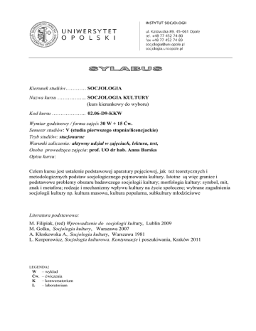 Kierunek studiów………… SOCJOLOGIA Nazwa kursu …………….. SOCJOLOGIA KULTURY (kurs kierunkowy do wyboru) Kod kursu ……………….. 02.06-D9-KKW Wymiar godzinowy / forma zajęć: 30 W + 15 Ćw. Semestr studiów: V (studia pierwszego stopnia/licencjackie) Tryb studiów: stacjonarne Warunki zaliczenia: aktywny udział w zajęciach, lektura, test, Osoba prowadząca zajęcia: prof. UO dr hab. Anna Barska Opisu kursu: Celem kursu jest ustalenie podstawowej aparatury pojęciowej, jak też teoretycznych i metodologicznych podstaw socjologicznego pojmowania kultury. Istotne są więc granice i podstawowe problemy obszaru badawczego socjologii kultury; morfologia kultury: symbol, mit, znak i metafora; rodzaje i mechanizmy wpływu kultury na życie społeczne; wybrane zagadnienia socjologii kultury np. kultura masowa, kultura popularna, subkultury młodzieżowe Literatura podstawowa: M. Filipiak, (red) Wprowadzenie do socjologii kultury, Lublin 2009 M. Golka, Socjologia kultury, Warszawa 2007 A. Kłoskowska A., Socjologia kultury, Warszawa 1981 L. Korporowicz, Socjologia kulturowa. Kontynuacje i poszukiwania, Kraków 2011 LEGENDA: W Ćw. K L – wykład – ćwiczenia – konwersatorium – laboratorium L.P. TREŚCI KSZTAŁCENIA (tematy zajęć) Liczba godzin na studiach stacjonarnych w. ćw. 1. Socjologiczne ujęcie kultury 2 1 2. Procesy nabywania kultury 2 1 Czynniki spzno-kulturowe a osobowość Mechanizmy wpływu kultury na życie na życie społeczne 2 2 2 4 2 4 2 2 2 2 2 1 1 1 2 1 2 1 1 1 1 1 3. 4. 5. 6. 7. 8. 9. 10. 11. 12. 13. Uczestnictwo w kulturze. Nowe formy Kultura masowa i kultura popularna Zróżnicowanie społeczne a zróżnicowanie kulturowe Ocena i porównywanie kultur Społeczeństwo spektaklu i moda Wspólnotowość i trybalizm Kultura rzeczywistości wirtualnej Kultura konsumpcyjna Test zaliczeniowy