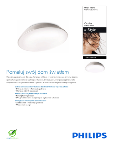 Philips InStyle Oprawa sufitowa Oculus matowy chrom InStyle 32200/17/16 Pomaluj swój dom światłem Prawdziwa przyjemność dla oczu. Ta lampa sufitowa w kolorze matowego chromu idealnie spełnia funkcję oświetlenia ogólnego w łazience. Emituje jasne, energooszczędne światło, dzięki któremu wszystkie codzienne czynności w łazience wykonuje się łatwiej i wygodniej. Dobre samopoczucie w łazience dzięki oświetleniu wysokiej jakości • Dobre oświetlenie w łazience to podstawa • Oferta do różnych zastosowań Pomaluj łazienkę bezpiecznym światłem • Pomaluj łazienkę światłem • IP44, produkt idealnie nadający się do użytkowania w łazience Ekologiczne rozwiązania oświetleniowe • Źródła światła o niezwykłej żywotności • Oszczędność energii 322001716 Oprawa sufitowa Oculus matowy chrom Zalety Dane techniczne Dobre oświetlenie to podstawa Dobre oświetlenie jest niezbędne podczas czynności wykonywanych przy lustrze, dlatego każda lampa wyposażona jest w wysokiej klasy źródło światła, ułatwiające codzienną pielęgnację. W produktach oświetleniowych do łazienki wykorzystano najnowszą, energooszczędną technologię, która zapewnia dobrej jakości oświetlenie bez efektu oślepienia. rygorystyczne testy, które potwierdziły jej odporność na wodę. Poziom IP określają dwie liczby: pierwsza to poziom ochrony przeciw kurzowi, a druga przeciw wodzie. Poziom IP44 oznacza, że lampa ta jest odporna na zachlapania. To czyni z niej idealną lampę do łazienki. Źródła światła o niezwykłej żywotności • Materiał: aluminium, syntetyk • Kolor: matowy chrom Dodatkowe funkcje/akcesoria w zestawie • Świetlówki w zestawie • Produkt wodoodporny Wymiary i waga produktu Kilka zastosowań • • • • Kolekcja obejmuje szeroki wybór lamp ściennych i sufitowych. Wśród nich znajdują się duże oprawy sufitowe, które w komfortowy sposób oświetlą całą łazienkę. Oprócz tego w ofercie występują również kinkiety zapewniające czyste, jasne światło niwelujące cienie. Dzięki temu można precyzyjnie wykonać makijaż, ogolić się lub założyć soczewki kontaktowe. Wysokość: 10,7 cm Długość: 37,9 cm Szerokość: 37,9 cm Waga netto: 2,090 kg Dane techniczne Wypełnij łazienkę światłem Lampy do łazienki z kolekcji InStyle są doskonałym uzupełnieniem wystroju każdej łazienki dzięki stylowemu wykończeniu i solidnej konstrukcji. Odporne na zużycie materiały, takie jak matowa stal szlachetna, aluminium i szkło, są wykończone z dbałością o najdrobniejsze szczegóły, np. gładkie, zaokrąglone krawędzie czy powierzchnie pozbawione wystających elementów. To kolekcja o nowoczesnej stylistyce z eleganckim, dekoracyjnym zacięciem, wykonana jednak z zachowaniem czystości i prostoty stylu. Stylistyka i wykończenie Oferta obejmuje szeroki wybór energooszczędnych, fluorescencyjnych świetlówek przeznaczonych do ogólnego oświetlenia otoczenia. Po zainstalowaniu lamp do łazienki InStyle nie trzeba martwić się o części zamienne czy naprawy. Dzięki nim zaoszczędzisz również energię i pieniądze. Oszczędność energii • • • • • • • • • • • • • • IP44 — bezpieczne korzystanie w łazience • • Zasilanie sieciowe: Przedział 220–240 V, 50–60 Hz Technologia źródła światła: fluorescencyjne, 230 V Liczba źródeł światła: 1 Trzonek: 2GX13 Moc źródła światła w zestawie: 40 W Maksymalna moc wymiennego źródła światła: 40 W Barwa światła: ciepła biel Maksymalna trwałość źródła światła: 12 000 godz. Oprawa z możliwością przyciemniania: Nie LED: Nie Wbudowane źródło światła LED: NIE Klasa energetyczna dołączonego źródła światła: A godz. Oprawa jest zgodna ze źródłami światła klasy: A+ do E Współczynnik IP: IP44, ochrona przed przedmiotami powyżej 1 mm, ochrona przed rozchlapaną wodą Klasa ochronności: II — podwójna izolacja Moc strumienia świetlnego dołączonego źródła światła w lumenach: 3300 lm Serwis • Gwarancja: 2 lata Wymiary i waga opakowania Ta lampa firmy Philips zużywa mniej energii niż tradycyjne źródła światła, co pozwala zmniejszyć rachunki za prąd i przyczynia się do ochrony środowiska. • • • • Wysokość: 41,6 cm Długość: 40,8 cm Szerokość: 12,3 cm Waga: 2,408 kg Różne • Opracowano z myślą o: Łazienka • Styl: Nowoczesna • Typ: Oprawa sufitowa Ta lampa łazienkowa Philips została zaprojektowana pod kątem wilgotnych miejsc i przeszła • Data wydania 2016-02-18 © 2016 Koninklijke Philips N.V. Wszelkie prawa zastrzeżone. Wersja: 2.5.1 Dane techniczne mogą ulec zmianie bez powiadomienia. Znaki towarowe są własnością Koninklijke Philips N.V. lub własnością odpowiednich firm. 12 NC: 9150 023 15001 EAN: 87 17943 02585 5 www.philips.com