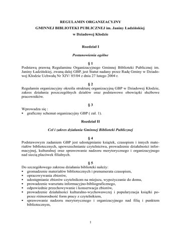 REGULAMIN ORGANIZACYJNY GMINNEJ BIBLIOTEKI PUBLICZNEJ im. Janiny Ładzińskiej w Dziadowej Kłodzie Rozdział I Postanowienia ogólne §1 Podstawą prawną Regulaminu Organizacyjnego Gminnej Biblioteki Publicznej im. Janiny Ładzińskiej, zwaną dalej GBP, jest Statut nadany przez Radę Gminy w Dziadowej Kłodzie Uchwałą Nr XIV/ 85/04 z dnia 27 lutego 2004 r. §2 Regulamin organizacyjny określa strukturę organizacyjną GBP w Dziadowej Kłodzie, zakres działania poszczególnych działów oraz podstawowe obowiązki służbowe pracowników. §3 Wprowadza się : graficzny schemat organizacyjny GBP ( zał. 1). Rozdział II Cel i zakres działania Gminnej Biblioteki Publicznej §4 Podstawowym zadaniem GBP jest udostępnianie książek, czasopism i innych materiałów bibliotecznych, upowszechnianie czytelnictwa, prowadzenie działalności informacyjnej, kulturalnej oraz sprawowanie nadzoru merytorycznego i organizacyjnego nad siecią placówek filialnych. §5 Do szczegółowego zakresu działania biblioteki należy: gromadzenie materiałów bibliotecznych i prenumerata czasopism, opracowywania zbiorów, udostępnianie zbiorów czytelnikom na miejscu, wypożyczanie do domu, prowadzenie warsztatu informacyjno-bibliograficznego, odpowiednie przechowywanie i konserwacja zbiorów, prowadzenie działalności kulturalno-wychowawczej i popularyzacja książki poprzez różnorodność form pracy z czytelnikiem, sprawowanie nadzoru merytorycznego i organizacyjnego nad filią i punktem bibliotecznym, 1 współpraca z wiejskimi placówkami kultury, szkołami oraz organizacjami społecznymi w zakresie wspólnego propagowania działalności kulturalnej. Rozdział III Struktura organizacyjna §6 Działalność GBP opiera się na zasadzie jednoosobowego kierownictwa, służbowego podporządkowania, podziału czynności oraz indywidualnej odpowiedzialności poległych pracowników Gminnej Biblioteki Publicznej. §7 W skład Gminnej Biblioteki Publicznej wchodzą następujące placówki: 1. Gminna Biblioteka Publiczna w Dziadowej Kłodzie. 2. Filia Gminnej Biblioteki Publicznej w Lipce. §8 Dla wykonania zadań tworzy się następujące /działy/ stanowiska: 1. Finansowo – księgowy. 2. Administracyjny. 3. Merytoryczny. §9 Kierownik może powiększyć liczbę stanowisk poprzez utworzenie nowych, dokonać ich łączenia lub wprowadzić takie rozwiązania, które umożliwią realizację zadań merytorycznych GBP. § 10 Działy te opracowują problemowe, analityczne, merytoryczne oraz inne zagadnienia związane z charakterem instytucji. § 11 W ramach obsługi kancelaryjnej w Gminnej Bibliotece Publicznej stosuje się przepisy określone w Rozporządzeniu Ministra Kultury z dnia 16 września 2002 r. w sprawie postępowania z dokumentacją, zasad jej klasyfikowania oraz zasad i trybu przekazania materiałów archiwalnych do archiwów państwowych (Dz. U. z 2002 r. Nr 167, poz. 1375 ). § 12 Stanowiska działają w oparciu o zakresy czynności; a. ogólne zakresy dla poszczególnych działów i pracowników GBP określone są w Rozdziale V i VI Regulaminu, b. zakres praw i obowiązków dla poszczególnych pracowników ustalany jest na podstawie niniejszego Regulaminu przez Kierownika GBP. 2 Rozdział IV Zakres działania Kierownika GBP §13 Kierownik ponosi pełną odpowiedzialność za działalność GBP, a w szczególności za: opracowanie i realizację planu działalności GBP oraz sprawozdawczość w tym zakresie, opracowuje budżet biblioteki, prawidłową organizację pracy, zapewniającą wykonywanie zadań, podejmowanie decyzji w sprawach kadrowych, właściwy dobór pracowników i realizację polityki kadrowej, przydzielanie spraw i czynności pracownikom, dokształcanie i doskonalenie zawodowe pracowników GBP, upowszechnianie czytelnictwa, opracowuje zbiory biblioteczne w zakresie ustalonym przez WiMBP, zapewnienie właściwych warunków pracy oraz zapewnienie stosowania przepisów o ochronie pracy, bhp, i p. poż., racjonalną gospodarkę majątkiem GBP, należyte zabezpieczenie mienia społecznego i organizowanie właściwej jego ochrony przed pożarem i kradzieżą, przestrzeganie przepisów ustawy o ochronie informacji niejawnych, ustawy o ochronie danych osobowych i ustawie o dostępie do informacji publicznej. utrzymanie należytej dyscypliny pracy. § 14 Na czas nieobecności Kierownika zastępstwo w sprawach nie cierpiących zwłoki obejmuje osoba upoważniona przez Kierownika. § 15 Kierownik może upoważnić i cofnąć upoważnienie niektórym pracownikom do zawierania umów, podejmowania decyzji. § 16 Kierownik jest odpowiedzialny za całokształt działalności kierowanej przez niego jednostki organizacyjnej przed Wójtem Gminy. Rozdział V Podstawowe obowiązki pracowników § 17 Do obowiązków należy rzetelne załatwianie spraw i należyte wykonywanie pracy powierzonej zakresem czynności. 3 § 18 Do obowiązków pracowników należy w szczególności: rzetelne i efektywne wykonywanie pracy, przestrzeganie ustalonego czasu pracy, porządku oraz wykorzystanie czasu pracy na pracę zawodową, dokładne i sumienne wykonywanie poleceń przełożonych jeżeli nie są sprzeczne z przepisami prawa pracy lub umową o pracę, przestrzeganie przepisów i zasad bhp i p. poż., koleżeński stosunek do współpracowników, odpowiedzialność materialna za powierzone mienie, przestrzeganie przepisów ustawy o ochronie informacji niejawnych, ustawy o ochronie danych osobowych i ustawy o dostępie do informacji publicznej, zaznajamianie się z treścią obowiązujących przy wykonywanej pracy przepisów, regulaminów, zarządzeń i instrukcji obowiązujących w GBP oraz ich przestrzeganie, systematyczne podnoszenie kwalifikacji zawodowych, Rozdział VI Zakresy działania poszczególnych działów § 19 1. Bezpośredni nadzór nad działalnością poszczególnych działów GBP pełnią pracownicy wyznaczeni przez Kierownika. 2. Odpowiadają oni za całokształt pracy Działu, a w szczególności