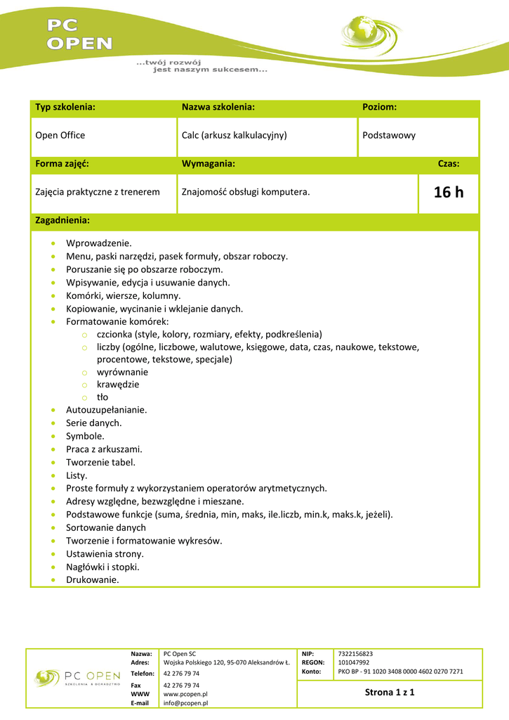 Typ szkolenia: Nazwa szkolenia: Poziom: Open Office Calc (arkusz kalkulacyjny) Podstawowy Forma zajęć: Wymagania: Zajęcia praktyczne z trenerem Znajomośd obsługi komputera. Czas: 16 h Zagadnienia: Wprowadzenie. Menu, paski narzędzi, pasek formuły, obszar roboczy. Poruszanie się po obszarze roboczym. Wpisywanie, edycja i usuwanie danych. Komórki, wiersze, kolumny. Kopiowanie, wycinanie i wklejanie danych. Formatowanie komórek: o czcionka (style, kolory, rozmiary, efekty, podkreślenia) o liczby (ogólne, liczbowe, walutowe, księgowe, data, czas, naukowe, tekstowe, procentowe, tekstowe, specjale) o wyrównanie o krawędzie o tło Autouzupełanianie. Serie danych. Symbole. Praca z arkuszami. Tworzenie tabel. Listy. Proste formuły z wykorzystaniem operatorów arytmetycznych. Adresy względne, bezwzględne i mieszane. Podstawowe funkcje (suma, średnia, min, maks, ile.liczb, min.k, maks.k, jeżeli). Sortowanie danych Tworzenie i formatowanie wykresów. Ustawienia strony. Nagłówki i stopki. Drukowanie. Nazwa: Adres: PC Open SC Wojska Polskiego 120, 95-070 Aleksandrów Ł. Telefon: 42 276 79 74 Fax WWW E-mail 42 276 79 74 www.pcopen.pl [email protected] NIP: REGON: Konto: 7322156823 101047992 PKO BP - 91 1020 3408 0000 4602 0270 7271 Strona 1 z 1