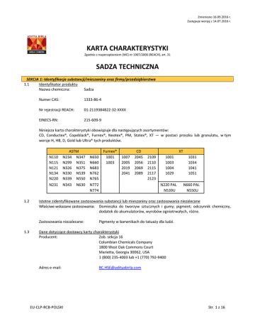 Zmieniono 16.09.2016 r. Zastępuje wersję z 14.07.2016 r. KARTA CHARAKTERYSTYKI Zgodnie z rozporządzeniem (WE) nr 1907/2006 (REACH), art. 31 SADZA TECHNICZNA SEKCJA 1: Identyfikacja substancji/mieszaniny oraz firmy/przedsiębiorstwa 1.1 Identyfikator produktu Nazwa chemiczna: Sadza Numer CAS: 1333-86-4 Nr rejestracji REACH: 01-2119384822-32-XXXX EINECS-RN: 215-609-9 Niniejsza karta charakterystyki obowiązuje dla następujących asortymentów: CD, Conductex®, Copeblack®, Furnex®, Neotex®, PM, Statex®, XT — w postaci proszku lub granulatu, w tym wersje H, HB, D, Gold lub Ultra® tych produktów. N110 N115 N121 N134 N220 N231 1.2 ASTM N234 N347 N299 N351 N326 N375 N330 N539 N339 N550 N343 N630 Furnex® 1001 1003 1007 2005 2019 2041 CD 2045 2056 2069 2089 XT 2109 2110 2115 2117 2123 1001 1003 1004 1029 1031 1034 1041 1051 N220 PAL N539U N660 PAL N550U Istotne zidentyfikowane zastosowania substancji lub mieszaniny oraz zastosowania niezalecane Właściwe wskazane zastosowania: Domieszka do tworzyw sztucznych i gumy; pigment; odczynnik chemiczny, dodatek do akumulatorów, wyrobów ogniotrwałych, różne. Zastosowania niezalecane: 1.3 N650 N660 N683 N762 N765 N772 N774 Pigmenty w barwnikach do tatuaży dla ludzi. Dane dotyczące dostawcy karty charakterystyki Producent: Zob. sekcja 16 Columbian Chemicals Company 1800 West Oak Commons Court Marietta, Georgia 30062, USA 1 (800) 235-4003 lub +1 (770) 792-9400 Adres e-mail: EU-CLP-RCB-POLSKI [email protected] Str. 1 z 16 Zmieniono 16.09.2016 r. Zastępuje wersję z 14.07.2016 r. Numery telefonów w nagłych wypadkach: Austria +43 1 406 43 43 Dania +82 12 12 12 Węgry +36 80 201 199 Litwa +370 5 236 20 52 Belgia +352 8002 5500 Estonia +372 626 93 90 Islandia 543 2222 Luksemburg +352 8002 5500 Bułgaria +359 2 9154 233 Finlandia 09 471977 Irlandia +353 01 809 2566 Portugalia 808 250 143 Chorwacja Republika Czeska +385 1 23 48 342 Francja +33 01 45 42 59 59 Włochy +39 0321 798 211 Rumunia +40213183606 +420 224 919 293 Niemcy +49 511 959 350 Łotwa +371 67042473 Hiszpania +34 91 562 04 20 Holandia 030-2748888 SEKCJA 2: Identyfikacja zagrożeń: 2.1. Klasyfikacja substancji lub mieszaniny Zwrot określający zagrożenia: Substancja nie stwarza zagrożenia zgodnie z Rozporządzeniem (WE) nr 1272/2008 (CLP). 2.2 2.3 Elementy oznakowania Piktogram: Brak Zwrot sygnalizujący: Brak Zwrot określający zagrożenie: Brak Zwrot określający środki ostrożności: Brak Inne zagrożenia Substancja jest sklasyfikowana jako substancja niebezpieczna o charakterze palnego pyłu przez Normę Komunikowania Zagrożeń OSHA 2012 w USA (29 CFR 1910.1200) i kanadyjskie Rozporządzenie ws. Produktów Niebezpiecznych (HPR) 2015. Hasło ostrzegawcze, zwrot określający zagrożenie i zwroty określające środki ostrożności w USA i Kanadzie to: OSTRZEŻENIE — Może tworzyć palne stężenia pyłu w powietrzu. Trzymać z dala od wszystkich źródeł zapłonu, w tym ciepła, iskier i ognia. Zapobiegać gromadzeniu się pyłu w celu zminimalizowania zagrożenia wybuchem. Nie narażać na temperatury powyżej 300°C. Do niebezpiecznych produktów spalania może należeć tlenek węgla, dwutlenek węgla, tlenki siarki i produkty organiczne. Oczy: Może spowodować odwracalne podrażnienie mechaniczne. Skóra: Może powodować podrażnienia mechaniczne, zabrudzenia i wysuszenie skóry. Nie zgłoszono żadnych przypadków uczuleń u ludzi. Wdychanie: Pył może powodować podrażnienie dróg oddechowych. Należy zapewnić miejscową wentylację wyciągową. Zob. sekcja 8. Połknięcie: Nie przewiduje się niekorzystnego wpływu na organizm. Rakotwórczość: Sadza techniczna jest wymieniona przez Międzynarodową Agencję ds. Badań nad Rakiem (IARC) jako substancja należąca do grupy 2B (potencjalnie rakotwórcza dla ludzi). Zob. sekcja 11. SEKCJA 3: Skład/informacja o składnikach 3.1 Substancje 3.1.1 Sadza techniczna (bezpostaciowa) 100% 3.1.2 Numer CAS: 1333-86-4 3.1.3 EINECS-RN: 215-609-9 EU-CLP-RCB-POLSKI Str. 2 z 16 Zmieniono 16.09.2016 r. Zastępuje wersję z 14.07.2016 r. SEKCJA 4: Środki pierwszej pomocy 4.1 Opis środków pierwszej pomocy Wdychanie: Wyprowadzić/wynieść poszkodowaną osobę na świeże powietrze. Jeśli to konieczne, przywrócić normalne oddychanie poprzez standardowe środki pierwszej pomocy. Skóra: Umyć skórę wodą z łagodnym środkiem myjącym. Jeżeli objawy będą się utrzymywać, zasięgnąć porady lekarza. Oczy: Przepłukać dokładnie oczy dużą ilością wody, trzymając powieki otwarte. W razie pojawienia się objawów, zwrócić się o pomoc lekarską. Połknięcie: Nie wywoływać wymiotów. Jeżeli poszkodowany jest przytomny, dać do wypicia kilka szklanek wody. Nigdy nie podawać nic doustnie osobie nieprzytomnej. 4.2 Najważniejsze objawy oraz skutki, ostre i opóźnione. Objawy: Substancja działa drażniąco na oczy i drogi oddechowe w przypadku narażenia powyżej limitów narażenia w miejscu pracy. Zob. sekcja 2. 4.3 Wskazanie dotyczące natychmiastowej pomocy lekarskiej i szczególnego postępowania z poszkodowanym Uwaga dla lekarzy: Leczyć objawowo FAZA 5: Postępowanie w przypadku pożaru 5.1 Środki gaśnicze Odpowiednie środki gaśnicze: Używać piany, dwutlenku węgla (CO2), proszku gaśniczego lub mgły wodnej. W przypadku zastosowania wody zalecana jest mgła wodna. Nieodpowiednie środki gaśnicze: 5.2 Nie używać czynników pod wysokim ciśnieniem, które mogłyby powodować tworzenie potencjalnie wybuchowych mieszanin w powietrzu. Szczególne zagrożenia związane z substancją lub mieszaniną Zagrożenia szczególne stwarzane przez substancję chemiczną: Może nie być oczywiste, że sadza się pali, dopóki materiał nie zostanie poruszony i nie pojawią się iskry. Sadzę techniczną, która się paliła, należy uważnie obserwować przez przynajmniej 48 godzin, aby mieć pewność, że nie ma tlącego się materiału. Niebezpieczne produkty spalania: 5.3 Informacje dla straży pożar