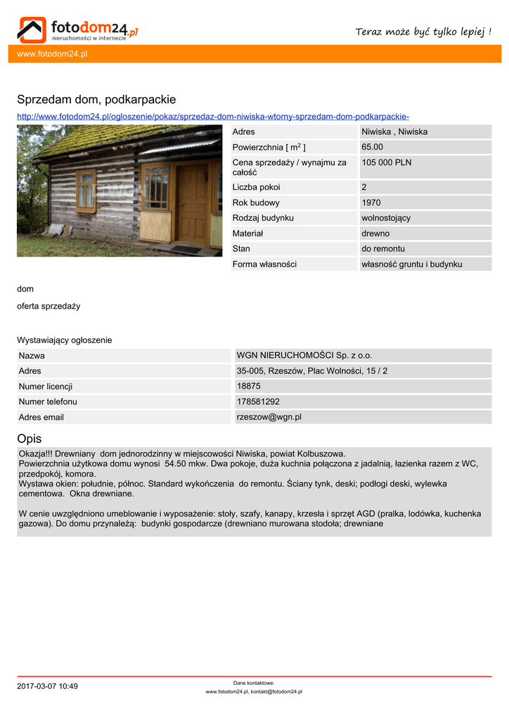 Teraz może być tylko lepiej ! www.fotodom24.pl Sprzedam dom, podkarpackie http://www.fotodom24.pl/ogloszenie/pokaz/sprzedaz-dom-niwiska-wtorny-sprzedam-dom-podkarpackieAdres Niwiska , Niwiska Powierzchnia [ m2 ] 65.00 Cena sprzedaży / wynajmu za całość 105 000 PLN Liczba pokoi 2 Rok budowy 1970 Rodzaj budynku wolnostojący Materiał drewno Stan do remontu Forma własności własność gruntu i budynku dom oferta sprzedaży Wystawiający ogłoszenie Nazwa WGN NIERUCHOMOŚCI Sp. z o.o. Adres 35-005, Rzeszów, Plac Wolności, 15 / 2 Numer licencji 18875 Numer telefonu 178581292 Adres email [email protected] Opis Okazja!!! Drewniany dom jednorodzinny w miejscowości Niwiska, powiat Kolbuszowa. Powierzchnia użytkowa domu wynosi 54.50 mkw. Dwa pokoje, duża kuchnia połączona z jadalnią, łazienka razem z WC, przedpokój, komora. Wystawa okien: południe, północ. Standard wykończenia do remontu. Ściany tynk, deski; podłogi deski, wylewka cementowa. Okna drewniane. W cenie uwzględniono umeblowanie i wyposażenie: stoły, szafy, kanapy, krzesła i sprzęt AGD (pralka, lodówka, kuchenka gazowa). Do domu przynależą: budynki gospodarcze (drewniano murowana stodoła; drewniane 2017-03-07 10:49 Dane kontaktowe: www.fotodom24.pl, [email protected]