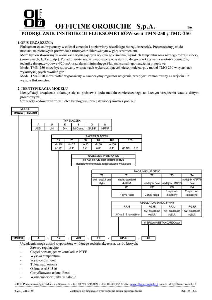 OFFICINE OROBICHE S.p.A. 1/6 PODRĘCZNIK INSTRUKCJI FLUKSOMETRÓW serii TMN-250 ; TMG-250 1.OPIS URZĄDZENIA Fluksometr został wykonany w całości z metalu i pozbawiony wszelkiego rodzaju uszczelek. Przeznaczony jest do montaŜu na pionowych przewodach rurowych z skierowanym w górę strumieniem. MoŜe być on stosowany w warunkach wymagających wysokiego ciśnienia, wysokich temperatur oraz róŜnego rodzaju cieczy (korozyjnych, lepkich, itp.). Ponadto, moŜe zostać wyposaŜony w system zdalnego przekazywania wartości pomiarów, technikę dwuprzewodową 4/20 mA oraz alarm minimalnego i/lub maksymalnego natęŜenia przepływu. Model TMN-250 moŜe być stosowany w systemach wykorzystujących ciecz, podczas gdy model TMG-250 w systemach wykorzystujących równieŜ gaz. Model TMG-250 moŜe zostać wyposaŜony w samoczynny regulator natęŜenia przepływu zamontowany na wejściu lub wyjściu fluksometru. 2. IDENTYFIKACJA MODELU Identyfikacji urządzenia dokonuje się na podstawie kodu modelu zamieszczonego na kaŜdym urządzeniu wraz z danymi procesowymi. Szczegóły kodów zawarto w ulotce katalogowej przedstawionej równieŜ poniŜej: MODEL TMN250 TMG250 A ANSI TYP ZŁĄCZEK D T DIN Tri-Clamp U UNI 15 25 dn 15 o 1/2" dn 25 o 1" G GAS-F N NPT-F ZAKRES ZŁĄCZEK 50 80 100 dn 50 o 2" dn 80 o 3" 125 dn 100 o 4" dn 125 o 5" NATEśENIE PRZEPŁYWU od A01 do A23 oraz od B01 do B20 dodatkowe informacje zamieszczono w katalogu NADAJNIK LUB STYK T2 T0 T1 bez nadaj. i bez styku nadaj. standard 4-20mA C1 nadajnik Eexi C2 1 styk Reed 2 styki Reed T3 1 styk ind. bistabilny REGULATOR SAMOCZYNNY RGJE RPJU RPJE 1/4" ss 316 na wejściu 1/2" ss 316 na wejściu T4 nadajnik HART® nadajnik HART® Eexi C3 C4 1/4" ss 316 na wyjściu 2 styki ind. bistabilne RGJU 1/2" ss 316 na wyjściu WERSJA NIESTANDARDOWA TMG250 . A . 15 . A09 . T0 . RPJE . XX Urządzenia mogą zostać wyposaŜone w róŜnego rodzaju akcesoria, wśród których: Zawory regulacyjne Części pozostające w kontakcie z PTFE Wysoka temperatura Wysokie ciśnienie Tuleja nagrzewcza Osłona z AISI 316 Certyfikowana osłona Eexd Wzmacniacz czujnika w osłonie 24010 Ponteranica (Bg) ITALY - via Serena, 10 - Tel. 0039/035/4530211 - Fax 0039/035/570546 - www.officineorobiche.it e-mail: [email protected] ************************************************************************************************************************************************************ CZERWIEC ’08 Zastrzega się moŜliwość wprowadzenia zmian bez uprzedzenia IST/145-POL OFFICINE OROBICHE S.p.A. 3. ZASADA DZIAŁANIA Fluksometr składa się z pomiarowego przewodu rurowego, wewnątrz którego przepływa pływak z magnesem. Na zewnątrz znajduje się zespół wskaźnikowy zamknięty w obudowie z ruchomym elementem wyposaŜonym we wskaźnik i magnes, który wskutek sprzęŜenia magnetycznego przesuwany jest z wspomnianego pływaka, wskazując natęŜenie przepływu. Model TMN-250 posiada pływak stoŜkowy przesuwający się w kalibrowanej przegrodzie. Model TMG-250 posiada stoŜek pomiarowy, w którym przesuwa się pływak o odpowiednio wykalibrowanej krawędzi. model TMN-250 2/6 model TMG-250 4. INSTALACJA 4.1 MONTAś NA OBIEKCIE Przed przystąpieniem do instalacji, naleŜy: • sprawdzić kompatybilność złączek linii i urządzenia; • upewnić się, Ŝe oś złączek jest idealnie równoległa względem osi przewodu rurowego; • upewnić się, Ŝe strumień jest skierowany w górę; • upewnić się, Ŝe stosowanie urządzenia jest zgodne z danymi wybitymi na tabliczce znamionowej (ciśnienie, temperatura, natęŜenie przepływu, itp.); Nie naleŜy wywierać nacisku na obudowę zespołu wskaźnika. Otworzyć obudowę i wyjąć znajdujący się wewnątrz zacisk wskaźnika, zgodnie z przedstawioną obok ilustracją. 4.2 INSTALACJA ELEKTRYCZNA -Przed przystąpieniem do okablowania, sprawdzić zgodność ze znamionowymi danymi elektrycznymi zainstalowanego czujnika; -Urządzenie wyposaŜono w skrzynkę zaciskową umieszczoną wewnątrz obudowy; -Podłączyć czujnik do źródła zasilania i przeprowadzić regulację punktu wyzwalającego. 4.2.1 CZUJNIK NAMUR -Podłączyć przewody zasilania czujnika zgodnie z przedstawionym schematem, zwracając szczególną uwagę na biegunowość; -Stosowanie urządzeń w strefach zagroŜonych wybuchem, z czujnikami Eexi (typu NAMUR), wymaga przestrzegania instrukcji konstruktora czujnika załączonych do niniejszego opracowania. BN=BRĄZOWY BU=NIEBIESKI 4.2.2 CZUJNIK REED Czujnik Reed typu SPDT, bez napięciowy, o zasięgu 30 V ac/dc max i 100 mA max. Aby zapobiec uszkodzeniu styku, w przypadku występowania obciąŜeń indukcyjnych lub pojemnościowych naleŜy stosować odpowiednie zabezpieczenia. Stosowanie urządzeń w strefach zagroŜonych wybuchem, z czujnikami typu Reed, nie wymaga spełniania dodatkowych wytycznych. 4.2.3 CZUJNIK 4-20mA Podłączyć przewody zasilania czujnika, zgodnie z przedstawionym obok schematem zwracając szczególną uwagę na biegunowość. 24010 Ponteranica (Bg) ITALY - via Serena, 10 - Tel. 0039/035/4530211 - Fax 0039/035/570546 - www.officineorobiche.it e-mail: [email protected] ************************************************************************************************************************************************************ CZERWIEC ’08 Zastrzega się moŜliwość wprowadzenia zmian bez uprzedzenia IST/145-POL OFFICINE OROBICHE S.p.A. 3/6 5. ODDANIE DO UśYTKOWANIA W przypadku instalowania fluksometru na nowych systemach, jako zabezpieczenie przed ewentualnymi cząstkami metalowymi znajdującymi się w strumieniu, które wciągnięte przez pływak mogą przyczynić się do jego zuŜycia lub wręcz zablokowania, na wejściu do fluksometru naleŜy zamontować filtr magnetyczny. Jeśli nie przewidziano filtra, zaleca się wyjęcie pływaka i dokładne przepłukanie przewodów rurowych. Zaleca się stosowanie zaworów by-pass, zgodnie z zamieszczonym obok schematem. URUCHOMIENIE (przy zakręconych w