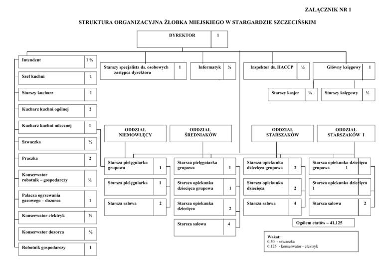 ZAŁĄCZNIK NR 1 STRUKTURA ORGANIZACYJNA śŁOBKA MIEJSKIEGO W STARGARDZIE SZCZECIŃSKIM DYREKTOR Intendent 1¾ Szef kuchni 1 Starszy kucharz 1 Kucharz kuchni ogólnej 2 Kucharz kuchni mlecznej 1 Starszy specjalista ds. osobowych zastępca dyrektora Szwaczka ½ Praczka 2 Palacza ogrzewania gazowego – dozorca Konserwator elektryk Konserwator dozorca Robotnik gospodarczy ½ 1 1 Informatyk ⅛ Inspektor ds. HACCP ½ Starszy kasjer ODDZIAŁ NIEMOWLĘCY Konserwator robotnik – gospodarczy 1 ODDZIAŁ ŚREDNIAKÓW Starsza pielęgniarka grupowa 1 Starsza pielęgniarka 1 Starsza salowa 2 Główny księgowy ¼ Starszy księgowy ODDZIAŁ STARSZAKÓW ½ ODDZIAŁ STARSZAKÓW I Starsza pielęgniarka grupowa 1 Starsza opiekunka dziecięca grupowa 2 Starsza opiekunka dziecięca grupowa 1 Starsza opiekunka dziecięca grupowa 1 Starsza opiekunka dziecięca 2 Starsza opiekunka dziecięca 1 Starsza opiekunka dziecięca Starsza salowa 4 Starsza salowa 2 Starsza salowa 4 ½ Ogółem etatów – 41,125 ½ 1 1 Wakat: 0,50 - szwaczka 0.125 - konserwator - elektryk 2