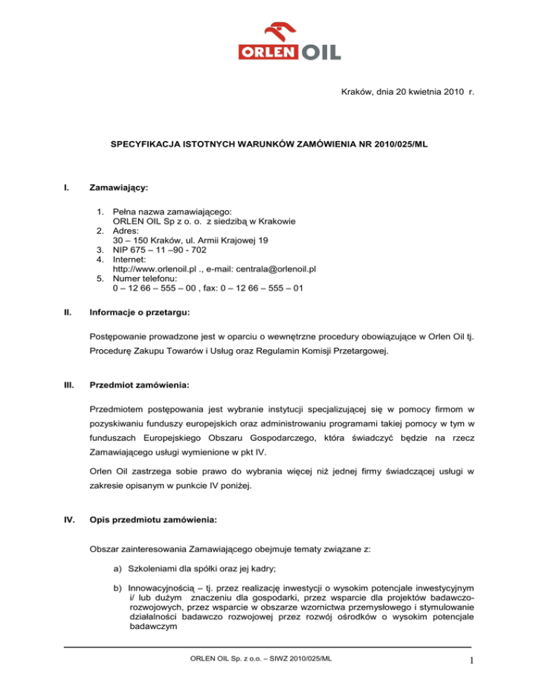 Kraków, dnia 20 kwietnia 2010 r. SPECYFIKACJA ISTOTNYCH WARUNKÓW ZAMÓWIENIA NR 2010/025/ML I. Zamawiający: 1. Pełna nazwa zamawiającego: ORLEN OIL Sp z o. o. z siedzibą w Krakowie 2. Adres: 30 – 150 Kraków, ul. Armii Krajowej 19 3. NIP 675 – 11 –90 - 702 4. Internet: http://www.orlenoil.pl ., e-mail: [email protected] 5. Numer telefonu: 0 – 12 66 – 555 – 00 , fax: 0 – 12 66 – 555 – 01 II. Informacje o przetargu: Postępowanie prowadzone jest w oparciu o wewnętrzne procedury obowiązujące w Orlen Oil tj. Procedurę Zakupu Towarów i Usług oraz Regulamin Komisji Przetargowej. III. Przedmiot zamówienia: Przedmiotem postępowania jest wybranie instytucji specjalizującej się w pomocy firmom w pozyskiwaniu funduszy europejskich oraz administrowaniu programami takiej pomocy w tym w funduszach Europejskiego Obszaru Gospodarczego, która świadczyć będzie na rzecz Zamawiającego usługi wymienione w pkt IV. Orlen Oil zastrzega sobie prawo do wybrania więcej niż jednej firmy świadczącej usługi w zakresie opisanym w punkcie IV poniżej. IV. Opis przedmiotu zamówienia: Obszar zainteresowania Zamawiającego obejmuje tematy związane z: a) Szkoleniami dla spółki oraz jej kadry; b) Innowacyjnością – tj. przez realizację inwestycji o wysokim potencjale inwestycyjnym i/ lub dużym znaczeniu dla gospodarki, przez wsparcie dla projektów badawczorozwojowych, przez wsparcie w obszarze wzornictwa przemysłowego i stymulowanie działalności badawczo rozwojowej przez rozwój ośrodków o wysokim potencjale badawczym ORLEN OIL Sp. z o.o. – SIWZ 2010/025/ML 1 c) Inne dodatkowo doprecyzowane dotyczące funduszy europejskich, w zależności od potrzeb Orlen Oil; Zakres usług świadczonych przez instytucje ds. funduszy europejskich na rzecz ORLEN OIL Sp. z o.o,: 1. Opracowanie wniosku o dofinansowanie zgodnie z preferencjami i potrzebami Zamawiającego w obszarze wskazanym przez Zamawiającego – na podstawie informacji przekazanych przez Zamawiającego; 2. Opracowanie do wniosku o dofinansowanie wszystkich wymaganych analiz np. w postaci studium wykonalności czy analizy ekonomiczno-finansowej jeśli dotyczy, zgodnie z wytycznymi krajowymi i europejskimi. Opracowany wniosek o dofinansowanie zostanie zaakceptowany przez zamawiającego; 3. Złożenie do oceny formalnej i merytorycznej wniosku o dofinansowane wraz ze wszystkimi stosownymi załącznikami, we wskazanej formie (formularz czy generator) i odpowiedniej liczbie egzemplarzy, we wskazanym w ogłoszeniu o naborze miejscu i terminie; 4. Monitorowanie statusu wniosku podczas procesów oceny oraz jego uzupełnianie i poprawa jeśli zajdzie taka potrzeba zgodnie ze wskazaniami/ wymogami instytucji wdrażającej; 5. Wdrażanie projektu, jeśli otrzyma dofinansowanie, w tym raportowanie zgodnie z wytycznymi instytucji zarządzającej/ instytucji wdrażających (pośredniczących/ kontroli 1stopnia etc.), oraz kontakt z instytucjami wdrażającymi w kwestiach niejasnych. V. Sposób przygotowania oferty: Każdy oferent może złożyć tylko jedną ofertę. Sposób przygotowania oferty: a. Oferta powinna być napisana czytelnie w języku polskim. b. Wszystkie strony oferty wraz z załącznikami powinny być podpisane przez osobę (osoby) uprawnioną do reprezentowania oferenta. c. Wszystkie strony oferty wraz z załącznikami powinny być spięte w sposób zapobiegający jej dekompletacji. d. Wszelkie poprawki lub zmiany w tekście oferty muszą być parafowane i datowane własnoręcznie przez osobę podpisującą ofertę lub przez osobę upoważnioną. e. Opakowanie i oznakowanie ofert: Ofertę należy złożyć w zamkniętym opakowaniu w miejscu wskazanym w pkt. VIII f. Zamawiający nie bierze odpowiedzialności za skutki braku zachowania powyższych warunków przez Oferenta. Nie spełnienie wymagań j/w spowoduje odrzucenie oferty. g. Oferent poniesie wszelkie koszty związane z przygotowaniem i złożeniem oferty. h. Dopuszcza się składanie ofert częściowych, adresowanych tylko do obszaru szkoleniowego lub innowacyjności. Nie dopuszcza się składania ofert częściowych w zakresie p. VI. 1. i. Oferta powinna obejmować dwa warianty: o w przypadku, gdy liderem projektu jest Orlen Oil, a oferent partnerem ORLEN OIL Sp. z o.o. – SIWZ 2010/025/ML 2 o VI. w przypadku, gdy liderem jest Oferent, a partnerem Orlen Oil Informacja o dokumentach, które mają dostarczyć oferenci: Oferenci obowiązani są złożyć następujące dokumenty: 1. Projekt Umowy na obsługę funduszy wynagrodzenia podzieloną na 3 części: zawierający w szczególności wysokość wyłącznie opłatę za przygotowanie wniosku o dofinansowanie odpowiedniej formie wraz ze stosownymi załącznikami; w success fee; w przypadku decyzji o wynajęciu firmy do wdrożenia projektu - wskazanie kosztów obsługi administracyjno-finansowej projektu; 2. Propozycja zarys planu ramowego w przypadku szkoleń dla różnych grup odbiorców w ramach Spółki odnoszącej się do doświadczenia i zasobów kadrowych firmy; 3. Podpisane oświadczenie stanowiące załącznik nr 1. 4. Wypełniony formularz stanowiący załącznik nr 2. 5. Aktualny odpis z właściwego rejestru albo aktualne zaświadczenie o wpisie do ewidencji działalności gospodarczej, jeżeli odrębne przepisy wymagają wpisu do rejestru lub zgłoszenia do ewidencji działalności gospodarczej, wystawiony nie wcześniej niż 6 miesięcy przed upływem terminu składania ofert. (lub dokument potwierdzony w tym terminie przez organ wydający, 6. Oświadczenie potwierdzające upoważnienie do reprezentowania firmy (pełnomocnictwo), o ile nie wynika ono z innych dokumentów załączonych przez oferenta. 7. Oświadczenie o prowadzeniu działalności w obszarze funduszy europejskich od min. 2 lat. Prosimy o podanie od ilu lat prowadzą Państwo działalność w obszarze funduszy europejskich. 8. Listę referencyjną klientów, dla których przygotowano projekty i które otrzymały dofinansowanie 