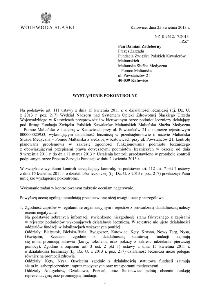 WO J E WO D A Ś LĄ S KI Katowice, dnia 25 kwietnia 2013 r. NZIII.9612.17.2013 „RZ” Pan Damian Zadeberny Prezes Zarządu Fundacja Związku Polskich Kawalerów Maltańskich Maltańska SłuŜba Medyczna – Pomoc Maltańska ul. Powstańców 21 40-039 Katowice WYSTĄPIENIE POKONTROLNE Na podstawie art. 111 ustawy z dnia 15 kwietnia 2011 r. o działalności leczniczej (t.j. Dz. U. z 2013 r. poz. 217) Wydział Nadzoru nad Systemem Opieki Zdrowotnej Śląskiego Urzędu Wojewódzkiego w Katowicach przeprowadził w kierowanym przez podmiot leczniczy działający pod firmą: Fundacja Związku Polskich Kawalerów Maltańskich Maltańska SłuŜba Medyczna – Pomoc Maltańska z siedzibą w Katowicach przy ul. Powstańców 21 o numerze rejestrowym 000000025953, wykonującym działalność leczniczą w przedsiębiorstwie o nazwie Maltańska SłuŜba Medyczna – Pomoc Maltańska z siedzibą w Katowicach przy ul. Powstańców 21, kontrolę planowaną problemową w zakresie zgodności funkcjonowania podmiotu leczniczego z obowiązującymi przepisami prawa dotyczącymi podmiotów leczniczych w okresie od dnia 9 września 2011 r. do dnia 11 marca 2013 r. Ustalenia kontroli przedstawiono w protokole kontroli podpisanym przez Prezesa Zarządu Fundacji w dniu 2 kwietnia 2013 r. W związku z wynikami kontroli zarządzający kontrolę, na podstawie art. 112 ust. 7 pkt 2 ustawy z dnia 15 kwietnia 2011 r. o działalności leczniczej (t.j. Dz. U. z 2013 r. poz. 217) przekazuje Panu niniejsze wystąpienie pokontrolne. Wykonanie zadań w kontrolowanym zakresie oceniam negatywnie. PowyŜszą ocenę ogólną uzasadniają przedstawione niŜej uwagi i oceny szczegółowe. 1. Zgodność zapisów w regulaminie organizacyjnym i rejestrze z prowadzoną działalnością naleŜy ocenić negatywnie. Na podstawie zebranych informacji stwierdzono niezgodność stanu faktycznego z zapisami w rejestrze podmiotów wykonujących działalność leczniczą. W rejestrze nie ujęto działalności oddziałów fundacji w lokalizacjach wskazanych poniŜej: Oddziały: Białystok, Bielsko-Biała, Bydgoszcz, Katowice, Kęty, Krosno, Nowy Targ, Nysa, Oświęcim, Szczecin zgodnie z działalnością statutową fundacji zajmują się m.in. promocją zdrowia (kursy, szkolenia oraz pokazy z zakresu udzielania pierwszej pomocy). Zgodnie z zapisem art. 3 ust. 2 pkt 1) ustawy z dnia 15 kwietnia 2011 r. o działalności leczniczej (t.j. Dz. U. z 2013 r. poz. 217) działalność lecznicza moŜe polegać równieŜ na promocji zdrowia. Oddziały: Kęty, Nysa, Oświęcim zgodnie z działalnością statutową fundacji zajmują się m.in. zabezpieczeniem imprez medycznych oraz transportami medycznymi, Oddziały Andrychów, Działdowo, Poznań, oraz Sulisławice pełnią obecnie funkcję reprezentacyjną oraz promocyjną fundacji. 1 Za naruszenie art. 107 ust 1 z dnia 15 kwietnia 2011 r. o działalności leczniczej (t.j. Dz. U. z 2013 r. poz. 217) odpowiedzialny jest Damian Zadeberny – Prezes Zarządu Fundacji Związku Polskich Kawalerów Maltańskich Maltańska SłuŜba Medyczna – Pomoc Maltańska. 2. Zabezpieczenie kadrowe zgodnie z profilem udzielanych świadczeń zdrowotnych naleŜy ocenić pozytywnie z nieprawidłowościami. Nie przedstawiono dokumentów potwierdzających spełnianie wymagań zdrowotnych wystawionych dla personelu udzielającego świadczeń zdrowotnych ujętego na str. 16 pkt 1 protokołu kontroli, zgodnie z zapisami art. 17 ust. 1 pkt 3) ustawy z dnia 15 kwietnia 2011 r. o działalności leczniczej (t.j. Dz. U. z 2013 r. poz. 217). Za powyŜszą nieprawidłowość odpowiedzialny jest Damian Zadeberny – Prezes Zarządu Fundacji. Nie przedstawiono dokumentu potwierdzającego uzyskanie kwalifikacji zawodowych ratownika medycznego ujętego na str. 16 pkt 2 protokołu kontroli zgodnie z brzmieniem art. 17 ust. 1 pkt 3) ustawy z dnia 15 kwietnia 2011r. o działalności leczniczej (t.j. Dz. U. z 2013 r. poz. 217). Za powyŜszą nieprawidłowość odpowiedzialny jest Damian Zadeberny – Prezes Zarządu Fundacji. 3. Spełnianie przez wyroby medyczne wykorzystywane w procesie udzielania świadczeń zdrowotnych wymagań określonych w odrębnych przepisach naleŜy ocenić negatywnie. Nie przedstawiono dokumentacji w postaci aktualnych wpisów wykonanych instalacji, napraw, konserwacji, działań serwisowych, aktualizacji oprogramowania, przeglądów, regulacji, kalibracji, wzorcowań, sprawdzeń i kontroli bezpieczeństwa wyrobów wykorzystywanych w procesie udzielania świadczeń zdrowotnych ujętych zgodnie z wymogiem zawartym w art. 90 ust. 9 ustawy z dnia 20 maja 2010 r. o wyrobach medycznych (Dz. U. Nr 107, poz. 679 z późn. zm.), niŜej wymienionego sprzętu medycznego: Będącego na wyposaŜeniu pojazdu sanitarnego LT35 SK 7676Y – Oddział Oświęcim / Katowice − defibrylator LIFEPAK 12 VLP 12-02-000699, rok produkcji 1999, przegląd techniczny z dn. 19.08.2010r. przez firmę Technika i Medycyna Sp. z o.o., Bytom, ul. Smolenia 20. Nie przedstawiono paszportów technicznych niŜej wymienionego sprzętu medycznego: − ssak LAERDAL SUCTION UNIT, − pompa infuzyjna Askor AP 22 x 2 szt. z wpisami potwierdzającymi aktualne przeglądy techniczne oraz wskazania dot. następnych przeglądów technicznych. Będącego na wyposaŜeniu pojazdu sanitarnego Daimler Chrysler D (Mercedes Sprinter 413 Kontener) – Oddział Oświęcim Nie przedstawiono paszportów technicznych niŜej wymienionego sprzętu medycznego: − pulsoksymetr, − ssak stacjonarny − ssak przenośny, − pompa infuzyjna 1 strzykawkowa z wpisami potwierdzającymi aktualne przeglądy techniczne oraz wskazania dot. następnych przeglądów technicznych. Będącego na wyposaŜeniu pojazdu sanitarnego Fiat Ducato KR 72582 – Oddział Katowice − Defibrylator Cardio AiD 750 BIAZET, przegląd techniczny z dn. 19.08.2010r. przez firmę Technika i Medycyna Sp. z o.o., Bytom, ul. Smolenia 20 − Pulsoksymetr MD 300, rok produkcji 2007, przegląd techniczny z dn. 19.08.
