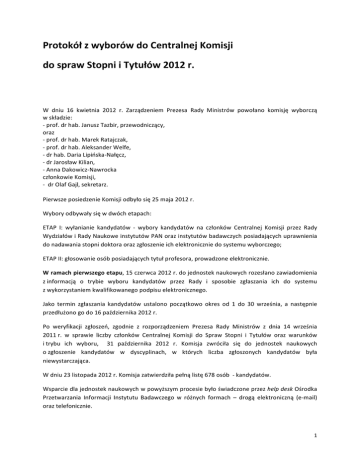 Protokół z wyborów do Centralnej Komisji do spraw Stopni i Tytułów 2012 r. W dniu 16 kwietnia 2012 r. Zarządzeniem Prezesa Rady Ministrów powołano komisję wyborczą w składzie: -‐ prof. dr hab. Janusz Tazbir, przewodniczący, oraz -‐ prof. dr hab. Marek Ratajczak, -‐ prof. dr hab. Aleksander Welfe, -‐ dr hab. Daria Lipińska-‐Nałęcz, -‐ dr Jarosław Kilian, -‐ Anna Dakowicz-‐Nawrocka członkowie Komisji, -‐ dr Olaf Gajl, sekretarz. Pierwsze posiedzenie Komisji odbyło się 25 maja 2012 r. Wybory odbywały się w dwóch etapach: ETAP I: wyłanianie kandydatów -‐ wybory kandydatów na członków Centralnej Komisji przez Rady Wydziałów i Rady Naukowe instytutów PAN oraz instytutów badawczych posiadających uprawnienia do nadawania stopni doktora oraz zgłoszenie ich elektronicznie do systemu wyborczego; ETAP II: głosowanie osób posiadających tytuł profesora, prowadzone elektronicznie. W ramach pierwszego etapu, 15 czerwca 2012 r. do jednostek naukowych rozesłano zawiadomienia z informacją o trybie wyboru kandydatów przez Rady i sposobie zgłaszania ich do systemu z wykorzystaniem kwalifikowanego podpisu elektronicznego. Jako termin zgłaszania kandydatów ustalono początkowo okres od 1 do 30 września, a następnie przedłużono go do 16 października 2012 r. Po weryfikacji zgłoszeń, zgodnie z rozporządzeniem Prezesa Rady Ministrów z dnia 14 września 2011 r. w sprawie liczby członków Centralnej Komisji do Spraw Stopni i Tytułów oraz warunków i trybu ich wyboru, 31 października 2012 r. Komisja zwróciła się do jednostek naukowych o zgłoszenie kandydatów w dyscyplinach, w których liczba zgłoszonych kandydatów była niewystarczająca. W dniu 23 listopada 2012 r. Komisja zatwierdziła pełną listę 678 osób -‐ kandydatów. Wsparcie dla jednostek naukowych w powyższym procesie było świadczone przez help desk Ośrodka Przetwarzania Informacji Instytutu Badawczego w różnych formach – drogą elektroniczną (e-‐mail) oraz telefonicznie. 1 W ramach drugiego etapu, 12 i 13 listopada 2012 r. rozesłano do 1496 dziekanów i dyrektorów instytutów informacje o: -‐ trybie głosowania; -‐ dostępnej w Internecie liście wyborców, wraz z prośbą o spowodowanie, aby profesorowie zatrudnieni w jednostkach oraz profesorowie emerytowani dokonali weryfikacji listy wyborców. W przypadku, gdyby ich nazwiska nie znalazły się na liście wyborców, należało poinformować o tym Komisję Wyborczą. Po zidentyfikowaniu swojego nazwiska na liście wyborców oraz po podaniu numeru PESEL, wyborca mógł sprawdzić, czy jego adres e-‐mail jest właściwym dla przesłania wiadomości umożliwiającej głosowanie. W przypadku konieczności zmiany adresu e-‐mail należało przekazać tę informację do Komisji Wyborczej. Wysłano także pocztą tradycyjną informacje o wyborach do 3 500 profesorów niebędących pracownikami jednostek naukowych (emerytowanych), dla których Komisja dysponowała adresami do korespondencji. Ogłoszenie o wyborach zostało także zamieszczone na łamach „Gazety Wyborczej” oraz „Rzeczpospolitej”. Do kontaktów z wyborcami uruchomiono trzy dedykowane linie telefoniczne help desk’u OPI, udzielając informacji na temat głosowania; głównie telefonicznie, ale także w formie e-‐mail. Na obydwu etapach wyborów odpowiedziano na ponad tysiąc wiadomości e-‐mail. W wyniku powyżej opisanej procedury uzyskano informacje o adresach e-‐mail 11 082 uprawnionych do głosowania, do których wysłano uprawnienia do głosowania. System wyborczy został uruchomiony 26 listopada 2012 o godz. 6:00. Głosowanie zakończono 10 grudnia 2012 o godz. 24:00. W głosowaniu uczestniczyły 7 734 osoby oddając 19 510 głosów na kandydatów w 103 dyscyplinach. W dniu 13 grudnia 2012 odbyło się spotkanie Komisji Wyborczej, na którym dokonano analizy wyników wyborów. W dziewięciu przypadkach kandydaci osiągnęli wynik wyborczy umożliwiający członkostwo w dwóch dziedzinach/dyscyplinach nauki. Zwrócono się do nich z prośbą o podjęcie decyzji co do wyboru jednej dziedziny/dyscypliny do poniedziałku, 17 grudnia 2012 r. W dniu 18 grudnia 2012 r., na posiedzeniu Komisji Wyborczej, zgodnie z § 8 rozporządzenia Prezesa Rady Ministrów w sprawie liczby członków Centralnej Komisji do Spraw Stopni i Tytułów oraz warunków i trybu ich wyboru z dnia 14 września 2011 r., dokonano losowania osób, które uzyskały jednakową liczbę głosów oraz zatwierdzono listę 228 członków Centralnej Komisji do spraw Stopni i Tytułów. Lista ta, po przedstawieniu Prezesowi Rady Ministrów została opublikowana na stronach internetowych Centralnej Komisji do spraw Stopni i Tytułów. Po opublikowaniu wyników Komisja Wyborcza otrzymała rezygnację czterech osób z powodu podjęcia innych funkcji wykluczających członkostwo w Centralnej Komisji. W dniu 7 stycznia 2013 2 Komisja wskazała osoby, które znalazły się na kolejnych miejscach pod względem liczby uzyskanych głosów oraz uwzględniła decyzję jednej osoby, która po zmianach wprowadzonych w dniu 18 grudnia figurowała na listach członków w dwóch dyscyplinach. Nowa lista zostanie przedstawiona Prezesowi Rady Ministrów i opublikowana na stronach internetowych Centralnej Komisji do spraw Stopni i Tytułów. Sporządził: Olaf Gajl, sekretarz Komisji Wyborczej Warszawa, 14 stycznia 2013 Załączniki: 1. Wybory do Centralnej Komisji do spraw Stopni i Tytułów 2012 – Wyniki wyborów 2. Lista kandydatów do Centralnej Komisji 3