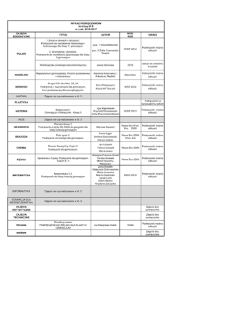 WYKAZ PODRĘCZNIKÓW do klasy III B w r.szk. 2016-2017 ZAJĘCIA EDUKACYJNE TYTUŁ 1.Świat w słowach i obrazach. Podręcznik do kształcenia literackiego i kulturowego dla klasy 3. gimnazjum POLSKI 2. Gramatyka i stylistyka. Podręcznik do kształcenia językowego dla klasy 3 gimnazjum AUTOR WYD. ROK UWAGI WSiP 2012 Podręczniki można odkupić poz. 1 Witold Bobiński poz. 2 Zofia Czarniecka Rodzik Wokół języka polskiego-test polonistyczny praca zbiorowa 2016 zakup we wrześniu w szkole ANGIELSKI Repetytorium gimnazjalisty. Poziom podstawowy i rozszerzony. Karolina Kotorowicz i Arkadiusz Mędela Macmillan Podręczniki można odkupić NIEMIECKI Grupa III.0: aha Neu 2B, 3A Podręcznik z ćwiczeniami dla gimnazjum. Kurs podstawowy dla początkujących. Anna Potapowicz Krzysztof Tkaczyk WSiP 2012 Podręczniki można odkupić MUZYKA Zajęcia nie są realizowane w kl. 3 Podręczniki na wyposażeniu szkoły PLASTYKA Igor Kąkolewski Krzysztof Kowalewski Anita Plumińska-Mieloch WSiP 2012 Podręczniki można odkupić Planeta Nowa 3 Podręcznik z płytą CD-ROM do geografii dla klasy trzeciej gimnazjum Mariusz Szubert Nowa Era Wyd. Era 2009 Podręczniki można odkupić BIOLOGIA Puls życia 3. Podręcznik do biologii dla gimnazjum. Beata Sągin Andrzej Boczarowski Marian Sęktas Nowa Era 2009 Wyd. Era Podręczniki można odkupić CHEMIA Chemia Nowej Ery. Część 3. Podręcznik dla gimnazjum. Jan Kulawik Teresa Kulawik Maria Litwin Nowa Era 2009 Podręczniki można odkupić FIZYKA Spotkania z fizyką. Podręcznik dla gimnazjum. Część 3 i 4 Nowa Era 2009 Podręczniki można odkupić MATEMATYKA Matematyka 2,3 Podręcznik do klasy trzeciej gimnazjum GWO 2010 Podręczniki można odkupić INFORMATYKA Zajęcia nie są realizowane w kl. 2 EDUKACJA DLA BEZPIECZEŃSTWA Zajęcia nie są realizowane w kl. 3 HISTORIA Bliżej historii. Gimnazjum. Podręcznik. Klasa 3 WOS Zajęcia nie są realizowane w kl. 3 GEOGRAFIA Grażyna Francuz-Ornat Teresa Kulawik Maria NowotnyRóżańska Zofia Bolałek Małgorzta Dobrowolska Marta Jucewicz Marcin Karpiński Jacek Lech Adam Mysior Krystyna Zarzycka ZAJĘCIA ARTYSTYCZNE Zajęcia bez podręcznika ZAJĘCIA TECHNICZNE Zajęcia bez podręcznika RELIGIA WDŻWR Chodźmy razem PODRĘCZNIK DO RELIGII DLA KLASY III GIMNAZJUM ks.Władysław Kubik WAM Podręcznik można odkupić Zajęcia bez podręcznika