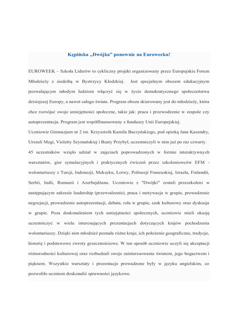 Kępińska „Dwójka” ponownie na Euroweeku! EUROWEEK – Szkoła Liderów to cykliczny projekt organizowany przez Europejskie Forum Młodzieży z siedzibą w Bystrzycy Kłodzkiej. Jest specjalnym obozem edukacyjnym pozwalającym młodym ludziom włączyć się w życie demokratycznego społeczeństwa dzisiejszej Europy, a nawet całego świata. Program obozu skierowany jest do młodzieży, która chce rozwijać swoje umiejętności społeczne, takie jak: praca i przewodzenie w zespole czy autoprezentacja. Program jest współfinansowany z funduszy Unii Europejskiej. Uczniowie Gimnazjum nr 2 im. Krzysztofa Kamila Baczyńskiego, pod opieką Jana Kasendry, Urszuli Megi, Violetty Szymańskiej i Beaty Przybył, uczestniczyli w nim już po raz czwarty. 45 uczestników wzięło udział w zajęciach poprowadzonych w formie interaktywnych warsztatów, gier symulacyjnych i praktycznych ćwiczeń przez szkoleniowców EFM wolontariuszy z Turcji, Indonezji, Meksyku, Łotwy, Polinezji Francuskiej, Izraela, Finlandii, Serbii, Indii, Rumunii i Azerbejdżanu. Uczniowie z "Dwójki" zostali przeszkoleni w następującym zakresie leadership (przewodzenie), praca i motywacja w grupie, prowadzenie negocjacji, prowadzenie autoprezentacji, debata, rola w grupie, szok kulturowy oraz dyskusja w grupie. Poza doskonaleniem tych umiejętności społecznych, uczniowie mieli okazję uczestniczyć w wielu interesujących prezentacjach dotyczących krajów pochodzenia wolontariuszy. Dzięki nim młodzież poznała różne kraje, ich położenie geograficzne, tradycje, historię i podstawowe zwroty grzecznościowe. W ten sposób uczniowie uczyli się akceptacji różnorodności kulturowej oraz rozbudzali swoje zainteresowania światem, jego bogactwem i pięknem. Wszystkie warsztaty i prezentacje prowadzone były w języku angielskim, co pozwoliło uczniom doskonalić sprawności językowe. Dzięki codziennym kontaktom z wolontariuszami, uczniowie mogli przełamać barierę językową i rozwijać umiejętności komunikacyjne. Poza intensywną pracą na zajęciach, młodzież mogła pozwolić sobie na chwilę oddechu podczas codziennych dyskotek i poznać muzykę oraz tańce narodowe z krajów wolontariuszy. Dodatkowym atutem szkolenia była możliwość poznania i podziwiania Kotliny Kłodzkiej podczas wycieczek krajoznawczych. Uwieńczeniem kilkudniowego szkolenia było wręczenie uczestnikom certyfikatów, a następnie wspólna ewaluacja warsztatów. Równie udany był jesienny pobyt młodzieży (głównie klas trzecich). Świadczą o tym wypowiedzi uczestniczek: -Oliwio, Ty byłaś po raz pierwszy na Euroweeku. Jakie masz wrażenia z pobytu? - „Uważam, że jest to naprawdę genialne przedsięwzięcie, pozwala otworzyć się na język, nie wstydzić się tego, że nie znamy wielu słów. Chociaż uczymy się już 8 lat nie jesteśmy w stanie wiedzieć wszystkiego, ale potrafimy się porozumieć z tymi ludźmi, jesteśmy osłuchani z tym językiem. To jest naprawdę wspaniałe”. - W czym tkwi fenomen tego właśnie przedsięwzięcia typu Euroweek? Dlaczego tak wiele osób chętnie wyjeżdża, chociaż są tam zajęcia i nie jest to tylko wycieczka turystycznokrajoznawcza? - „Są tam wolontariusze w naszym wieku a nie w wieku nauczycieli. Podobnie jak my korzystają z Facebooka i innych portali społecznościowych i właśnie dzięki nim mamy wspólny język, nie krępujemy się, jesteśmy z nimi na „ty”, zawiązujemy tam wiele znajomości i to nie tylko z wolontariuszami, ale z kolegami z innych miast Polski, z innych szkół. Dzięki temu możemy zawrzeć nowe znajomości nie tylko z osobami z z zagranicy, ale również z naszej szkoły”-odpowiedziała Monika. - A Ty Wiktorio, też byłaś pierwszy raz na obozie językowo-szkoleniowym Euroweek. Co Tobie się podobało? – Najbardziej chyba to, że możemy poznać ludzi, którzy nie są z Polski, ale z całego świata. Mówią wszyscy po angielsku, ale też nie są aż tak obeznani z tym językiem. Mają każdy swój akcent, każdy trochę inaczej interpretuje słowa, zdania układa. Możemy porozmawiać z nimi na wiele ciekawych tematów. To było dla mnie najlepsze. –Które z zadań z tych co mieliście do wykonania sprawiło Wam najwięcej radości, przyjemności, było najbardziej zabawne? -„Energizer. Poza tym musieliśmy ucharakteryzować wielu naszych kolegów na jakieś różne postacie np. Lady Gaga czy James Bond. Szukanie rekwizytów, które były nam potrzebne, wymyślanie choreografii, makijażu to też było bardzo fajne. Wracając do Energiser to było świetne rozbudzenie z samego rana aby się zaangażować, zintegrować”- dodały dziewczęta. –„Bardzo cenne było to, że nie musieliśmy się stresować, dobrze się bawiliśmy, wszystko odbywało się spontanicznie. Jeżeli ktoś nie radził sobie z językiem, czegoś nie rozumiał, czegoś nie umiał powiedzieć, znalazły się osoby wokół, które mu pomogły”- trafnie spointowała Monika. Wrażeniami z pobytu na Euroweeku podzieliły się: Oliwia Dziergwa i Monika Kolebska z klasy II Ia oraz Wiktoria Kowalczyk z klasy III d. To nie koniec naszych kontaktów z tym projektem. Już teraz planujemy kolejne wyjazdy w przyszłym roku szkolnym, jak zwykle po jednym jesienią i wiosną.