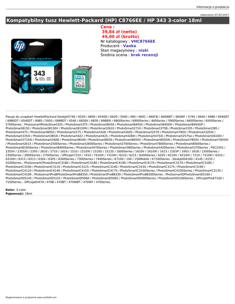Informacje o produkcie Utworzono 07-03-2017 Kompatybilny tusz Hewlett-Packard (HP) C8766EE / HP 343 3-color 18ml Cena : 39,84 zł (netto) 49,00 zł (brutto) Nr katalogowy : VHC8766EE Producent : Vanke Stan magazynowy : niski Średnia ocena : brak recenzji Pasuje do urządzeń HewlettPackard DeskJet5740 / 6520 / 6840 / 6540D / 6620 / 5940 / 460 / 460C / 460CB / 460WBT / 460WF / 5745 / 6940 / 6980 / 6940DT / 6980DT / 6540DT / 6985 / 5950 / 6988DT / 6540 / 6830V / 6830 / 6988XI / 6800Series / 6900Series / 460Series / 5900Series / 6600Series / 6500Series / 5700Series ; PhotosmartPhotoSmart325 / PhotoSmart375 / PhotoSmart8450 / PhotoSmart8450V / PhotoSmart8450XI / PhotoSmart8450GP / PhotoSmart8150 / PhotoSmart8150V / PhotoSmart8150XI / PhotoSmart2610 / PhotoSmart2710 / PhotoSmart375B / PhotoSmart335 / PhotoSmart385 / PhotoSmart475 / PhotoSmart8050 / PhotoSmart2575 / PhotoSmart428 / PhotoSmart2605 / PhotoSmart2570 / PhotoSmart7850 / PhotoSmart325XI / PhotoSmart335XI / PhotoSmart385XI / PhotoSmart422 / PhotoSmart425 / PhotoSmart428XI / PhotoSmart475XI / PhotoSmart2575xi / PhotoSmart2610XI / PhotoSmart2710XI / PhotoSmart2608 / PhotoSmart8049 / PhotoSmart8030 / PhotoSmart8050V / PhotoSmart8050XI / PhotoSmart7850V / PhotoSmart7850XI / PhotoSmart2615 / PhotoSmart2500Series / PhotoSmart2600Series / PhotoSmart2700Series / PhotoSmart7800Series / PhotoSmart8000Series / PhotoSmart8100Series / PhotoSmart8400Series / PhotoSmart470Series / PhotoSmart380Series / PhotoSmart420Series / PhotoSmart370Series ; PSC2355 / 2355V / 2355XI / 2350 / 2610 / 2710 / 1610 / 1510 / 1510XI / 1510S / 1513S / 1600Series / 1610V / 1610XI / 1615 / 2355P / 1603 / 1618 / 1500Series / 2300Series / 2600Series / 2700Series ; OfficeJet7310 / 7410 / 7410XI / 7310XI / 6210 / 6215 / 6200Series / 6205 / 6210V / 6210XI / 7210 / 7210XI / 6310 / 6310XI / 6315 / 6313 / 6304 / 6305 / 6300Series / 7300Series / 7400Series / K7100 / 100 / 150Mobile / K7100Series ; DeskJetD4160 / 4145 / 4155 / 4100Series ; PhotosmartCPhotoSmartC3180 / PhotoSmartC4180 / PhotoSmartC4190 / PhotoSmartC4170 / PhotoSmartC3170 / PhotoSmartC3185 / PhotoSmartC3194 / PhotoSmartC3110 / PhotoSmartC3125 / PhotoSmartC3140 / PhotoSmartC3150 / PhotoSmartC3175 / PhotoSmartC3190 / PhotoSmartC4110 / PhotoSmartC4140 / PhotoSmartC4150 / PhotoSmartC4175 / PhotoSmartC3100Series / PhotoSmartC4100Series / PhotoSmartC3135 / PhotoSmartC4100 ; PhotosmartProBPhotoSmartProB8350 / PhotoSmartProB8330 / PhotoSmartProB8300Series ; PhotosmartDPhotoSmartD5160 / PhotoSmartD5145 / PhotoSmartD5155 / PhotoSmartD5060 / PhotoSmartD5065 / PhotoSmartD5000Series / PhotoSmartD5100Series ; OfficeJetProK7100 / 7100Series ; OfficeJetH470 / 470B / 470BT / 470WBT / 470WF / 470Series. Kolor: 3-color Pojemność: 18ml Wygenerowano w programie www.oscGold.com
