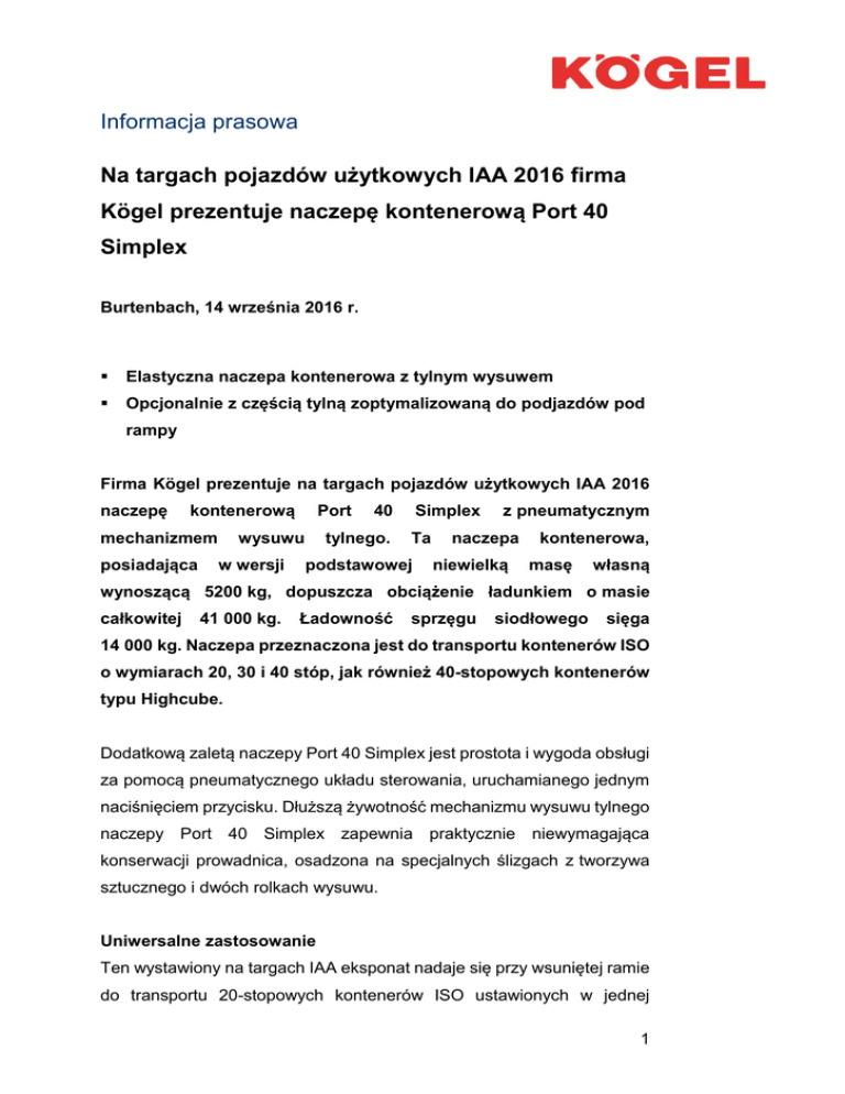 Informacja prasowa Na targach pojazdów użytkowych IAA 2016 firma Kögel prezentuje naczepę kontenerową Port 40 Simplex Burtenbach, 14 września 2016 r. Elastyczna naczepa kontenerowa z tylnym wysuwem Opcjonalnie z częścią tylną zoptymalizowaną do podjazdów pod rampy Firma Kögel prezentuje na targach pojazdów użytkowych IAA 2016 naczepę kontenerową mechanizmem posiadająca Port wysuwu w wersji 40 tylnego. Simplex Ta podstawowej z pneumatycznym naczepa niewielką kontenerowa, masę własną wynoszącą 5200 kg, dopuszcza obciążenie ładunkiem o masie całkowitej 41 000 kg. Ładowność sprzęgu siodłowego sięga 14 000 kg. Naczepa przeznaczona jest do transportu kontenerów ISO o wymiarach 20, 30 i 40 stóp, jak również 40-stopowych kontenerów typu Highcube. Dodatkową zaletą naczepy Port 40 Simplex jest prostota i wygoda obsługi za pomocą pneumatycznego układu sterowania, uruchamianego jednym naciśnięciem przycisku. Dłuższą żywotność mechanizmu wysuwu tylnego naczepy Port 40 Simplex zapewnia praktycznie niewymagająca konserwacji prowadnica, osadzona na specjalnych ślizgach z tworzywa sztucznego i dwóch rolkach wysuwu. Uniwersalne zastosowanie Ten wystawiony na targach IAA eksponat nadaje się przy wsuniętej ramie do transportu 20-stopowych kontenerów ISO ustawionych w jednej 1 Informacja prasowa płaszczyźnie z tylną krawędzią naczepy. Gdy mechanizm wysuwu tylnego jest wysunięty, na naczepie można transportować jeden 40-stopowy kontener Highcube bądź dwa 20-stopowe kontenery ISO. Ten egzemplarz wystawowy umożliwia również załadowanie jednego 30- lub 40stopowego kontenera ISO w pozycji tylnej bądź 20-stopowego kontenera w pozycji środkowej. Opcjonalnie z częścią tylną zoptymalizowaną do podjazdów pod rampy W celu łatwiejszego załadunku i wyładunku kontenerów na rampie, naczepa kontenerowa Port 40 Simplex posiada część tylną skróconą o 70 mm, a tym samym zoptymalizowaną do prac przy rampie. Dzięki temu możliwe jest zbliżenie się do rampy na mniejszą odległość, zmniejszona zostaje także przykrywana pomostem przejazdowym przestrzeń pomiędzy kontenerem a rampą. Zastosowanie tej opcji wyklucza możliwość transportowania 40-stopowych kontenerów ISO. Powłoka KTL: trwała ochrona przed korozją Tak samo, jak we wszystkich pojazdach firmy Kögel, cała rama modelu Port 40 Simplex jest chroniona przed korozją z zastosowaniem technologii nanoceramicznej oraz powłoki KTL i lakieru UV. Zdjęcie: Kögel Port 40 Simplex Na wszelkie pytania dotyczące niniejszej informacji prasowej odpowiada: inż. dypl. Volker Seitz Dyrektor ds. komunikacji / marketingu i rozwoju Telefon + 49 82 85 88 – 12 3 06 Faks + 49 82 85 88 – 12 4 24 [email protected] Patrick Wanner Rzecznik prasowy 2 Informacja prasowa Telefon + 49 82 85 88 – 12 3 01 Faks + 49 82 85 88 – 12 2 84 [email protected] Firma Kögel jest jednym z czołowych producentów przyczep w Europie. Od chwili założenia firmy w 1934 r. jej taśmy produkcyjne opuściło ponad 500 000 sztuk pojazdów. Kögel od ponad 80 lat oferuje najwyższej jakości pojazdy użytkowe i rozwiązania na potrzeby firm transportowych i budowlanych, oparte na myśli inżynierskiej „made in Germany”. We wszystkich działaniach firmy najważniejsza była zawsze pasja do transportu i innowacji, z której największe korzyści czerpią klienci z branży transportowej. Siedziba i główny zakład produkcyjny firmy Kögel Trailer GmbH & Co. KG znajdują się w bawarskiej miejscowości Burtenbach. Kögel posiada również zakłady i siedziby w Neu-Ulm (D), Duingen (D), Choceniu (CZ) oraz w Moskwie (RUS). www.koegel.com 3