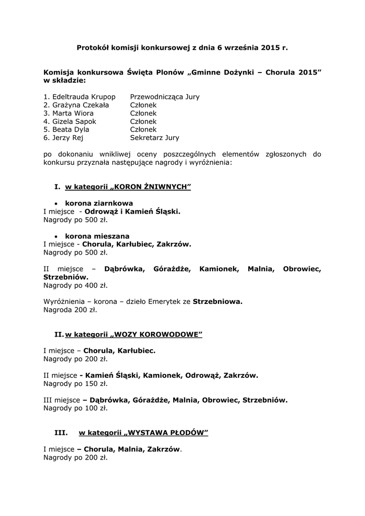 Protokół komisji konkursowej z dnia 6 września 2015 r. Komisja konkursowa Święta Plonów „Gminne Dożynki – Chorula 2015” w składzie: 1. 2. 3. 4. 5. 6. Edeltrauda Krupop Grażyna Czekała Marta Wiora Gizela Sapok Beata Dyla Jerzy Rej Przewodnicząca Jury Członek Członek Członek Członek Sekretarz Jury po dokonaniu wnikliwej oceny poszczególnych elementów zgłoszonych do konkursu przyznała następujące nagrody i wyróżnienia: I. w kategorii „KORON ŻNIWNYCH” korona ziarnkowa I miejsce - Odrowąż i Kamień Śląski. Nagrody po 500 zł. korona mieszana I miejsce - Chorula, Karłubiec, Zakrzów. Nagrody po 500 zł. II miejsce – Dąbrówka, Strzebniów. Nagrody po 400 zł. Górażdże, Kamionek, Malnia, Obrowiec, Wyróżnienia – korona – dzieło Emerytek ze Strzebniowa. Nagroda 200 zł. II. w kategorii „WOZY KOROWODOWE” I miejsce – Chorula, Karłubiec. Nagrody po 200 zł. II miejsce - Kamień Śląski, Kamionek, Odrowąż, Zakrzów. Nagrody po 150 zł. III miejsce – Dąbrówka, Górażdże, Malnia, Obrowiec, Strzebniów. Nagrody po 100 zł. III. w kategorii „WYSTAWA PŁODÓW” I miejsce – Chorula, Malnia, Zakrzów. Nagrody po 200 zł. II miejsce – Dąbrówka, Kamień Śląski, Karłubiec, Odrowąż, Strzebniów. Nagrody po 150 zł. III miejsce - Górażdże, Kamionek, Obrowiec. Nagrody po 100 zł. Wyróżnienia: Nagrody dodatkowe: Publiczne Przedszkole nr 1 w Gogolinie, Publiczne Przedszkole nr 3 Gogolinie, Publiczne Przedszkolne w Malni, Zespół „Aksamitki” z Malni, Świetlica Młodzieżowa w Choruli, Dom Spokojnej Starości „Św. Barbara” z Kamionka Publiczna Szkoła Podstawowa nr 2 w Gogolinie, Świetlica Młodzieżowa w Zakrzowie. Nagrody po 150 zł. IV. Pozostałe uwagi Nagrody specjalne: Sołectwo Chorula za organizację Dożynek – 1 000zł, Gminny Ośrodek Kultury za przygotowanie wioski artystycznej w Choruli – 1 000zł.