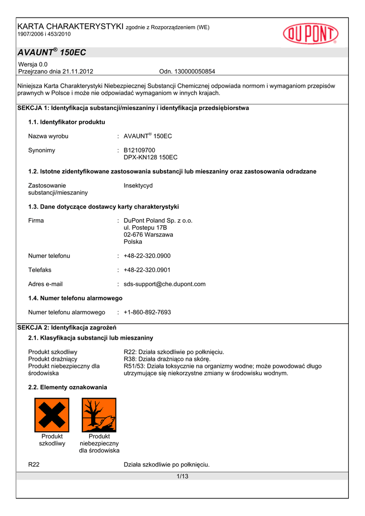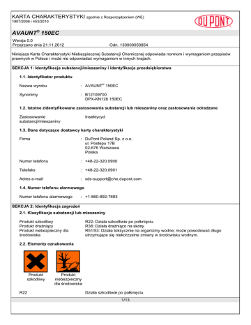 KARTA CHARAKTERYSTYKI zgodnie z Rozporządzeniem (WE) 1907/2006 i 453/2010 AVAUNT® 150EC Wersja 0.0 Przejrzano dnia 21.11.2012 Odn. 130000050854 Niniejsza Karta Charakterystyki Niebezpiecznej Substancji Chemicznej odpowiada normom i wymaganiom przepisów prawnych w Polsce i może nie odpowiadać wymaganiom w innych krajach. SEKCJA 1: Identyfikacja substancji/mieszaniny i identyfikacja przedsiębiorstwa 1.1. Identyfikator produktu Nazwa wyrobu : AVAUNT® 150EC Synonimy : B12109700 DPX-KN128 150EC 1.2. Istotne zidentyfikowane zastosowania substancji lub mieszaniny oraz zastosowania odradzane Zastosowanie substancji/mieszaniny Insektycyd 1.3. Dane dotyczące dostawcy karty charakterystyki Firma : DuPont Poland Sp. z o.o. ul. Postepu 17B 02-676 Warszawa Polska Numer telefonu : +48-22-320.0900 Telefaks : +48-22-320.0901 Adres e-mail : [email protected] 1.4. Numer telefonu alarmowego Numer telefonu alarmowego : +1-860-892-7693 SEKCJA 2: Identyfikacja zagrożeń 2.1. Klasyfikacja substancji lub mieszaniny Produkt szkodliwy Produkt drażniący Produkt niebezpieczny dla środowiska R22: Działa szkodliwie po połknięciu. R38: Działa drażniąco na skórę. R51/53: Działa toksycznie na organizmy wodne; może powodować długo utrzymujące się niekorzystne zmiany w środowisku wodnym. 2.2. Elementy oznakowania Produkt szkodliwy R22 Produkt niebezpieczny dla środowiska Działa szkodliwie po połknięciu. 1/13 KARTA CHARAKTERYSTYKI zgodnie z Rozporządzeniem (WE) 1907/2006 i 453/2010 AVAUNT® 150EC Wersja 0.0 Przejrzano dnia 21.11.2012 Odn. 130000050854 R38 R51/53 Działa drażniąco na skórę. Działa toksycznie na organizmy wodne; może powodować długo utrzymujące się niekorzystne zmiany w środowisku wodnym. Odrębne oznakowanie określonych substancji i mieszanin Aby uniknąć ryzyka dla ludzi i środowiska, stosować się do instrukcji użycia. Składniki uczulające Zawiera: Indoxacarb / Może powodować wystąpienie reakcji alergicznej. S2 S13 S20/21 S24 S37 S46 Chronić przed dziećmi. Nie przechowywać razem z żywnością, napojami i paszami dla zwierząt. Nie jeść i nie pić oraz nie palić tytoniu podczas stosowania produktu. Unikać zanieczyszczenia skóry. Nosić odpowiednie rękawice ochronne. W razie połknięcia niezwłocznie zasięgnij porady lekarza - pokaż opakowanie lub etykietę. Usuwać produkt i jego opakowanie w sposób bezpieczny. Używać odpowiednich pojemników zapobiegających skażeniu środowiska. Nie zanieczyszczać wód produktem lub jego opakowaniem (Nie myć aparatury w pobliżu wód powierzchniowych/Unikać zanieczyszczania wód poprzez rowy odwadniające z gospodarstw i dróg). S35 S57 SP 1 2.3. Inne zagrożenia Ta mieszanina nie zawiera substancji uważanych za trwałe, ulegające bioakumulacji ani toksyczne (PBT). Ta mieszanina nie zawiera substancji uważanych za bardzo trwałe ani ulegających bioakumulacji w dużym stopniu (vPvB). SEKCJA 3: Skład/informacja o składnikach 3.1. Substancje nie dotyczy 3.2. Mieszaniny Numer rejestru Klasyfikacja zgodnie z Dyrektywą 67/548/EWG Indoxacarb (Nr CAS173584-44-6) T;R25 R43 N;R50/53 Klasyfikacja zgodnie z Rozporządzeniem 1272/2008 (CLP) Stężenie Acute Tox. 3; H301 Skin Sens. 1; H317 Aquatic Acute 1; H400 Aquatic Chronic 1; H410 15,84 % Powyższe produkty są zgodne z REACH; Numer(y) rejestracyjny(e) mogą nie być dostarczone ponieważ substancja(e) podlegają wyłączeniu, nie zostały jeszcze zarejestrowane zgodnie z REACH lub zostały zarejestrowane zgodnie z innymi wymogami prawnymi biocydy, środki ochrony roślin), itp. 2/13 KARTA CHARAKTERYSTYKI zgodnie z Rozporządzeniem (WE) 1907/2006 i 453/2010 AVAUNT® 150EC Wersja 0.0 Przejrzano dnia 21.11.2012 Odn. 130000050854 Pełen tekst zwrotów R zawartych w tej Sekcji umieszczonow w Sekcji 16. Pełny tekst zwrotów H przytoczonych w tej Sekcji znajduje się w Sekcji 16. SEKCJA 4: Środki pierwszej pomocy 4.1. Opis środków pierwszej pomocy Porady ogólne : Nieprzytomnej osobie nigdy nie podawać nic doustnie. Wdychanie : Przenieść na świeże powietrze. Zasięgnąć porady lekarza po istotnym narażeniu. Aparat oddechowy i/lub tlen może być niezbędny. Kontakt przez skórę : Natychmiast zdjąć skażone obuwie i ubranie. Natychmiast zmyć mydłem z dużą ilością wody. W przypadku podrażnienia skóry lub reakcji alergicznych udać się do lekarza. Uprać skażone ubranie przed ponownym użyciem. Kontakt z oczami : Jeżeli to możliwe, usunąć szkła kontaktowe, jeżeli są stosowane/ Trzymać oczy otwarte i przemywać wolno i delikatnie wodą przez 15 - 20 minut. Jeśli podrażnienie oczu utrzymuje się, skonsultować się ze specjalistą. Połknięcie : Natychmiast wezwać lekarza lub powiadomić centrum zatruć. NIE wywoływać wymiotów, chyba, że zostało to zalecone przez lekarza lub centrum zatruć. Jeśli ofiara jest przytomna: Wypłukać usta wodą. 4.2. Najważniejsze ostre i opóźnione objawy oraz skutki narażenia Objawy : Nie są znane przypadki zatruć u ludzi i inie są znane objawy zatrucia w warunkach doświadczalnych. 4.3. Wskazania dotyczące wszelkiej natychmiastowej pomocy lekarskiej i szczególnego postępowania z poszkodowanym Kuracja : Leczenie objawowe. SEKCJA 5: Postępowanie w przypadku pożaru 5.1. Środki gaśnicze Odpowiednie środki gaśnicze : Aerozol wodny, Piana, Suche proszki gaśnicze, Dwutlenek węgla (CO2) Środki gaśnicze, które nie są używane ze względów bezpieczeństwa : Silny strumień wody, (ryzyko skażenia) 5.2. Szczególne zagrożenia związane z substancją lub mieszaniną Specyficzne zagrożenia w czasie zwalczania pożaru : W przypadku pożaru tworzą się niebezpieczne produkty rozkładu. Dwutlenek węgla (CO2) tlenki azotu (NOx) 5.3. Informacje dla straży pożarnej Specjalny sprzęt ochronny dla strażaków : W razie pożaru, założyć aparat oddechowy z zamkniętym obiegiem powietrza. Użyć środków ochrony osobistej. 3/13 KARTA CHARAKTERYSTYKI zgodnie z Rozporządzeniem (WE) 
