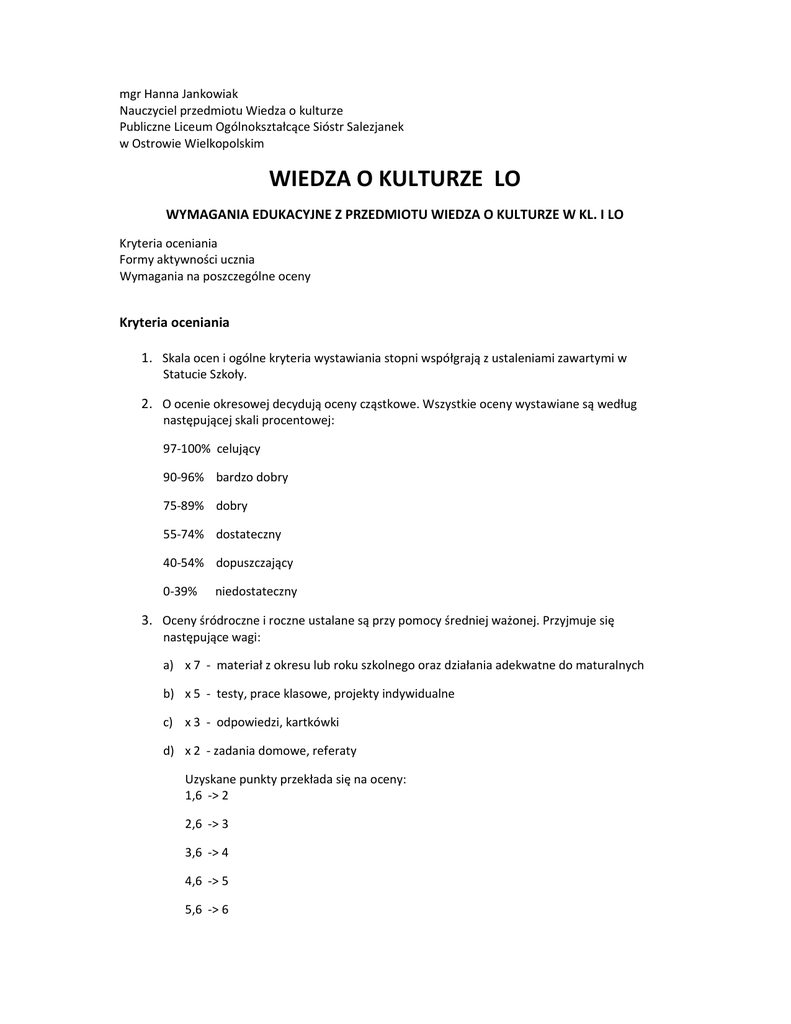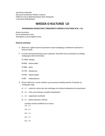 mgr Hanna Jankowiak Nauczyciel przedmiotu Wiedza o kulturze Publiczne Liceum Ogólnokształcące Sióstr Salezjanek w Ostrowie Wielkopolskim WIEDZA O KULTURZE LO WYMAGANIA EDUKACYJNE Z PRZEDMIOTU WIEDZA O KULTURZE W KL. I LO Kryteria oceniania Formy aktywności ucznia Wymagania na poszczególne oceny Kryteria oceniania 1. Skala ocen i ogólne kryteria wystawiania stopni współgrają z ustaleniami zawartymi w Statucie Szkoły. 2. O ocenie okresowej decydują oceny cząstkowe. Wszystkie oceny wystawiane są według następującej skali procentowej: 97-100% celujący 90-96% bardzo dobry 75-89% dobry 55-74% dostateczny 40-54% dopuszczający 0-39% niedostateczny 3. Oceny śródroczne i roczne ustalane są przy pomocy średniej ważonej. Przyjmuje się następujące wagi: a) x 7 - materiał z okresu lub roku szkolnego oraz działania adekwatne do maturalnych b) x 5 - testy, prace klasowe, projekty indywidualne c) x 3 - odpowiedzi, kartkówki d) x 2 - zadania domowe, referaty Uzyskane punkty przekłada się na oceny: 1,6 -> 2 2,6 -> 3 3,6 -> 4 4,6 -> 5 5,6 -> 6 4. W stosunku do ucznia, u którego stwierdzono trudności w uczeniu się lub deficyty rozwojowe uniemożliwiające sprostanie wymaganiom edukacyjnym wynikającym z programu nauczania, nauczyciel zobowiązany jest, na podstawie pisemnej opinii poradni psychologicznopedagogicznej lub innej poradni specjalistycznej, dostosować wymagania programowe. 5. Każdej ocenie towarzyszy wyjaśniający komentarz słowny. 6. Ocena jest zindywidualizowana oraz zależna od możliwości ucznia tak, by uwzględniała jego wkład pracy. 7. Ćwiczenia powinny być wykonywane samodzielnie i w określonym terminie. 8. Materiały do wykonywania ćwiczeń organizują uczniowie we własnym zakresie. 9. W związku z jedną godziną tygodniowo przedmiotu Wiedza o kulturze, uczniom przysługuje jedna „kropka” w ciągu półrocza tzn. możliwość jednego nieprzygotowania do zajęć. Formy aktywności ucznia Na początku roku szkolnego nauczyciel zapoznaje uczniów z zakresem wymagań programowych oraz przedmiotowym systemem oceniania na lekcjach Wiedzy o kulturze. Ocenianie postępów ucznia uwzględnia: 1. Wiedzę i umiejętności: • wiedzę bieżącą, zdobywaną podczas zajęć lekcyjnych, • wiedzę i umiejętności sprawdzane w formie: kartkówek, odpowiedzi ustnych, wypowiedzi pisemnych (analiza i interpretacja dzieł sztuki na poziomie szkolnym), referatów z wykorzystaniem dostępnych źródeł informacji (projekt, prezentacja multimedialna itp.), zadań domowych, ćwiczeń indywidualnych i grupowych (plakat, album, rysunek, plansza kulturowa itp.) 2. Postawę twórczą i aktywność: • zainteresowanie i zaangażowanie w procesie nauki, • udział w dyskusjach i ćwiczeniach lekcyjnych, • postępy w zdobywaniu umiejętności związanych z realizacją programu nauczania, • udział w życiu kulturalnym szkoły i miasta. Wymagania na poszczególne oceny Ocenę celującą otrzymuje uczeń, który: • • • • • • • korzysta z różnych źródeł informacji, osiąga sukcesy w konkursach przedmiotowych na szczeblu rejonowym i wojewódzkim, rozumie pojęcia: kultura narodowa, kultura regionalna, kultura wysoka, kultura niska, kultura elitarna, kultura masowa, kultura popularna, kultura oficjalna, dzieło sztuki, potrafi krytycznie odczytywać kody kultury, rozumie pojęcia tradycji i tożsamości narodowej, samodzielnie znajduje informacje i poszerza wiedzę na temat epok, stylów nurtów i konwencji, gatunków oraz zjawisk zachodzących w kulturze, orientuje się w nowych trendach artystycznych w zakresie wybranych dzieł sztuki i interpretuje te zjawiska, • • interpretuje i analizuje dzieła sztuki, stosując odpowiednią terminologię, oraz ocenia je według odpowiednich kryteriów, umie przeprowadzić analizę porównawczą dzieł sztuki należących do tej samej kategorii, ale pochodzących z odmiennych epok historycznych. Ocenę bardzo dobrą otrzymuje uczeń, który: • • • • • • • rozumie złożoność pojęcia „kultura”, zna i rozumie pojęcia: znak kultury, kod kultury, wymienia najwybitniejszych artystów polskich i światowych danej dziedziny i epoki oraz ich wybrane osiągnięcia (dzieła), orientuje się w nowych trendach artystycznych w zakresie wybranych dzieł sztuki, interpretuje i analizuje dzieła sztuki, stosując odpowiednią terminologię, rozumie potrzebę szanowania dziedzictwa kultury i zna elementarne zasady ochrony dóbr kultury, rozumie istotę telewizji i Internetu oraz wskazuje zalety i wady tych mediów. Ocenę dobrą otrzymuje uczeń, który: • • • • • rozumie pojęcie „kultura”, znak kultury, kod kultury oraz odróżnić wytwory kultury od innych efektów działalności człowieka, wymienia najwybitniejszych artystów polskich i światowych danej dziedziny i epoki oraz niektóre ich dzieła, właściwie stosuje terminy i pojęcia specjalistyczne w różnych dziedzinach sztuki, rozumie potrzebę szanowania dziedzictwa kultury i zna elementarne zasady ochrony dóbr kultury, wskazuje wady i zalety telewizji i Internetu. Ocenę dostateczną otrzymuje uczeń, który: • • • • rozumie pojęcie „kultura”, znak kultury, kod kultury, zna niektóre reprezentatywne dzieła różnych dziedzin i epok kultury narodowej oraz światowej, rozumie potrzebę szanowania dziedzictwa kultury, rozumie znaczenie telewizji i Internetu dla współczesnej kultury oraz podstawowe określenia języka filmowego. Ocenę dopuszczającą otrzymuje uczeń, który: • • • • • rozumie pojęcie „kultura”, odróżnia główne nurty rozwoju sztuki w dziejach kultury, rozumie związki w sztuce i procesach rozwoju kultury, rozumie potrzebę szanowania dziedzictwa kultury, rozumie znaczenie telewizji i Internetu dla współczesnej kultury. Ocenę niedostateczną otrzymuje uczeń, który: • • • • nie zna podstawowych wiadomości i umiejętności wynikających z programu nauczania, 