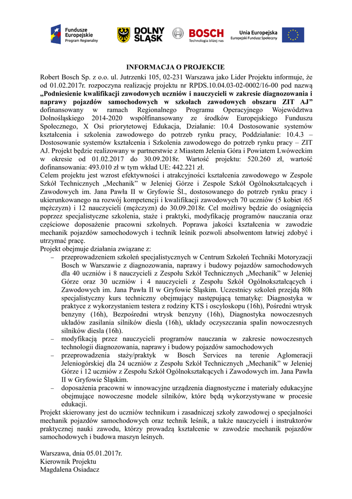 INFORMACJA O PROJEKCIE Robert Bosch Sp. z o.o. ul. Jutrzenki 105, 02-231 Warszawa jako Lider Projektu informuje, że od 01.02.2017r. rozpoczyna realizację projektu nr RPDS.10.04.03-02-0002/16-00 pod nazwą „Podniesienie kwalifikacji zawodowych uczniów i nauczycieli w zakresie diagnozowania i naprawy pojazdów samochodowych w szkołach zawodowych obszaru ZIT AJ” dofinansowany w ramach Regionalnego Programu Operacyjnego Województwa Dolnośląskiego 2014-2020 współfinansowany ze środków Europejskiego Funduszu Społecznego, X Osi priorytetowej Edukacja, Działanie: 10.4 Dostosowanie systemów kształcenia i szkolenia zawodowego do potrzeb rynku pracy, Poddziałanie: 10.4.3 – Dostosowanie systemów kształcenia i Szkolenia zawodowego do potrzeb rynku pracy – ZIT AJ. Projekt będzie realizowany w partnerstwie z Miastem Jelenia Góra i Powiatem Lwóweckim w okresie od 01.02.2017 do 30.09.2018r. Wartość projektu: 520.260 zł, wartość dofinansowania: 493.010 zł w tym wkład UE: 442.221 zł. Celem projektu jest wzrost efektywności i atrakcyjności kształcenia zawodowego w Zespole Szkół Technicznych „Mechanik” w Jeleniej Górze i Zespole Szkół Ogólnokształcących i Zawodowych im. Jana Pawła II w Gryfowie Śl., dostosowanego do potrzeb rynku pracy i ukierunkowanego na rozwój kompetencji i kwalifikacji zawodowych 70 uczniów (5 kobiet /65 mężczyzn) i 12 nauczycieli (mężczyzn) do 30.09.2018r. Cel możliwy będzie do osiągnięcia poprzez specjalistyczne szkolenia, staże i praktyki, modyfikację programów nauczania oraz częściowe doposażenie pracowni szkolnych. Poprawa jakości kształcenia w zawodzie mechanik pojazdów samochodowych i technik leśnik pozwoli absolwentom łatwiej zdobyć i utrzymać pracę. Projekt obejmuje działania związane z: przeprowadzeniem szkoleń specjalistycznych w Centrum Szkoleń Techniki Motoryzacji Bosch w Warszawie z diagnozowania, naprawy i budowy pojazdów samochodowych dla 40 uczniów i 8 nauczycieli z Zespołu Szkół Technicznych „Mechanik” w Jeleniej Górze oraz 30 uczniów i 4 nauczycieli z Zespołu Szkół Ogólnokształcących i Zawodowych im. Jana Pawła II w Gryfowie Śląskim. Uczestnicy szkoleń przejdą 80h specjalistyczny kurs techniczny obejmujący następującą tematykę: Diagnostyka w praktyce z wykorzystaniem testera z rodziny KTS i oscyloskopu (16h), Pośredni wtrysk benzyny (16h), Bezpośredni wtrysk benzyny (16h), Diagnostyka nowoczesnych układów zasilania silników diesla (16h), układy oczyszczania spalin nowoczesnych silników diesla (16h). modyfikacją przez nauczycieli programów nauczania w zakresie nowoczesnych technologii diagnozowania, naprawy i budowy pojazdów samochodowych przeprowadzenia staży/praktyk w Bosch Services na terenie Aglomeracji Jeleniogórskiej dla 24 uczniów z Zespołu Szkół Technicznych „Mechanik” w Jeleniej Górze i 12 uczniów z Zespołu Szkół Ogólnokształcących i Zawodowych im. Jana Pawła II w Gryfowie Śląskim. doposażenia pracowni w innowacyjne urządzenia diagnostyczne i materiały edukacyjne obejmujące nowoczesne modele silników, które będą wykorzystywane w procesie edukacji. Projekt skierowany jest do uczniów technikum i zasadniczej szkoły zawodowej o specjalności mechanik pojazdów samochodowych oraz technik leśnik, a także nauczycieli i instruktorów praktycznej nauki zawodu, którzy prowadzą kształcenie w zawodzie mechanik pojazdów samochodowych i budowa maszyn leśnych. Warszawa, dnia 05.01.2017r. Kierownik Projektu Magdalena Osiadacz