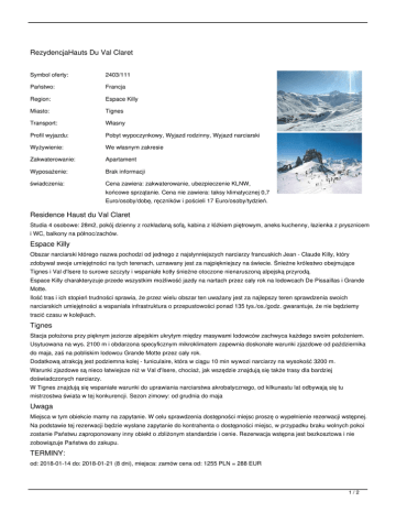 RezydencjaHauts Du Val Claret Symbol oferty: 2403/111 Państwo: Francja Region: Espace Killy Miasto: Tignes Transport: Własny Profil wyjazdu: Pobyt wypoczynkowy, Wyjazd rodzinny, Wyjazd narciarski Wyżywienie: We własnym zakresie Zakwaterowanie: Apartament Wyposażenie: Brak informacji świadczenia: Cena zawiera: zakwaterowanie, ubezpieczenie KLNW, końcowe sprzątanie. Cena nie zawiera: taksy klimatycznej 0,7 Euro/osoby/dobę, ręczników i pościeli 17 Euro/osoby/tydzień. Residence Haust du Val Claret Studia 4 osobowe: 28m2, pokój dzienny z rozkładaną sofą, kabina z łóżkiem piętrowym, aneks kuchenny, łazienka z prysznicem i WC, balkony na północ/zachów. Espace Killy Obszar narciarski którego nazwa pochodzi od jednego z najsłynniejszych narciarzy francuskich Jean - Claude Killy, który zdobywał swoje umiejętności na tych terenach, uznawany jest za najpiękniejszy na świecie. Śnieżne królestwo obejmujące Tignes i Val d'Isere to surowe szczyty i wspaniałe kotły śnieżne otoczone nienaruszoną alpejską przyrodą. Espace Killy charakteryzuje przede wszystkim możliwość jazdy na nartach przez cały rok na lodowcach De Pissaillas i Grande Motte. Ilość tras i ich stopień trudności sprawia, że przez wielu obszar ten uważany jest za najlepszy teren sprawdzenia swoich narciarskich umiejętności a wspaniała infrastruktura o przepustowości ponad 135 tys./os./godz. gwarantuje, że nie będziemy tracić czasu w kolejkach. Tignes Stacja położona przy pięknym jeziorze alpejskim ukrytym między masywami lodowców zachwyca każdego swoim położeniem. Usytuowana na wys. 2100 m i obdarzona specyficznym mikroklimatem zapewnia doskonałe warunki zjazdowe od października do maja, zaś na pobliskim lodowcu Grande Motte przez cały rok. Dodatkową atrakcją jest podziemna kolej - funiculaire, która w ciągu 10 min wywozi narciarzy na wysokość 3200 m. Warunki zjazdowe są nieco łatwiejsze niż w Val d'Isere, chociaż, jak wszędzie znajdują się także trasy dla bardziej doświadczonych narciarzy. W Tignes znajdują się wspaniałe warunki do uprawiania narciarstwa akrobatycznego, od kilkunastu lat odbywają się tu mistrzostwa świata w tej konkurencji. Sezon zimowy: od grudnia do maja Uwaga Miejsca w tym obiekcie mamy na zapytanie. W celu sprawdzenia dostępności miejsc proszę o wypełnienie rezerwacji wstępnej. Na podstawie tej rezerwacji będzie wysłane zapytanie do kontrahenta o dostępności miejsc, w przypadku braku wolnych pokoi zostanie Państwu zaproponowany inny obiekt o zbliżonym standardzie i cenie. Rezerwacja wstępna jest bezkosztowa i nie zobowiązuje Państwa do zakupu. TERMINY: od: 2018-01-14 do: 2018-01-21 (8 dni), miejsca: zamów cena od: 1255 PLN = 288 EUR 1/2 od: 2018-01-14 do: 2018-01-28 (15 dni), miejsca: zamów cena od: 2511 PLN = 577 EUR od: 2018-01-21 do: 2018-01-28 (8 dni), miejsca: zamów cena od: 1255 PLN = 288 EUR od: 2018-01-21 do: 2018-02-04 (15 dni), miejsca: zamów cena od: 2840 PLN = 652 EUR od: 2018-01-28 do: 2018-02-04 (8 dni), miejsca: zamów cena od: 1584 PLN = 364 EUR od: 2018-01-28 do: 2018-02-11 (15 dni), miejsca: zamów cena od: 3169 PLN = 728 EUR od: 2018-02-04 do: 2018-02-11 (8 dni), miejsca: zamów cena od: 1584 PLN = 364 EUR od: 2018-02-04 do: 2018-02-18 (15 dni), miejsca: zamów cena od: 3169 PLN = 728 EUR od: 2018-02-11 do: 2018-02-18 (8 dni), miejsca: zamów cena od: 1584 PLN = 364 EUR CENNIK: Długość pobytu: 8 dni 15 dni 15 dni 8 dni Grupa cenowa: I I G G 3938 1969 1068 534 Pobyt w obiekcie (do wyboru) (*) Pobyt w apartamencie 4pokojowym dla 7 osób standardowo dla osób: 7 2498 4996 studio 4-osobowe standardowo dla osób: 4 660 1320 Ubezpieczenie (do wyboru) ubezpieczene NWKL SKI (*) ubezpieczenie NW KL Ubezpieczenie (opcjonalne) 15 30 30 15 7 14 14 7 2.4 % 2.4 % 2.4 % ubezpieczenie - od kosztów rezygnacji 2.4 % Waluta: EUR Aktualne ceny z systemu S.A.R.T. (-) - cena usługi, podatku kalkulowana przy osobie lub gratis (*) - kwota wliczona w cenę standardową 2/2