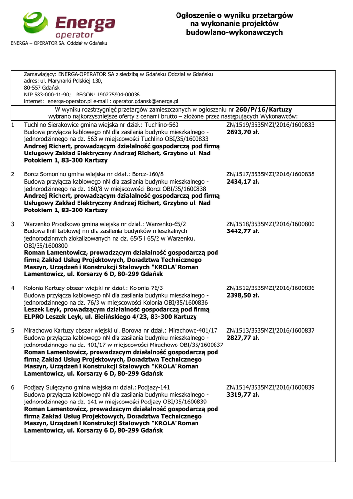 Ogłoszenie o wyniku przetargów na wykonanie projektów budowlano-wykonawczych ENERGA – OPERATOR SA. Oddział w Gdańsku Zamawiający: ENERGA-OPERATOR SA z siedzibą w Gdańsku Oddział w Gdańsku adres: ul. Marynarki Polskiej 130, 80-557 Gdańsk NIP 583-000-11-90; REGON: 190275904-00036 internet: energa-operator.pl e-mail : [email protected] 1 W wyniku rozstrzygnięć przetargów zamieszczonych w ogłoszeniu nr 260/P/16/Kartuzy wybrano najkorzystniejsze oferty z cenami brutto – złożone przez następujących Wykonawców: Tuchlino Sierakowice gmina wiejska nr dział.: Tuchlino-563 ZN/1519/3535MZI/2016/1600833 Budowa przyłącza kablowego nN dla zasilania budynku mieszkalnego 2693,70 zł. jednorodzinnego na dz. 563 w miejscowości Tuchlino OBI/35/1600833 Andrzej Richert, prowadzącym działalność gospodarczą pod firmą Usługowy Zakład Elektryczny Andrzej Richert, Grzybno ul. Nad Potokiem 1, 83-300 Kartuzy 2 Borcz Somonino gmina wiejska nr dział.: Borcz-160/8 Budowa przyłącza kablowego nN dla zasilania budynku mieszkalnego jednorodzinnego na dz. 160/8 w miejscowości Borcz OBI/35/1600838 Andrzej Richert, prowadzącym działalność gospodarczą pod firmą Usługowy Zakład Elektryczny Andrzej Richert, Grzybno ul. Nad Potokiem 1, 83-300 Kartuzy ZN/1517/3535MZI/2016/1600838 2434,17 zł. 3 Warzenko Przodkowo gmina wiejska nr dział.: Warzenko-65/2 Budowa linii kablowej nn dla zasilenia budynków mieszkalnych jednorodzinnych zlokalizowanych na dz. 65/5 i 65/2 w Warzenku. OBI/35/1600800 Roman Lamentowicz, prowadzącym działalność gospodarczą pod firmą Zakład Usług Projektowych, Doradztwa Technicznego Maszyn, Urządzeń i Konstrukcji Stalowych "KROLA"Roman Lamentowicz, ul. Korsarzy 6 D, 80-299 Gdańsk ZN/1518/3535MZI/2016/1600800 3442,77 zł. 4 Kolonia Kartuzy obszar wiejski nr dział.: Kolonia-76/3 Budowa przyłącza kablowego nN dla zasilania budynku mieszkalnego jednorodzinnego na dz. 76/3 w miejscowości Kolonia OBI/35/1600836 Leszek Leyk, prowadzącym działalność gospodarczą pod firmą ELPRO Leszek Leyk, ul. Bielińskiego 4/23, 83-300 Kartuzy ZN/1512/3535MZI/2016/1600836 2398,50 zł. 5 Mirachowo Kartuzy obszar wiejski ul. Borowa nr dział.: Mirachowo-401/17 ZN/1513/3535MZI/2016/1600837 Budowa przyłącza kablowego nN dla zasilania budynku mieszkalnego 2827,77 zł. jednorodzinnego na dz. 401/17 w miejscowości Mirachowo OBI/35/1600837 Roman Lamentowicz, prowadzącym działalność gospodarczą pod firmą Zakład Usług Projektowych, Doradztwa Technicznego Maszyn, Urządzeń i Konstrukcji Stalowych "KROLA"Roman Lamentowicz, ul. Korsarzy 6 D, 80-299 Gdańsk 6 Podjazy Sulęczyno gmina wiejska nr dział.: Podjazy-141 Budowa przyłącza kablowego nN dla zasilania budynku mieszkalnego jednorodzinnego na dz. 141 w miejscowości Podjazy OBI/35/1600839 Roman Lamentowicz, prowadzącym działalność gospodarczą pod firmą Zakład Usług Projektowych, Doradztwa Technicznego Maszyn, Urządzeń i Konstrukcji Stalowych "KROLA"Roman Lamentowicz, ul. Korsarzy 6 D, 80-299 Gdańsk ZN/1514/3535MZI/2016/1600839 3319,77 zł. Ogłoszenie o wyniku przetargów na wykonanie projektów budowlano-wykonawczych ENERGA – OPERATOR SA. Oddział w Gdańsku 7 Przyjaźń Żukowo obszar wiejski nr dział.: Przyjaźń-225/19 Budowa przyłącza kablowego nn dla zasilenia budynku mieszkalnego zlokalizowanego na dz. 225/19 w Przyjaźni. OBI/35/1600801 Roman Lamentowicz, prowadzącym działalność gospodarczą pod firmą Zakład Usług Projektowych, Doradztwa Technicznego Maszyn, Urządzeń i Konstrukcji Stalowych "KROLA"Roman Lamentowicz, ul. Korsarzy 6 D, 80-299 Gdańsk ZN/1515/3535MZI/2016/1600801 2827,77 zł. 8 Starkowa Huta Somonino gmina wiejska nr dział.: Starkowa Huta-29/10 Budowa przyłącza kablowego nN dla zasilania budynku mieszkalnego jednorodzinnego na dz. 29/10 w miejscowości Starkowa Huta OBI/35/1600835 Roman Lamentowicz, prowadzącym działalność gospodarczą pod firmą Zakład Usług Projektowych, Doradztwa Technicznego Maszyn, Urządzeń i Konstrukcji Stalowych "KROLA"Roman Lamentowicz, ul. Korsarzy 6 D, 80-299 Gdańsk ZN/1516/3535MZI/2016/1600835 2520,27 zł. Sporządził(a): Małgorzata Kosmala Gdańsk, dnia .............................................................. /podpis/