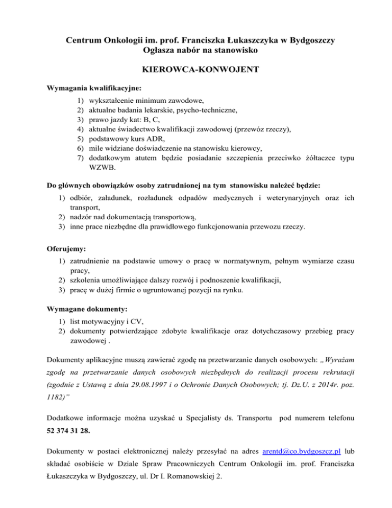 Centrum Onkologii im. prof. Franciszka Łukaszczyka w Bydgoszczy Ogłasza nabór na stanowisko KIEROWCA-KONWOJENT Wymagania kwalifikacyjne: 1) 2) 3) 4) 5) 6) 7) wykształcenie minimum zawodowe, aktualne badania lekarskie, psycho-techniczne, prawo jazdy kat: B, C, aktualne świadectwo kwalifikacji zawodowej (przewóz rzeczy), podstawowy kurs ADR, mile widziane doświadczenie na stanowisku kierowcy, dodatkowym atutem będzie posiadanie szczepienia przeciwko żółtaczce typu WZWB. Do głównych obowiązków osoby zatrudnionej na tym stanowisku należeć będzie: 1) odbiór, załadunek, rozładunek odpadów medycznych i weterynaryjnych oraz ich transport, 2) nadzór nad dokumentacją transportową, 3) inne prace niezbędne dla prawidłowego funkcjonowania przewozu rzeczy. Oferujemy: 1) zatrudnienie na podstawie umowy o pracę w normatywnym, pełnym wymiarze czasu pracy, 2) szkolenia umożliwiające dalszy rozwój i podnoszenie kwalifikacji, 3) pracę w dużej firmie o ugruntowanej pozycji na rynku. Wymagane dokumenty: 1) list motywacyjny i CV, 2) dokumenty potwierdzające zdobyte kwalifikacje oraz dotychczasowy przebieg pracy zawodowej . Dokumenty aplikacyjne muszą zawierać zgodę na przetwarzanie danych osobowych: „Wyrażam zgodę na przetwarzanie danych osobowych niezbędnych do realizacji procesu rekrutacji (zgodnie z Ustawą z dnia 29.08.1997 i o Ochronie Danych Osobowych; tj. Dz.U. z 2014r. poz. 1182)” Dodatkowe informacje można uzyskać u Specjalisty ds. Transportu pod numerem telefonu 52 374 31 28. Dokumenty w postaci elektronicznej należy przesyłać na adres [email protected] lub składać osobiście w Dziale Spraw Pracowniczych Centrum Onkologii im. prof. Franciszka Łukaszczyka w Bydgoszczy, ul. Dr I. Romanowskiej 2.