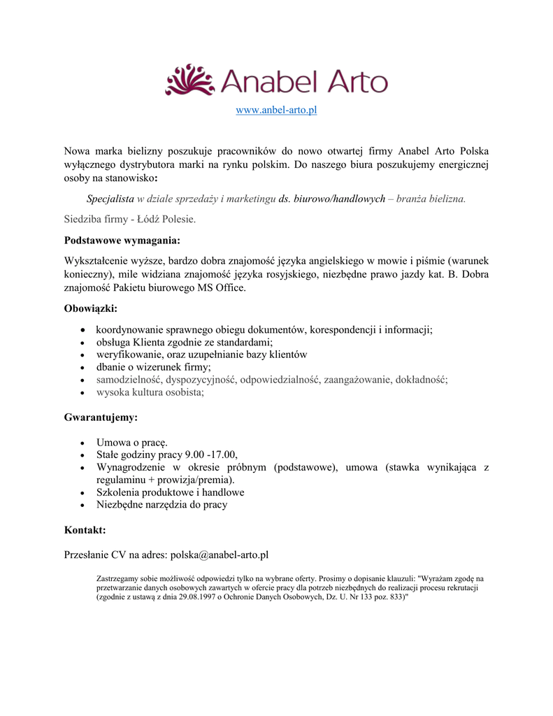 www.anbel-arto.pl Nowa marka bielizny poszukuje pracowników do nowo otwartej firmy Anabel Arto Polska wyłącznego dystrybutora marki na rynku polskim. Do naszego biura poszukujemy energicznej osoby na stanowisko: Specjalista w dziale sprzedaży i marketingu ds. biurowo/handlowych – branża bielizna. Siedziba firmy - Łódź Polesie. Podstawowe wymagania: Wykształcenie wyższe, bardzo dobra znajomość języka angielskiego w mowie i piśmie (warunek konieczny), mile widziana znajomość języka rosyjskiego, niezbędne prawo jazdy kat. B. Dobra znajomość Pakietu biurowego MS Office. Obowiązki: koordynowanie sprawnego obiegu dokumentów, korespondencji i informacji; obsługa Klienta zgodnie ze standardami; weryfikowanie, oraz uzupełnianie bazy klientów dbanie o wizerunek firmy; samodzielność, dyspozycyjność, odpowiedzialność, zaangażowanie, dokładność; wysoka kultura osobista; Gwarantujemy: Umowa o pracę. Stałe godziny pracy 9.00 -17.00, Wynagrodzenie w okresie próbnym (podstawowe), umowa (stawka wynikająca z regulaminu + prowizja/premia). Szkolenia produktowe i handlowe Niezbędne narzędzia do pracy Kontakt: Przesłanie CV na adres: [email protected] Zastrzegamy sobie możliwość odpowiedzi tylko na wybrane oferty. Prosimy o dopisanie klauzuli: "Wyrażam zgodę na przetwarzanie danych osobowych zawartych w ofercie pracy dla potrzeb niezbędnych do realizacji procesu rekrutacji (zgodnie z ustawą z dnia 29.08.1997 o Ochronie Danych Osobowych, Dz. U. Nr 133 poz. 833)"