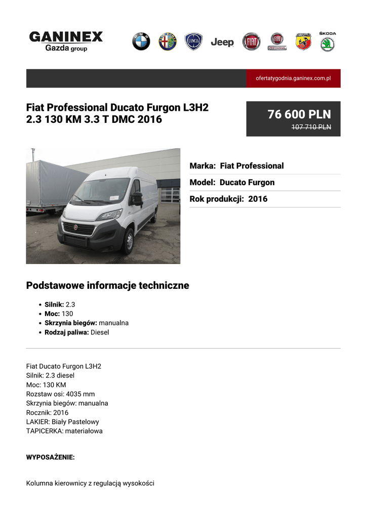 ofertatygodnia.ganinex.com.pl Fiat Professional Ducato Furgon L3H2 2.3 130 KM 3.3 T DMC 2016 76 600 PLN Marka: Fiat Professional Model: Ducato Furgon Rok produkcji: 2016 Podstawowe informacje techniczne Silnik: 2.3 Moc: 130 Skrzynia biegów: manualna Rodzaj paliwa: Diesel Fiat Ducato Furgon L3H2 Silnik: 2.3 diesel Moc: 130 KM Rozstaw osi: 4035 mm Skrzynia biegów: manualna Rocznik: 2016 LAKIER: Biały Pastelowy TAPICERKA: materiałowa WYPOSAŻENIE: Kolumna kierownicy z regulacją wysokości 107 710 PLN Wspomaganie kierownicy Szyby przednie sterowane elektrycznie Szyby atermiczne Reflektory halogenowe Immobiliser Fiat Code Podłokietnik i regulacja lędźwiowa siedzenia kierowcy Trwała przegroda z blachy z centralnie umieszczoną szybą Centralny zamek Dwumiejscowe siedzenie pasażerów Fotel kierownicy z regulacją wysokości Zagłówki z regulacją wysokości Bezwładnościowe 3-punktowe pasy bezpieczeństwa przy wszystkich fotelach Instalacja do radia bez anteny i głośników Trzecie światło stop Homologacja EURO5+ System podtrzymujący koło zapasowe Blow by podgrzewany Pakiet SX PLUS: Klimatyzacja manualna Boczne lusterka regulowane elektrycznie i podgrzewane Deska rozdzielcza "TECHNO" Radio UCONNECT z ekranem dotykowym 5" Półka pod sufitem Podana cena jest ceną netto Katowice Katowice (Škoda) Pszczyna Gliwice Gliwice (BMW) al. Roździeńskiego 170 tel. 32 351 27 50 al. Roździeńskiego 182 tel. 32 203 66 00 ul. Bielska 31c tel. 32 210 10 00 ul. Pszczyńska 306 tel. 32 230 17 30 ul. Pszczyńska 322 tel. 32 700 10 00
