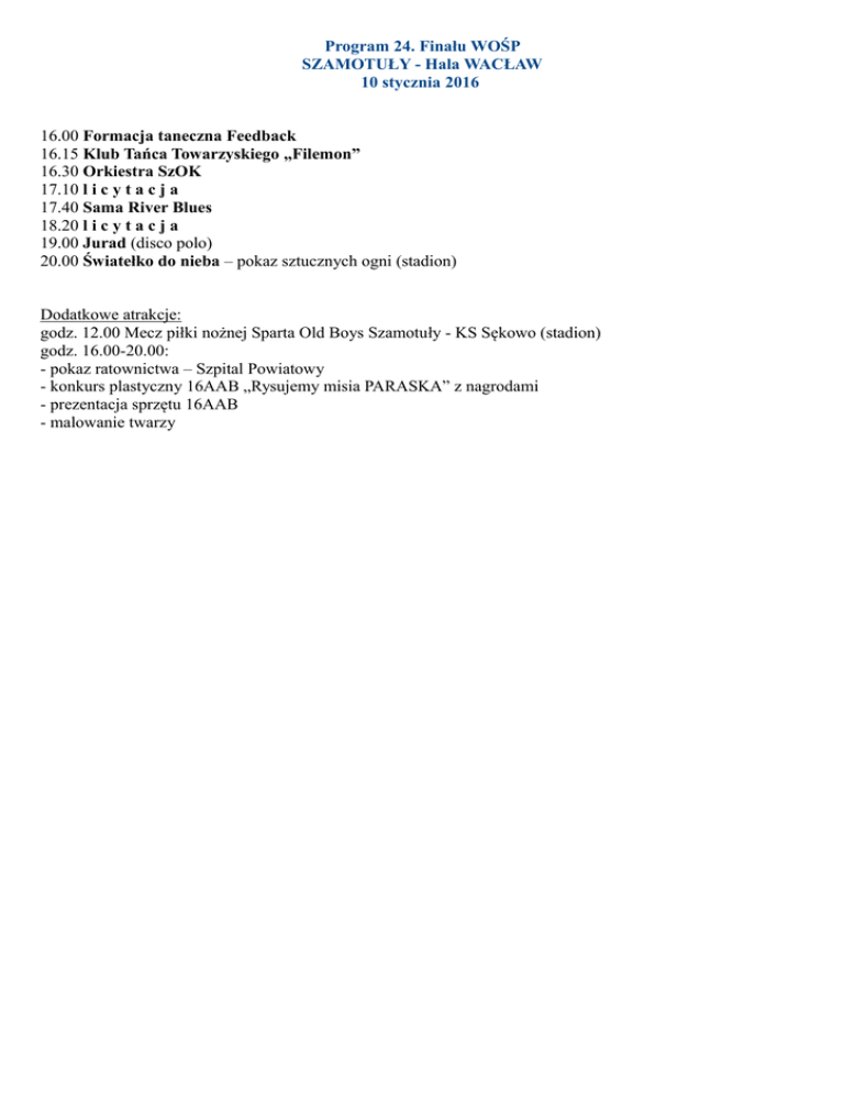Program 24. Finału WOŚP SZAMOTUŁY - Hala WACŁAW 10 stycznia 2016 16.00 Formacja taneczna Feedback 16.15 Klub Tańca Towarzyskiego „Filemon” 16.30 Orkiestra SzOK 17.10 l i c y t a c j a 17.40 Sama River Blues 18.20 l i c y t a c j a 19.00 Jurad (disco polo) 20.00 Światełko do nieba – pokaz sztucznych ogni (stadion) Dodatkowe atrakcje: godz. 12.00 Mecz piłki nożnej Sparta Old Boys Szamotuły - KS Sękowo (stadion) godz. 16.00-20.00: - pokaz ratownictwa – Szpital Powiatowy - konkurs plastyczny 16AAB „Rysujemy misia PARASKA” z nagrodami - prezentacja sprzętu 16AAB - malowanie twarzy