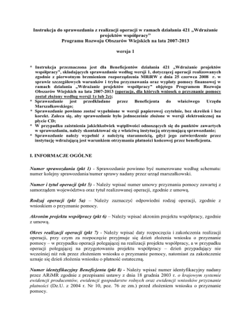 Instrukcja do sprawozdania z realizacji operacji w ramach działania 421 „Wdrażanie projektów współpracy” Programu Rozwoju Obszarów Wiejskich na lata 2007-2013 wersja 1 * Instrukcja przeznaczona jest dla Beneficjentów działania 421 „Wdrażanie projektów współpracy”, składających sprawozdanie według wersji 1, dotyczącej operacji realizowanych zgodnie z pierwotnym brzmieniem rozporządzenia MRiRW z dnia 25 czerwca 2008 r. w sprawie szczegółowych warunków i trybu przyznawania oraz wypłaty pomocy finansowej w ramach działania „Wdrażanie projektów współpracy” objętego Programem Rozwoju Obszarów Wiejskich na lata 2007-2013 (operacje, dla których wniosek o przyznanie pomocy został złożony według wersji 1z lub 2z); * Sprawozdanie jest przedkładane przez Beneficjenta do właściwego Urzędu Marszałkowskiego; * Sprawozdanie powinno zostać wypełnione w wersji papierowej czytelnie, bez skreśleń i bez korekt. Zaleca się, aby sprawozdanie było jednocześnie złożone w wersji elektronicznej na płycie CD; * W przypadku zaistnienia jakichkolwiek wątpliwości odnoszących się do punktów zawartych w sprawozdaniu, należy skontaktować się z właściwą instytucją otrzymującą sprawozdanie; * Sprawozdanie należy wypełnić z należytą starannością, gdyż jego zatwierdzenie przez instytucję wdrażającą jest warunkiem otrzymania płatności końcowej przez beneficjenta. I. INFORMACJE OGÓLNE Numer sprawozdania (pkt 1) - Sprawozdanie powinno być numerowane według schematu: numer kolejny sprawozdania/numer sprawy nadany przez urząd marszałkowski. Numer i tytuł operacji (pkt 5) - Należy wpisać numer umowy przyznania pomocy zawartej z samorządem województwa oraz tytuł realizowanej operacji, zgodnie z umową. Rodzaj operacji (pkt 5a) – Należy zaznaczyć odpowiedni rodzaj operacji, zgodnie z wnioskiem o przyznanie pomocy. Akronim projektu współpracy (pkt 6) – Należy wpisać akronim projektu współpracy, zgodnie z umową. Okres realizacji operacji (pkt 7) - Należy wpisać daty rozpoczęcia i zakończenia realizacji operacji, przy czym za rozpoczęcie przyjmuje się dzień złożenia wniosku o przyznanie pomocy – w przypadku operacji polegającej na realizacji projektu współpracy, a w przypadku operacji polegającej na przygotowaniu projektu współpracy – dzień przypadający nie wcześniej niż rok przez złożeniem wniosku o przyznanie pomocy, natomiast za zakończenie uznaje się dzień złożenia wniosku o płatność ostateczną. Numer identyfikacyjny Beneficjenta (pkt 8) - Należy wpisać numer identyfikacyjny nadany przez ARiMR zgodnie z przepisami ustawy z dnia 18 grudnia 2003 r. o krajowym systemie ewidencji producentów, ewidencji gospodarstw rolnych oraz ewidencji wniosków przyznanie płatności (Dz.U. z 2004 r. Nr 10, poz. 76 ze zm.) przed złożeniem wniosku o przyznanie pomocy. Nazwa Beneficjenta (pkt 9) - Należy wpisać nazwę Beneficjenta pomocy, zgodnie z umową przyznania pomocy. Adres Beneficjenta (pkt 10) - Należy wpisać adres Beneficjenta pomocy wskazany w umowie przyznania pomocy. Osoba uprawniona do kontaktu (pkt 11-13) - Należy wpisać imię (imiona) i nazwisko, miejsce zamieszkania i adres osoby przygotowującej sprawozdanie lub innej osoby upoważnionej, która jest w stanie udzielić informacji na temat sprawozdania, jej numer telefonu oraz adres poczty elektronicznej. W przypadku operacji polegającej na realizacji projektu współpracy będzie to koordynator projektu współpracy (jeżeli dana LGD jest koordynującą LGD) lub osoba współpracująca z koordynatorem (jeżeli dana LGD nie jest koordynującą LGD). W przypadku, gdy Beneficjent ustanowił pełnomocnika, dane pełnomocnika należy również podać w tym punkcie. II. INFORMACJE DOTYCZĄCE PRZEBIEGU REALIZACJI OPERACJI ORAZ REALIZACJI PLANU RZECZOWEGO Należy opisać w kilku zdaniach główne etapy przebiegu realizacji operacji. Należy skoncentrować się na zadaniach wynikających z harmonogramu, przyjętego w umowie (uwzględniając ewentualne korekty harmonogramu wynikłe z podpisanych aneksów). W przypadku operacji jednoetapowych, wszelkie informacje należy podać tylko w wierszu „I”. W przypadku operacji realizowanych w więcej niż jednym etapie, należy dokonać rozbicia na etapy realizacji. III. INFORMACJA O NAPOTKANYCH PROBLEMACH Należy opisać problemy powstałe podczas realizacji operacji (o ile się pojawiły) wraz z informacją o podjętych działaniach naprawczych, uwzględniając w szczególności zmiany, jakie zaistniały w wyniku tych problemów w stosunku do oryginalnego zakresu operacji (zawartego w umowie) oraz wpływ, jaki wywarły na jej realizację. Należy koniecznie zawrzeć informację, czy w trakcie realizacji operacji wprowadzono zmianę/y harmonogramu rzeczowo-finansowego operacji. W przypadku zawarcia aneksu/ów do umowy, należy podać datę zawarcia i numer każdego aneksu. Należy opisać także te zmiany, które nie wymagały zawarcia aneksu do umowy. W przypadku, gdy nie wystąpiły problemy podczas realizacji operacji, należy zamieścić stwierdzenie o niewystąpieniu problemów w trakcie realizacji operacji (np. „Brak”, natomiast nie należy wpisywać myślnika lub zwrotu „Brak danych”) IV. OŚWIADCZENIE BENEFICJENTA Oświadczenie podpisuje beneficjent lub osoba upoważniona do występowania w imieniu Beneficjenta.