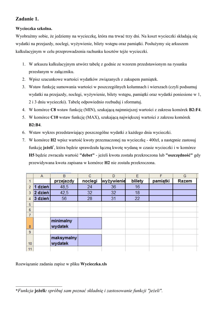 Zadanie 1. Wycieczka szkolna. Wyobraźmy sobie, że jedziemy na wycieczkę, która ma trwać trzy dni. Na koszt wycieczki składają się wydatki na przejazdy, noclegi, wyżywienie, bilety wstępu oraz pamiątki. Posłużymy się arkuszem kalkulacyjnym w celu przeprowadzenia rachunku kosztów tejże wycieczki. 1. W arkuszu kalkulacyjnym utwórz tabelę z godnie ze wzorem przedstawionym na rysunku przesłanym w załączniku. 2. Wpisz szacunkowe wartości wydatków związanych z zakupem pamiątek. 3. Wstaw funkcję sumowania wartości w poszczególnych kolumnach i wierszach (czyli podsumuj wydatki na przejazdy, noclegi, wyżywienie, bilety wstępu, pamiątki oraz wydatki poniesione w 1, 2 i 3 dniu wycieczki). Tabelę odpowiednio rozbuduj i sformatuj. 4. W komórce C8 wstaw funkcję (MIN), szukającą najmniejszej wartości z zakresu komórek B2:F4. 5. W komórce C10 wstaw funkcję (MAX), szukającą największej wartości z zakresu komórek B2:B4. 6. Wstaw wykres przedstawiający poszczególne wydatki z każdego dnia wycieczki. 7. W komórce H2 wpisz wartość kwoty przeznaczonej na wycieczkę - 400zł, a następnie zastosuj funkcję jeżeli*, która będzie sprawdzała łączną kwotę wydaną w czasie wycieczki i w komórce H5 będzie zwracała wartość "debet" - jeżeli kwota została przekroczona lub "oszczędność" gdy przewidywana kwota zapisana w komórce H2 nie została przekroczona. Rozwiązanie zadania zapisz w pliku Wycieczka.xls *Funkcja jeżeli: spróbuj sam poznać składnię i zastosowanie funkcji "jeżeli". Zadanie 2: Figury geometryczne. Arkusz kalkulacyjny może pomóc w rozwiązywaniu zadań matematycznych. W ćwiczeniu tym obliczysz pole prostokąta, a następnie samodzielnie zaprojektujesz arkusz do obliczania pól innych figur geometrycznych. 1. Uruchom arkusz kalkulacyjny. 2. Następnie wprowadź do arkusza dane jak na poniższym rysunku. 3. W komórce B4 trzeba wpisać formułę, za pomocą której zostanie obliczone pole prostokąta. Należy skorzystać z adresowania bezwzględnego, aby przy ewentualnym przenoszeniu danych komórek obliczenia nie uległy zmianie. Formuła będzie wyglądała następująco: =$B$2*$B$3. W komórce B4 dla powyższych wartości uzyskasz wynik 28. (Symbol dolara $ określa adresowanie bezwzględne, można powiedzieć usztywnia adresy. O adresowaniu bezwzględnym i względnym poszukaj w zasobach Internetu.) 4. Sprawdź poprawność działania formuły zmieniając długości boków a i b. 5. Wprowadź do arkusza obliczenia pól innych figur geometrycznych. 6. Zmień nazwę Arkusz1 na Pola figur. 7. Zacieniuj komórki oraz wprowadź formatowania. 8. Wstaw dwa wiersze powyżej wiersza pierwszego (zaznacz pierwszy wiersz, z menu Wstaw wybierz Wiersz - czynność powtórz 2 razy. 9. Ustaw się w pierwszym wierszu i wpisz tekst: Obliczenia pól wybranych figur geometrycznych. 10. Zaznacz tekst, czcionkę zmień na Tahoma o rozmiarze 16, koloru zielonego. 11. Korzystają z narzędzi do rysowania zilustruj każdą figurę geometryczną odpowiednim rysunkiem. 12. Zapisz wyniki pracy do pliku Figury.xls. (Jeżeli zadanie wykonujesz w OpenOffice.org również wyniki pracy zapisz do pliku Figury.xls.) Zadanie 3. Droga. Wójt pewniej gminy ogłosił przetarg na wykonanie drogi liczącej łącznie 20 kilometrów. Do realizacji tego projektu zgłosiły się dwie konkurencyjne firmy. Firma „A" za wykonanie pierwszego kilometra drogi zażądała 2000 zł, a za każdy następny kilometr o 500 zł więcej niż za poprzedni, zaś firma „B" wykonanie pierwszego kilometra wyceniła na 2 zł, a za każdy następny kilometr chciała otrzymać dwa razy więcej niż za poprzedni. 1. Ofertę której firmy powinien zaakceptować oszczędny wójt? 2. Ile zapłaci on za wykonanie drogi? Wykonaj potrzebne obliczenia wpisując odpowiednie FORMUŁY do arkusza kalkulacyjnego. Plik z rozwiązaniem zadania zapisz pod nazwą droga.xls.