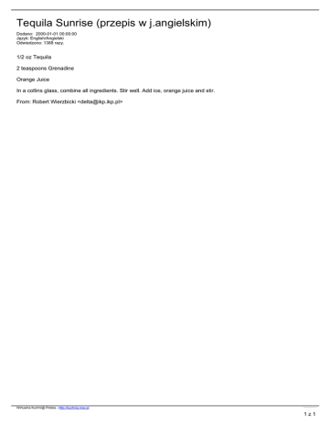 Tequila Sunrise (przepis w j.angielskim) Dodano: 2000-01-01 00:00:00 Język: English/Angielski Odwiedzono: 1388 razy. 1/2 oz Tequila 2 teaspoons Grenadine Orange Juice In a collins glass, combine all ingredients. Stir well. Add ice, orange juice and stir. From: Robert Wierzbicki <[email protected]> Wirtualna Kuchni@ Polska - http://kuchnia.now.pl przepis nr 3581, plik wygenerowano 2017.03.07 10:48 1z1