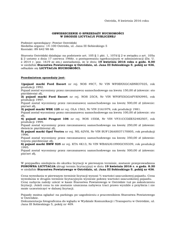 Ostróda, 8 kwietnia 2016 roku OBWIESZCZENIE O SPRZEDAŻY RUCHOMOŚCI W DRODZE LICYTACJI PUBLICZNEJ Podmiot sprzedający: Powiat Ostródzki Siedziba organu: 14-100 Ostróda, ul. Jana III Sobieskiego 5 Kontakt: 89 642 98 66 Starosta Ostródzki działając na podstawie art. 105 § 1 pkt. 1, 107d § 2 w związku z art. 105a § 2 ustawy z dnia 17 czerwca 1966r. o postępowaniu egzekucyjnym w administracji (Dz. U. z 2014 r. poz. 1619 ze zm.) zawiadamia, że w dniu 19 kwietnia 2016 roku o godz. 8.00 w siedzibie Starostwa Powiatowego w Ostródzie, ul. Jana III Sobieskiego 5, pokój nr 436, odbędzie się LICYTACJA RUCHOMOŚCI. Przedmiotem sprzedaży jest: 1)pojazd marki Ford Escort nr rej. NOS 49C7, Nr VIN WF0BXXGCABNR37025, rok produkcji 1992. Pojazd został wyceniony przez rzeczoznawcę samochodowego na kwotę 150,00 zł (słownie: sto pięćdziesiąt zł), 2) pojazd marki Ford Escort nr rej. NOS 25C8, Nr VIN WF0FXXGGAFVK92995, rok produkcji 1997. Pojazd został wyceniony przez rzeczoznawcę samochodowego na kwotę 500,00 zł (słownie: pięćset zł), 3) pojazd marki WSK 125 nr rej. OLA 1563, Nr VIN 2161979, rok produkcji 1981. Pojazd został wyceniony przez rzeczoznawcę samochodowego na kwotę 100,00 zł (słownie: sto zł), 4) pojazd marki Peugeot 106 nr rej. NOS 15XM, Nr VIN VF31CCDZE52482507, rok produkcji 1999. Pojazd został wyceniony przez rzeczoznawcę samochodowego na kwotę 250,00 zł (słownie: dwieście pięćdziesiąt zł), 5) pojazd marki Opel Vectra nr rej. NIL 62VH, Nr VIN SUF126A0037170005, rok produkcji 1996. Pojazd został wyceniony przez rzeczoznawcę samochodowego na kwotę 350,00 zł (słownie: trzysta pięćdziesiąt zł), 6) pojazd marki BMW 525 nr rej. KTA 4K13, Nr VIN WBAHJ61090GC05339, rok produkcji 1995. Pojazd został wyceniony przez rzeczoznawcę samochodowego na kwotę 500,00 zł (słownie: pięćset zł), W przypadku niedojścia do skutku licytacji w pierwszym terminie, zostanie przeprowadzona PONOWNA LICYTACJA (drugi termin licytacyjny) w dniu 19 kwietnia 2016 r. o godz. 8.30 w siedzibie Starostwa Powiatowego w Ostródzie, ul. Jana III Sobieskiego 5, pokój nr 436. Cena wywołania w pierwszym terminie licytacji wynosi ¾ wartości szacunkowej pojazdu. Cena wywołania w drugim terminie licytacyjnym wyniesie połowę wartości szacunkowej pojazdu. Cenę nabycia należy uiścić w kasie Starostwa Powiatowego w Ostródzie tuż po zakończeniu licytacji. Jeżeli cena ta nie zostanie uiszczona nabywca traci prawo wynikłe z przybicia i nie może uczestniczyć w dalszej licytacji. Pojazdy można oglądać na parkingu po uzgodnieniu z pracownikiem Starostwa Powiatowego w Ostródzie. Dokumentacja fotograficzna do wglądu w Wydziale Komunikacji i Transportu w Ostródzie, ul. Jana III Sobieskiego 5, pokój nr 409. Nabywca nie może domagać się unieważnienia nabycia ani zmniejszenia ceny jej nabycia z powodu wad pojazdu, mylnego oszacowania lub innych przyczyn. Licytację uważa się za niedoszłą do skutku, jeżeli nie weźmie w niej udziału przynajmniej dwóch uczestników, jak również gdy żaden z uczestników nie zaoferuje nawet ceny wywołania. Osoby uprawnione do udzielania informacji nt. licytacji: Agnieszka Janiak-Pepłowska – Inspektor w Wydziale Komunikacji i Transportu, tel. 89 642 98 66. Starosta Ostródzki zastrzega sobie możliwość unieważnienia licytacji bez podania przyczyny. Informacja o licytacji znajduje się na tablicy informacyjnej Starostwa Powiatowego w Ostródzie i stronie internetowej: bip.powiat.ostroda.pl STAROSTA Andrzej Wiczkowski