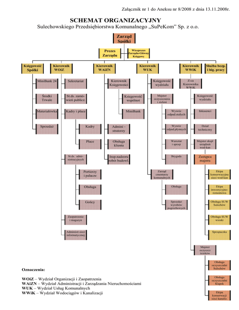 Załącznik nr 1 do Aneksu nr 8/2008 z dnia 13.11.2008r. SCHEMAT ORGANIZACYJNY Sulechowskiego Przedsiębiorstwa Komunalnego „SuPeKom” Sp. z o.o. Zarząd Spółki Wiceprezes Zarządu-Główny Księgowy Prezes Zarządu Księgowość Kierownik WOiZ Spółki Kierownik WAiZN Kierownik WUK Kierownik Księgowości MiniBank 24 Sekretariat Środki Trwałe St.ds. zamówień publicz. Księgowość wspólnot Materiałówka Kadry i płace MiniBank Sprzedaż Kierownik WWiK Służba bezp. i hig. pracy Z-ca Kierownika WWiK Księgowość wydziału Majster oczyszczania i zieleni Księgowość wydziału Wywóz odpad.stałych Inkasenci Kadry Admini stratorzy Wywóz odpad.płynnych Dział techniczny Płace Obsługa klienta Warsztat i sprzęt Majster ekspl urządzeń wod-kan Insp.nadzoru robót budowl. Brygada Zastępca majstra St.ds. administracyjnych Portierzy i palacze Zarząd cmentarzy komunalnych Ekipa konserwacyjna sieci wod-kan Obsługa Obsługa Ekipa inwestycyjnoremontowa Gońcy Sprzedaż wyrobów pogrzebowych Obsługa SUW Sulechów Zaopatrzenie i magazyn Obsługa SUW wioski Administr.sieci informatycznej Sprzątaczka Majster oczyszcz ścieków Oznaczenia: WOiZ – Wydział Organizacji i Zaopatrzenia WAiZN – Wydział Administracji i Zarządzania Nieruchomościami WUK – Wydział Usług Komunalnych WWiK – Wydział Wodociągów i Kanalizacji Obsługa oczyszczalni Sulechów Obsługa oczyszczalni Klępsk Ekipa konserwacji sieci kanaliz.