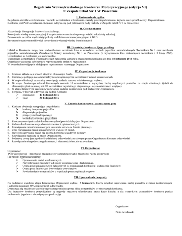 Regulamin Wewnątrzszkolnego Konkursu Motoryzacyjnego (edycja VI) w Zespole Szkół Nr 1 W Piasecznie I. Postanowienia ogólne Regulamin określa: cele konkursu, warunki uczestnictwa w konkursie, zasady przebiegu konkursu, kryteria oraz sposób oceny. Organizatorem Konkursu jest Piotr Jarosławski. Konkurs odbywa się pod patronatem Rady Szkoły w Zespole Szkół Nr 1 w Piasecznie. II. Cele konkursu Aktywizacja i integracja środowiska szkolnego. Rozwijanie wiedzy motoryzacyjnej i bezpieczeństwa ruchu drogowego wśród młodzieży szkolnej. Promowanie uczniów wyróżniających się uzdolnieniami motoryzacyjnymi i BRD. Stworzenie uczniom możliwości sprawdzenia własnej wiedzy i umiejętności. III. Uczestnicy konkursu i jego przebieg Udział w Konkursie mogą brać indywidualnie uczniowie klas w zawodzie: technik pojazdów samochodowych Technikum Nr 1 oraz mechanik pojazdów samochodowych Zasadniczej Szkoły zawodowej Nr 1 w Piasecznie (z wyłączeniem klas maturalnych technikum i 3 klasy ZSZ). Uczestnictwo w Konkursie jest dobrowolne. Warunkiem uczestnictwa w konkursie jest zgłoszenie udziału u organizatora konkursu do dnia 18 listopada 2016 roku. Organizator zastrzega sobie prawo wprowadzania zmian w regulaminie. W kwestiach nieobjętych niniejszym regulaminem rozstrzyga Organizator. IV. Organizacja konkursu Konkurs składa się z dwóch etapów: eliminacji i finału. Eliminacje polegają na samodzielnym rozwiązaniu przez uczestników zadań konkursowych. W etapie eliminacji uczestnicy rozwiązują zadania testowe wielokrotnego wyboru. Do etapu finałowego zakwalifikowanych zostanie 10 uczestników z najwyższą liczbą uzyskanych punktów na etapie eliminacji. (jeżeli do eliminacji zgłosi się mniej niż 10 uczestników wyniki tego etapu uznaje się za ostateczne i wiążące). 5. W etapie finałowym uczestnicy rozwiązują zadania konkursowe pod nadzorem Organizatora. 6. Terminy, w których odbywać się będzie Konkurs: eliminacje: 23 listopad 2016 finał: 30 listopad 2016 1. 2. 3. 4. V. Zadania konkursowe i zasady oceny prac 1. Konkurs obejmuje następujące zagadnienia: budowę i naprawę pojazdów diagnostykę pojazdów przepisy ruchu drogowego technikę kierowania pojazdami 2. Za ocenę rozwiązań zadań konkursowych odpowiedzialny jest Organizator. 3. Zadania konkursowe mają charakter testów i pytań otwartych. 4. Rozwiązania zadań konkursowych uczestnik udziela w formie pisemnej. 5. Czas rozwiązania zadań konkursowych wynosi 45 minut. 6. Przy rozwiązywaniu zadań nie można korzystać z żadnych pomocy. 7. Rozwiązania oceniane są przez Organizatora. 8. Podstawą oceny jest zgodność udzielonej odpowiedzi z ustalonym przez Organizatora kluczem odpowiedzi. 9. Rozwiązania niezgodne z regulaminem, i niesamodzielne, nie są oceniane. VI. Organizator Organizator: Piotr Jarosławski – nauczyciel przedmiotów samochodowych i przepisów ruchu drogowego Do zadań Organizatora należą: Opracowanie zadań konkursowych. Przygotowanie zawodów od strony organizacyjnej i technicznej. Ocena prac konkursowych zgłoszonych w eliminacjach konkursu i wyłonienie finalistów. Ocena prac finałowych i wyłonienie zwycięzców. Powiadomienie uczestników o wynikach poszczególnych etapów. VII. Uprawnienia i nagrody Na podstawie wyników etapu finałowego Organizator wyłoni 3 laureatów, którzy uzyskali największą liczbę punktów z zadań konkursowych i udzielili minimum 50% poprawnych odpowiedzi. Dopuszcza się możliwość zajęcia tego samego miejsca przez kilku uczestników w obu etapach konkursu. Dla laureatów konkursu przewidziane są nagrody rzeczowe ufundowane przez Radę Szkoły, a dla wszystkich uczestników konkursu punkty zachowania (zgodnie z obowiązującą punktacją). Organizator Piotr Jarosławski