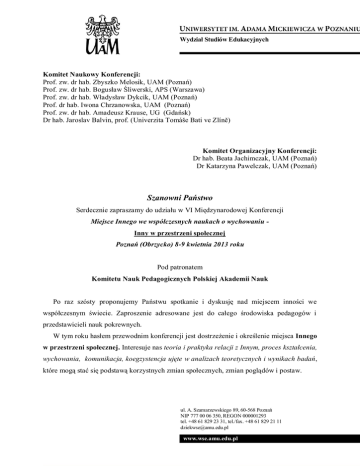 Wydział Studiów Edukacyjnych Komitet Naukowy Konferencji: Prof. zw. dr hab. Zbyszko Melosik, UAM (Poznań) Prof. zw. dr hab. Bogusław Śliwerski, APS (Warszawa) Prof. zw. dr hab. Władysław Dykcik, UAM (Poznań) Prof. dr hab. Iwona Chrzanowska, UAM (Poznań) Prof. zw. dr hab. Amadeusz Krause, UG (Gdańsk) Dr hab. Jaroslav Balvin, prof. (Univerzita Tomáše Bati ve Zlíně) Komitet Organizacyjny Konferencji: Dr hab. Beata Jachimczak, UAM (Poznań) Dr Katarzyna Pawelczak, UAM (Poznań) Szanowni Państwo Serdecznie zapraszamy do udziału w VI Międzynarodowej Konferencji Miejsce Innego we współczesnych naukach o wychowaniu Inny w przestrzeni społecznej Poznań (Obrzycko) 8-9 kwietnia 2013 roku Pod patronatem Komitetu Nauk Pedagogicznych Polskiej Akademii Nauk Po raz szósty proponujemy Państwu spotkanie i dyskusję nad miejscem inności we współczesnym świecie. Zaproszenie adresowane jest do całego środowiska pedagogów i przedstawicieli nauk pokrewnych. W tym roku hasłem przewodnim konferencji jest dostrzeżenie i określenie miejsca Innego w przestrzeni społecznej. Interesuje nas teoria i praktyka relacji z Innym, proces kształcenia, wychowania, komunikacja, koegzystencja ujęte w analizach teoretycznych i wynikach badań, które mogą stać się podstawą korzystnych zmian społecznych, zmian poglądów i postaw. ul. A. Szamarzewskiego 89, 60-568 Poznań NIP 777 00 06 350, REGON 000001293 tel. +48 61 829 23 31, tel./fax. +48 61 829 21 11 [email protected] www.wse.amu.edu.pl Wydział Studiów Edukacyjnych Chcielibyśmy, by nasze poszukiwania objęły możliwie szeroki obszar analiz i refleksji humanistycznych i społecznych, stąd proponujemy Państwu przykładowe ich zakresy: aksjologiczny i normatywny: Inność - zróżnicowane aspekty Inność osób z deficytami: poznawczymi, percepcyjnymi, fizycznymi, emocjonalnymi społeczny: Inność - perspektywa społeczna, perspektywa rodzinna Przestrzeń (nie)publiczna edukacyjny: Inność a obowiązkowe i pozaobowiązkowe kształcenie Specjalne potrzeby edukacyjne w perspektywie wyzwania, w perspektywie szansy Wspieranie i wspomaganie ucznia oraz pedagoga/nauczyciela w procesie edukacji Nie chcemy precyzyjnie narzucać Państwu konkretnych obszarów rozważań. Chcemy natomiast, by na naszej konferencji spotkali się pedagodzy, pedagodzy specjalni, psycholodzy, socjolodzy, lekarze, prawnicy, architekci, przedstawiciele władz samorządowych i Ci wszyscy, którzy w swojej pracy naukowej, działalności praktycznej i społecznej zastanawiają się nad rolą i miejscem Innego (a więc Każdego) we współczesnym społeczeństwie. Przewodnicząca Komitetu Naukowego Prof. dr hab. Iwona Chrzanowska ul. A. Szamarzewskiego 89, 60-568 Poznań NIP 777 00 06 350, REGON 000001293 tel. +48 61 829 23 31, tel./fax. +48 61 829 21 11 [email protected] www.wse.amu.edu.pl Wydział Studiów Edukacyjnych Terminarz: Zgłoszenie udziału w Konferencji na załączonym druku wraz z tematem wystąpienia należy przesłać najpóźniej do 15 lutego 2013 r. Z powodu ograniczonej liczby miejsc – decyduje kolejność zgłoszeń! Opłata za udział w Konferencji wynosi 550 złotych i obejmuje koszt jednego noclegu (8/9.04.2013) wyżywienia, uroczystej kolacji, materiałów konferencyjnych oraz publikacji. Materiały wg wskazań recenzenta (po pozytywnej ocenie) będą publikowane w czasopiśmie lub w monografii. Potwierdzeniem chęci udziału w Konferencji będzie dostarczenie organizatorom: - zgłoszenia uczestnictwa (formularz zgłoszeniowy) do 15.02.2013r., Po otrzymaniu informacji o przyjęciu zgłoszenia należy: - dosłać potwierdzenie opłaty (550 zł) na konto UAM w Poznaniu (najpóźniej do końca lutego 2012 roku), - dostarczyć tekst wystąpienia – pocztą elektroniczną lub wydruk i płyta CD – (12 Times New Roman, przypisy dolne, (najpóźniej do 30 kwietnia 2013 roku)). Tylko potwierdzone przez organizatorów zgłoszenia zostaną umieszczone w programie konferencji, zaś teksty po pozytywnej opinii Recenzenta i zgodnie z Jego sugestią zostaną opublikowane w jednej ze wskazanych wcześniej form. Zgłoszenia można przesłać pocztą na adres: lub drogą mailową: Uniwersytet Adama Mickiewicza w Poznaniu Zakład Pedagogiki Specjalnej Konferencja Miejsce Innego… ul. Szamarzewskiego 89 60- 568 Poznań [email protected] Tel. 604 123 558 Wpłaty należy dokonać: na konto bankowe UAM: BZ WBK 77 1090 1362 0000 0000 3601 7903 Prosimy koniecznie podać na przelewie: subkonto wpłat 711 103 Konferencja planowana jest od godz. 11.00 w dniu 8.04. 2013 do godz. 16.00 w dniu 9.04. 2013. Odbędzie się ona w Domu Pracy Twórczej i Wypoczynku w Obrzycku (UAM w Poznaniu), 64-510 Obrzycko, ul. Zamek1. (http://amu.edu.pl/s/_struktura/domykonferencyjne/dom-pracy-tworczej-i-wypoczynku-w-obrzycku) Dojazd PKP do stacji Szamotuły: Poznań Główny – Szamotuły: 9.45-10.25, 10.25-10.56, 11.25-11.58, ul. A. Szamarzewskiego 89, 60-568 Poznań NIP 777 00 06 350, REGON 000001293 tel. +48 61 829 23 31, tel./fax. +48 61 829 21 11 [email protected] www.wse.amu.edu.pl Wydział Studiów Edukacyjnych osoby przyjeżdżające pociągiem proszę o informację (mailem) o godzinie przybycia tak aby mógł czekać na Państwa samochód. Proszę również o potwierdzenie noclegu z 8 na 9 kwietnia i wskazanie zamówienia na posiłki wegetariańskie do dnia 15 lutego 2013. Istnieje możliwość zamówienia u organizatorów dodatkowego noclegu z 7 na 8 kwietnia (płatne dodatkowo). Serdecznie zapraszamy, z nadzieją na kolejne spotkanie! w imieniu organizatorów Przewodnicząca Komitetu Organizacyjnego dr hab. Beata Jachimczak [email protected], 604 123 558 ul. A. Szamarzewskiego 89, 60-568 Poznań NIP 777 00 06 350, REGON 000001293 tel. +48 61 829 23 31, tel./fax. +48 61 829 21 11 [email protected] www.wse.amu.edu.pl Wydział Studiów Edukacyjnych Pracownia Specjalnych Potrzeb Edukacyjnych UAM w Poznaniu Zgłoszenie uczestnictwa w konferencji Miejsce Innego we współczesnyc