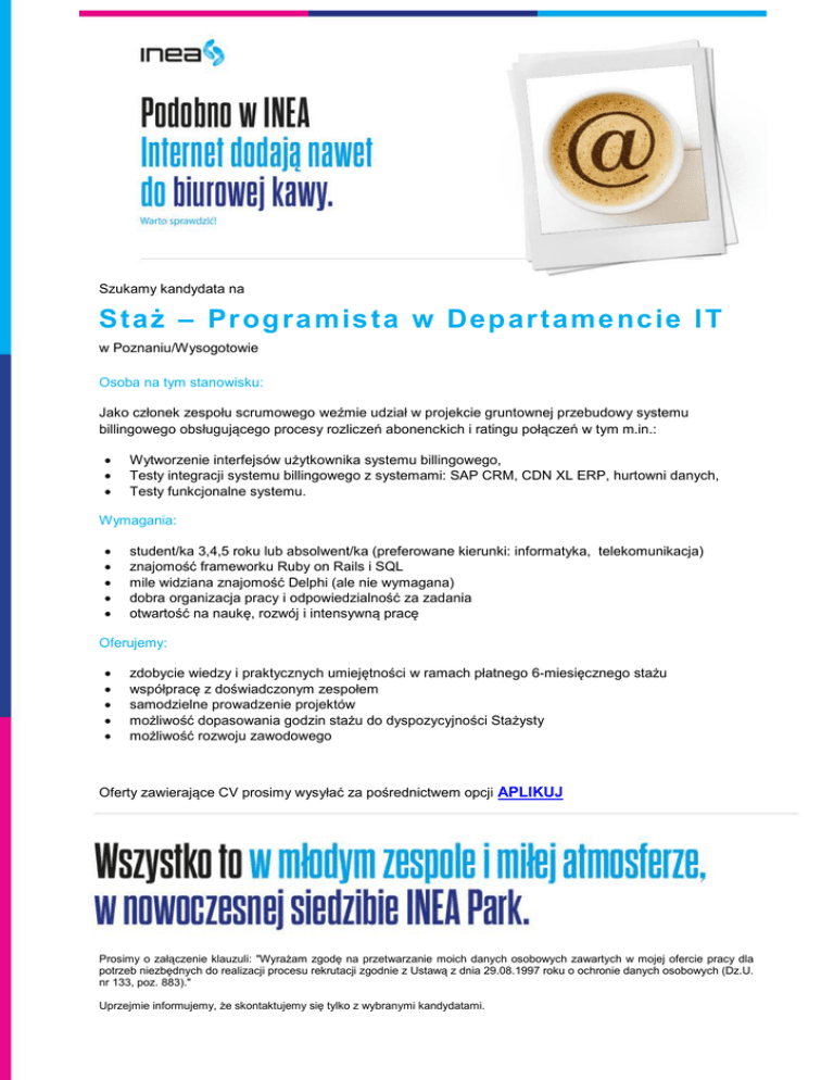 Szukamy kandydata na Staż – Pr og ra mista w Dep art ame nc ie IT w Poznaniu/Wysogotowie Osoba na tym stanowisku: Jako członek zespołu scrumowego weźmie udział w projekcie gruntownej przebudowy systemu billingowego obsługującego procesy rozliczeń abonenckich i ratingu połączeń w tym m.in.: Wytworzenie interfejsów użytkownika systemu billingowego, Testy integracji systemu billingowego z systemami: SAP CRM, CDN XL ERP, hurtowni danych, Testy funkcjonalne systemu. Wymagania: student/ka 3,4,5 roku lub absolwent/ka (preferowane kierunki: informatyka, telekomunikacja) znajomość frameworku Ruby on Rails i SQL mile widziana znajomość Delphi (ale nie wymagana) dobra organizacja pracy i odpowiedzialność za zadania otwartość na naukę, rozwój i intensywną pracę Oferujemy: zdobycie wiedzy i praktycznych umiejętności w ramach płatnego 6-miesięcznego stażu współpracę z doświadczonym zespołem samodzielne prowadzenie projektów możliwość dopasowania godzin stażu do dyspozycyjności Stażysty możliwość rozwoju zawodowego Oferty zawierające CV prosimy wysyłać za pośrednictwem opcji APLIKUJ Prosimy o załączenie klauzuli: "Wyrażam zgodę na przetwarzanie moich danych osobowych zawartych w mojej ofercie pracy dla potrzeb niezbędnych do realizacji procesu rekrutacji zgodnie z Ustawą z dnia 29.08.1997 roku o ochronie danych osobowych (Dz.U. nr 133, poz. 883)." Uprzejmie informujemy, że skontaktujemy się tylko z wybranymi kandydatami.