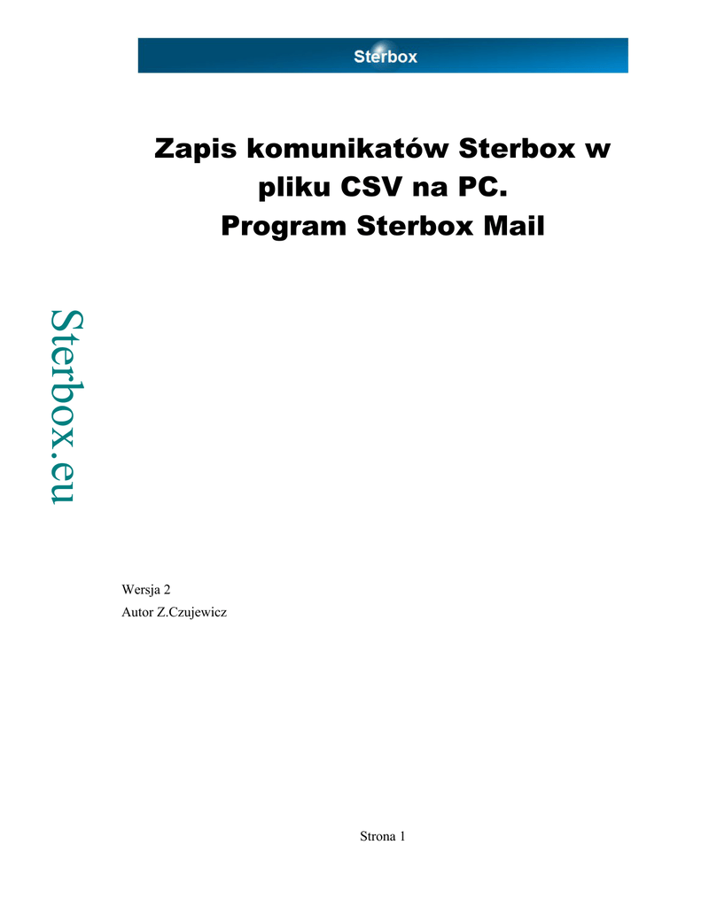 Zapis komunikatów Sterbox w pliku CSV na PC. Program Sterbox Mail Sterbox.eu Wersja 2 Autor Z.Czujewicz Strona 1 Spis treści Przeznaczenie...............................................................................................................................3 Program........................................................................................................................................3 Uruchomienie...............................................................................................................................3 Sterbox.com.pl Strona 2 Przeznaczenie. Program przeznaczony jest do współpracy z urządzeniami Sterbox. Służy do odbioru poczty i zapisu w plikach CSV. Takie pliki mogą być wczytywane do arkuszy kalkulacyjnych i baz danych. Nie należy dokonywać jakichkolwiek czynności przed przeczytaniem instrukcji! WAŻNE: Instrukcja zakłada że czytamy ją w całości. Kwestie omówione na początku nie są powtarzane w dalszej części. Kursywę użyto do oznaczenia cytatów z programu Sterbox-Mail. Instrukcja nie powtarza tematów z instrukcji urządzenia Sterbox, zachęcam do posiłkowania się nią! Sterbox.com.pl Program Sterbox-Mail i urządzenie Sterbox oraz instrukcje z nimi powiązane przeznaczone są dla osób które posiadają choćby minimalną wiedzę informatyczną, z zakresu fizyki i zdrowy rozsądek. Program. Program przeznaczony jest do użytkowania na komputerach z systemem operacyjnym Windows (XP, Vista, 7, 8 ← 32 i 64 bitowych). Program nie wymaga instalacji, można uruchamiać go np. z pendrive. Natomiast musi być dopisany do wyjątków zapory sieciowej, wyjątków innego oprogramowania zabezpieczającego. W przypadku braku komunikacji , proszę sprawdzić ustawienia zapory sieciowej i oprogramowania zabezpieczającego! Sposób postępowania znajdziecie Państwo w instrukcjach dostawców, na przykład dla zapory systemu Windows odpowiednią pomocą jest Pomoc i obsługa techniczna systemu Windows. Uruchomienie. Klikamy dwukrotnie Ikona programu Sterbox-Mail pojawi się w zasobniku. Aby zmienić ustawienia klikamy na ikonie prawym klawiszem i wybieramy Ustawienia. Wpisujemy dane skrzynki pocztowej do której Sterbox wysyła komunikaty. Interwał określa okres (w sekundach) co jaki będzie odczytywana skrzynka. W oknie Plik CSV umieszczamy nazwę pliku do którego zapisywane będą komunikaty. Dodaj datę i godzinę wpisuje do każdego wiersza datę i godzinę odbioru majla rozdzieloną separatorem. Dziel wiersz na kolejne wpisy umożliwia wysłanie pojedynczego majla ze Sterboxa który zostanie podzielony i wpisany do nowej linii po wykryciu Strona 3 Znaku podziału. Sam znak podziału nie zostanie zapisany. Na samym dole program pokazuje wyniki swojej pracy. Odczytane komunikaty zapisywane są do pliku. Plik można otworzyć w arkuszu. Lub w notatniku. Sterbox.com.pl Odbierany jest tylko temat poczty. Gdy zaznaczono Dodaj datę i godzinę są one umieszczone na początku wiersza, określone są przez moment odbioru komunikatu przez komputer . Jako znaki rozdzielające użyte są znaki wpisane w polu Separator. Dalsza część wiersza pochodzi ze Sterboxa. Jeśli tu mają się pojawić się znaki rozdzielające to trzeba je umieścić w bazie tekstów Sterboxa. Jeśli ma być podana data i godzina wysłania komunikatu ze Sterboxa, to również musimy to wpisać do bazy tekstów Sterboxa. Gdy chcemy podzielić pojedynczy majl na wiele wierszy uruchamiamy tą procedurę zaznaczeniem Dziel wiersz na kolejne wpisy. W tekście majla podajemy znak który zostanie zamieniony na znak „nowego wiersza” (hex 0D). Zawartość Nadajnika tekstu Efekt w pliku CSV mag1;55;18 mag2;68;21 Jako znaku podziału wiersza użyto itd. pionowej kreski „|”. Strona 4
