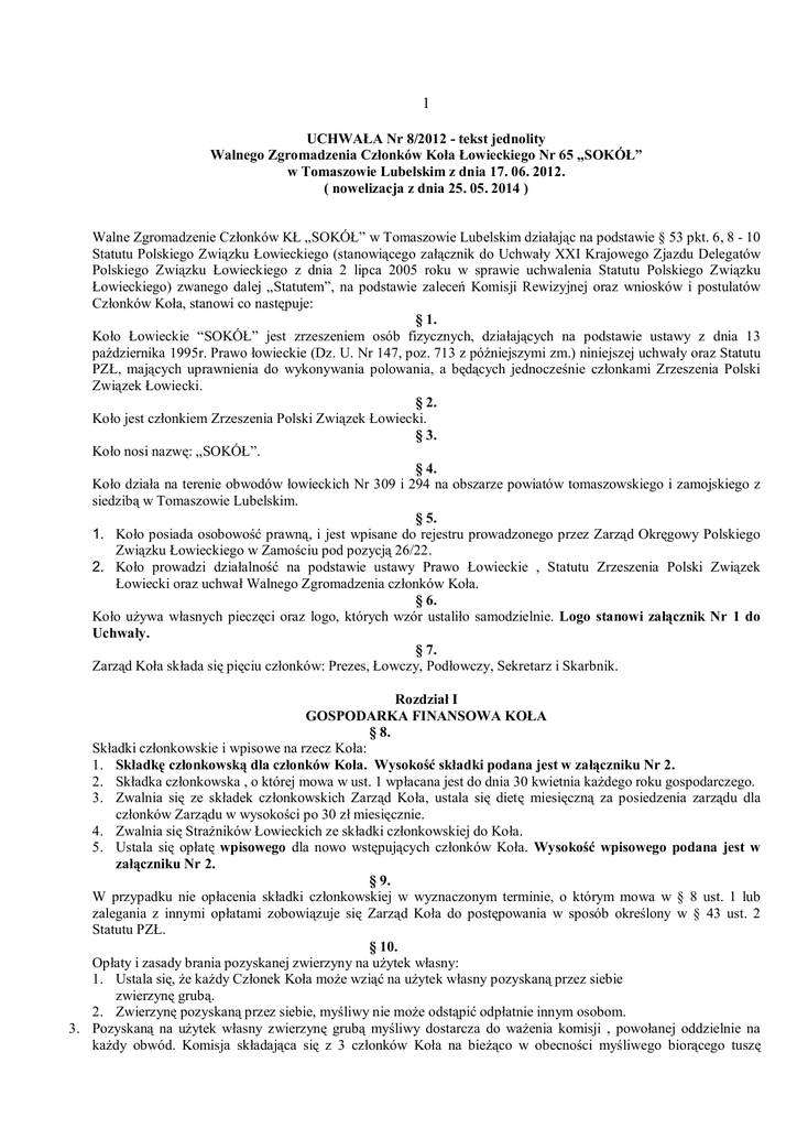 1 UCHWAŁA Nr 8/2012 - tekst jednolity Walnego Zgromadzenia Członków Koła Łowieckiego Nr 65 „SOKÓŁ” w Tomaszowie Lubelskim z dnia 17. 06. 2012. ( nowelizacja z dnia 25. 05. 2014 ) Walne Zgromadzenie Członków KŁ „SOKÓŁ” w Tomaszowie Lubelskim działając na podstawie § 53 pkt. 6, 8 - 10 Statutu Polskiego Związku Łowieckiego (stanowiącego załącznik do Uchwały XXI Krajowego Zjazdu Delegatów Polskiego Związku Łowieckiego z dnia 2 lipca 2005 roku w sprawie uchwalenia Statutu Polskiego Związku Łowieckiego) zwanego dalej „Statutem”, na podstawie zaleceń Komisji Rewizyjnej oraz wniosków i postulatów Członków Koła, stanowi co następuje: § 1. Koło Łowieckie “SOKÓŁ” jest zrzeszeniem osób fizycznych, działających na podstawie ustawy z dnia 13 października 1995r. Prawo łowieckie (Dz. U. Nr 147, poz. 713 z późniejszymi zm.) niniejszej uchwały oraz Statutu PZŁ, mających uprawnienia do wykonywania polowania, a będących jednocześnie członkami Zrzeszenia Polski Związek Łowiecki. § 2. Koło jest członkiem Zrzeszenia Polski Związek Łowiecki. § 3. Koło nosi nazwę: „SOKÓŁ”. § 4. Koło działa na terenie obwodów łowieckich Nr 309 i 294 na obszarze powiatów tomaszowskiego i zamojskiego z siedzibą w Tomaszowie Lubelskim. § 5. 1. Koło posiada osobowość prawną, i jest wpisane do rejestru prowadzonego przez Zarząd Okręgowy Polskiego Związku Łowieckiego w Zamościu pod pozycją 26/22. 2. Koło prowadzi działalność na podstawie ustawy Prawo Łowieckie , Statutu Zrzeszenia Polski Związek Łowiecki oraz uchwał Walnego Zgromadzenia członków Koła. § 6. Koło używa własnych pieczęci oraz logo, których wzór ustaliło samodzielnie. Logo stanowi załącznik Nr 1 do Uchwały. § 7. Zarząd Koła składa się pięciu członków: Prezes, Łowczy, Podłowczy, Sekretarz i Skarbnik. Rozdział I GOSPODARKA FINANSOWA KOŁA § 8. Składki członkowskie i wpisowe na rzecz Koła: 1. Składkę członkowską dla członków Koła. Wysokość składki podana jest w załączniku Nr 2. 2. Składka członkowska , o której mowa w ust. 1 wpłacana jest do dnia 30 kwietnia każdego roku gospodarczego. 3. Zwalnia się ze składek członkowskich Zarząd Koła, ustala się dietę miesięczną za posiedzenia zarządu dla członków Zarządu w wysokości po 30 zł miesięcznie. 4. Zwalnia się Strażników Łowieckich ze składki członkowskiej do Koła. 5. Ustala się opłatę wpisowego dla nowo wstępujących członków Koła. Wysokość wpisowego podana jest w załączniku Nr 2. § 9. W przypadku nie opłacenia składki członkowskiej w wyznaczonym terminie, o którym mowa w § 8 ust. 1 lub zalegania z innymi opłatami zobowiązuje się Zarząd Koła do postępowania w sposób określony w § 43 ust. 2 Statutu PZŁ. § 10. Opłaty i zasady brania pozyskanej zwierzyny na użytek własny: 1. Ustala się, że każdy Członek Koła może wziąć na użytek własny pozyskaną przez siebie zwierzynę grubą. 2. Zwierzynę pozyskaną przez siebie, myśliwy nie może odstąpić odpłatnie innym osobom. 3. Pozyskaną na użytek własny zwierzynę grubą myśliwy dostarcza do ważenia komisji , powołanej oddzielnie na każdy obwód. Komisja składająca się z 3 członków Koła na bieżąco w obecności myśliwego biorącego tuszę 2 sporządza z tej czynności protokół. Ustala się że ważenie tusz musi odbyć się przy udziale minimum 2 członków komisji. 4. Uchwala się odpłatność za pozyskaną zwierzynę grubą na użytek własny- wysokość opłat podana jest w załączniku Nr 2 5. Upoważnia się Zarząd Koła do dysponowania tuszą pozyskanej zwierzyny na cele działalności statutowej Koła oraz do wykorzystania w innych tradycyjnych imprezach łowieckich. 6. Uchwala się, że za pozyskaną zwierzynę drobną myśliwi nie wnoszą żadnych opłat. 7. Trofea zwierzyny pozyskanej przez myśliwego przechodzą na jego własność. § 11. Premia za pozyskana zwierzynę grubą i dostarczoną do punktu skupu: 1. Ustala się częściowy zwrot kosztów transportu tuszy, zwanym dalej premią, myśliwym za pozyskaną zwierzynę grubą 20% jej wartości. 2. Należność za dostarczone do weterynarii pozyskane lisy Koło wypłaca myśliwemu 3. Ustala się premię za pozyskanego lisa w wysokości 25 PLN za sztukę. Warunkiem wypłaty premii jest przedstawienie Łowczemu Koła świeżej tuszy lisa lub uszu. § 12. 1. Ustala się równoważnik pieniężny w przypadku nie wykonania prac gospodarczych na rzecz Koła o którym mowa § 19 ust. 1, pkt. a) i b). Wysokość równoważnika pieniężnego podana jest w załączniku Nr 2 2. Zobowiązuje się Zarząd Koła do rozliczenia myśliwych Koła z roboczogodzin do 31 marca każdego roku. Myśliwych Koła, którzy nie dopełnili obowiązku zawartego w § 19 ust. 1, pkt. a) i b) zobowiązuje się do uiszczenia wpłaty do kasy Koła należności za nieprzepracowane roboczogodziny do 30 kwietnia każdego roku. § 13. Inne ustalenia: 1. Upoważnia się Zarząd Koła do zakupu środków trwałych w wysokości do 5000 zł. 2. Ustala się, że rozliczenie kosztów przejazdów służbowych pojazdami prywatnymi odbywa się według 50% stawki za jeden kilometr ustalonej w odpowiednich przepisach. 3. Upoważnia się Zarząd Koła do zmian uchwalonego budżetu Koła stosownie do potrzeb wynikających z sytuacji gospodarczo – finansowej Koła. Rozdział II. ORGANIZACJA POLOWAŃ § 14 Postanowienia ogólne: 1. Upoważnienia do wykonywania polowania indywidualnego zwane dalej „odstrzałami” wydawane są na każdy obwód Koła oddzielnie. Upoważnienie wydaje Łowczy Koła, Podłowczy Koła lub inna upoważniona przez Zarząd Koła osoba. 2. Odstrzały wydawane są wszystkim członkom Koła, nie posiadającym zaległości finansowych i rzeczowych w zakresie obowiązkowych świadczeń na rzecz Koła. 3. Zarząd Koła może wyróżniać członków Koła udzieleniem odstrzałów na te gatunki zwierzyny, których nie 