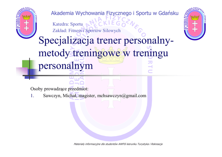 Akademia Wychowania Fizycznego i Sportu w Gdańsku Katedra: Sportu Zakład: Fitness i Sportów Silowych Specjalizacja trener personalnymetody treningowe w treningu personalnym Osoby prowadzące przedmiot: 1. Sawczyn, Michał, magister, [email protected] Materiały informacyjne dla studentów AWFiS kierunku Turystyka i Rekreacja Gibkość Grafika związana z tematem prezentacji Materiały informacyjne dla studentów AWFiS kierunku Turystyka i Rekreacja Gibkość a dynamiczny zakres ruchu Gibkość to optymalne rozciągnięcie tkanek miękkich, które pozwala na pełny zakres ruchu w stawie. Wykonanie ruchu w danym zakresie wymaga natomiast kontroli nerwowomięśniowej czyli dynamicznego zakresu ruchu (wydajności nerwowo-mięśniowej). Materiały informacyjne dla studentów AWFiS kierunku Turystyka i Rekreacja Trening gibkości Podejście do treningu gibkości powinno być wielowymiarowe, które integruje róŜne techniki rozciągania aby uzyskać optymalny zakres ruchu we wszystkich płaszczyznach. Materiały informacyjne dla studentów AWFiS kierunku Turystyka i Rekreacja Mechanizm rozciągania Gibkość jest zaleŜna w bardzo duŜej mierze od napięcia mięśni (wyłączając patologiczne stany jakim są przykurcze). Napięcie mięśni natomiast jest regulowane przez system nerwowy. Same mięśnie, więzadła i ścięgna a raczej ich długość nie są przeszkodą w budowaniu nawet bardzo duŜej gibkości. Materiały informacyjne dla studentów AWFiS kierunku Turystyka i Rekreacja Samodzielna mobilizacja stawów Termin wywodzi się z rehabilitacji. We wczesnym stadium rehabilitacji terapeuta wykonuje ruch lub pomaga go wykonać w jak największym zakresie ruchu. Samodzielna mobilizacja występuje kiedy ćwiczący wykonuje ćwiczenie sam. Ćwiczenia mobilizacyjne są często toŜsame z ćwiczeniami stretchingu dynamicznego. Materiały informacyjne dla studentów AWFiS kierunku Turystyka i Rekreacja Bibliografia 1. 2. 3. 4. 5. ACSM's Resources for the Personal Trainer (2009) Boyle M. (2010). Advances in Functional Training. On Target Publications, Santa Cruz, California Kurz T. (1997). Stretching, trening gibkości. Wyd.1 Centralny ośrodek sportu, Warszawa NASM Essentials of Personal Fitness Training (2007) Sharmann S. (2001). Diagnosis and Treatment of Movement Impairment Syndromes. Materiały informacyjne dla studentów AWFiS kierunku Turystyka i Rekreacja