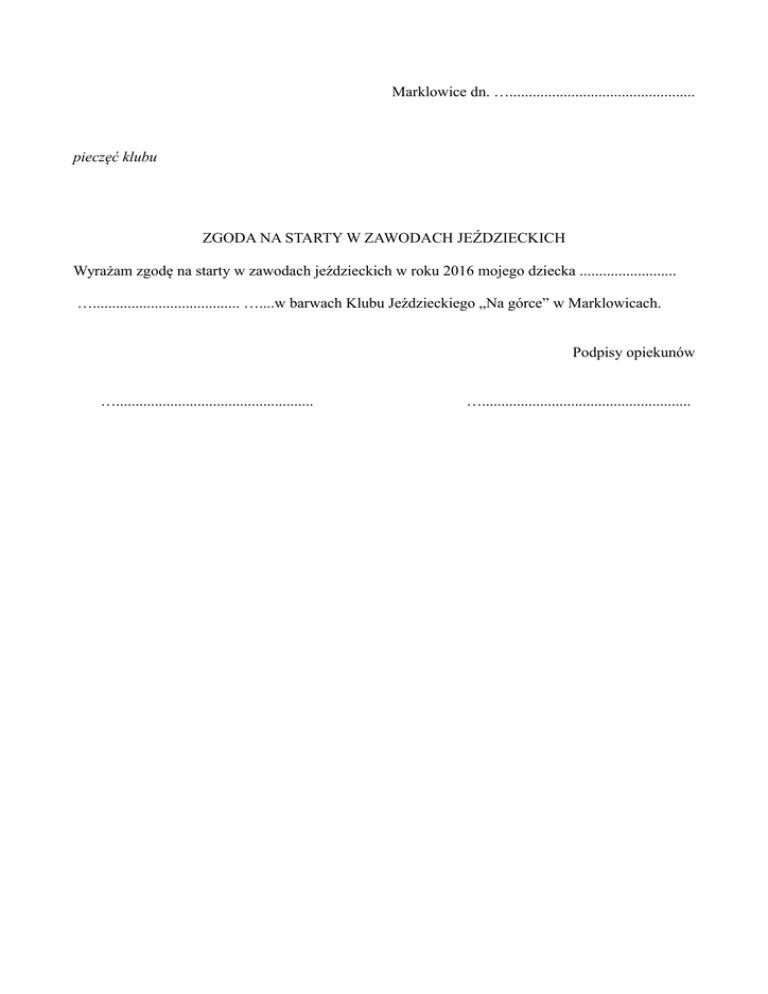 Marklowice dn. …................................................ pieczęć klubu ZGODA NA STARTY W ZAWODACH JEŹDZIECKICH Wyrażam zgodę na starty w zawodach jeździeckich w roku 2016 mojego dziecka ......................... …...................................... …....w barwach Klubu Jeździeckiego „Na górce” w Marklowicach. Podpisy opiekunów …................................................... …......................................................