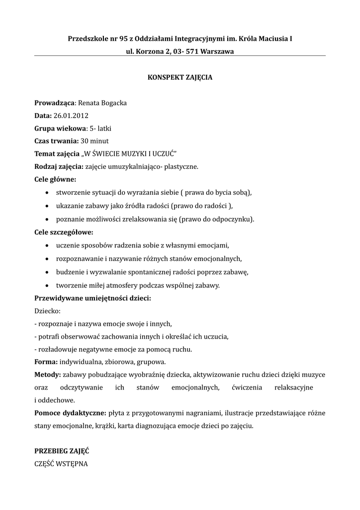 Przedszkole nr 95 z Oddziałami Integracyjnymi im. Króla Maciusia I ul. Korzona 2, 03- 571 Warszawa KONSPEKT ZAJĘCIA Prowadząca: Renata Bogacka Data: 26.01.2012 Grupa wiekowa: 5- latki Czas trwania: 30 minut Temat zajęcia „W ŚWIECIE MUZYKI I UCZUĆ” Rodzaj zajęcia: zajęcie umuzykalniająco- plastyczne. Cele główne: stworzenie sytuacji do wyrażania siebie ( prawa do bycia sobą), ukazanie zabawy jako źródła radości (prawo do radości ), poznanie możliwości zrelaksowania się (prawo do odpoczynku). Cele szczegółowe: uczenie sposobów radzenia sobie z własnymi emocjami, rozpoznawanie i nazywanie różnych stanów emocjonalnych, budzenie i wyzwalanie spontanicznej radości poprzez zabawę, tworzenie miłej atmosfery podczas wspólnej zabawy. Przewidywane umiejętności dzieci: Dziecko: - rozpoznaje i nazywa emocje swoje i innych, - potrafi obserwować zachowania innych i określać ich uczucia, - rozładowuje negatywne emocje za pomocą ruchu. Forma: indywidualna, zbiorowa, grupowa. Metody: zabawy pobudzające wyobraźnię dziecka, aktywizowanie ruchu dzieci dzięki muzyce oraz odczytywanie ich stanów emocjonalnych, ćwiczenia relaksacyjne i oddechowe. Pomoce dydaktyczne: płyta z przygotowanymi nagraniami, ilustracje przedstawiające różne stany emocjonalne, krążki, karta diagnozująca emocje dzieci po zajęciu. PRZEBIEG ZAJĘĆ CZĘŚĆ WSTĘPNA 1. Powitanie : dzieci siedzą w kole - „Iskierkę przyjaźni puszczam w krąg niech trafi do mych rąk” – przekazanie kolejno uścisku dłoni. Wszyscy stoją w kole z podanymi rękoma. „Iskierkę przyjaźni puszczam w krąg, niech wróci ona do moich rąk”. Teraz ścisnę rękę Ali, aby przesłać jej iskierkę przyjaźni. Ala zrobi to samo. Każdy kto otrzyma uścisk dłoni przekaże go następnej osobie, tak aby ta iskierka wróciła do mnie. Zaczynamy (Nauczycielka ściska dłoń Ali wypowiadając słowa: Iskierkę przyjaźni puszczam w krąg, niech wróci ona do moich rąk). 2. Zabawa wstępna: Niech wstaną Ci, którzy czują to samo co ja: - jestem szczęśliwa, gdy (przytulam się do mamy), - jestem zadowolona, kiedy (dostanę prezent), - jestem smutna, gdy (pada deszcz), - jestem zła, kiedy (ktoś na mnie krzyczy), - jestem zdziwiona, gdy …, - boję się, kiedy… CZĘŚĆ GŁÓWNA 1. Dzieci otrzymują cztery obrazki ilustrujące stany emocjonalne: zadowolenie, smutek, strach, gniew. Nauczycielka wraz z dziećmi omawia poszczególne obrazki. Następnie odtwarza dzieciom trzy fragmenty melodii o różnym charakterze: Nastrojowa muzyka (Evestar); Wesoła muzyka (Dragostea Dinte -O`zone); Tajemnicza muzyka z elementami grozy (Fuel-Metalica). W trakcie słuchania kolejnych utworów dzieci dopasowują ilustracje do muzyki. Po wykonaniu zadania następuje krótkie omówienie: - Jaką wybrałeś minę? - Dlaczego akurat tą? 2. Dzieci stają w luźnej rozsypce. Ponownie słyszą wcześniejsze fragmenty, które są nieco dłuższe, dzieci zaś ruchem i gestem będą odtwarzały nastrój muzyki: Melodia I: jestem zmęczony, ciężko mi iść, powoli kładę się i zasypiam; Melodia II: jest mi bardzo wesoło, cieszę się, bo dostałem wymarzoną zabawkę; Melodia III: jestem bardzo groźnym potworem, jestem taki zły, że mógłbym kogoś ugryźć. 3. „Mini – aerobik” (aktywizacja dzieci) przy muzyce „Feel the beat” Darude Przy brzmieniu skocznej melodii dzieci: Rytmicznie maszerują w miejscu Rozluźniają ramiona (wymachy, obroty) Rozluźniają nogi (strzepywanie, wymachy) Rozluźniają głowę i szyję (naśladowanie zegara) Luźne ruchy ciałem (Jestem z gumy) 4. Marsz po kole w rytm muzyki i adekwatnie do tempa. Podczas przerwy w muzyce dzieci zatrzymują się tworząc różne figury własnym ciałem. 5. Dzieci otrzymują krążki. Rozbiegają się po sali. Nauczyciel wyjaśnia, iż kolejno usłyszą dwa fragmenty muzyki, które będą się różniły nastrojem. I fragment – powolny, dzieci siadają na krążkach i „usypiają” w dowolny sposób II fragment – tajemniczy, nastrojowy, dzieci biorą do ręki krążki (lustra) robią do nich różne miny. 6. „W krainie robotów”. Dzieci kładą krążki na podłodze i stają na nich. Kiedy usłyszą melodię („Adelante” Sash) – będą rytmicznie poruszały się po swoim królestwie. Gdy muzyka cichnie, roboty wchodzą na krążki. 7. Dzieci odkładają krążki i dobierają się parami. Będą dla siebie lustrzanym odbiciem (dynamika ruchów zależy od rodzaju muzyki np. „Simairk”- Tarkan). ZAKOŃCZENIE- PODSUMOWANIE 1. Relaksacja przy muzyce „Sen anioła” Dzieci leżą na dywanie, zamykają oczy i wsłuchują się w muzykę. Nauczycielka wprowadza dzieci w stan rozluźnienia sugerując im miejsce w jakim się znajdują. 2. Zakończenie (ewaluacja) Na koniec zajęć dzieci otrzymują od nauczycielki „Kartę z duszkami”. Zadaniem dzieci jest pokolorowanie jednego wybranego duszka, który odpowiada za emocje jakie towarzyszyły im podczas zajęć. Po wykonaniu ćwiczenia nauczycielka omawia wraz z dziećmi zajęcie: Którego duszka wybrałeś? Jaki jest twój duszek? Czy podobały Wam się zabawy przy muzyce? Podziękowanie dzieciom za wspólną zabawę.